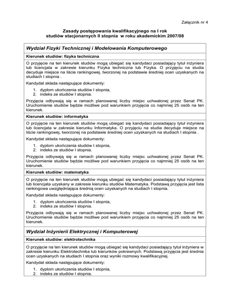 Załącznik nr 4 Zasady postępowania kwalifikacyjnego na I rok studiów stacjonarnych II stopnia w roku akademickim 2007/08 Wydział Fizyki Technicznej i Modelowania Komputerowego Kierunek studiów: fizyka techniczna O przyjęcie na ten kierunek studiów mogą ubiegać się kandydaci posiadający tytuł inŜyniera lub licencjata w zakresie kierunku Fizyka techniczna lub Fizyka. O przyjęciu na studia decyduje miejsce na liście rankingowej, tworzonej na podstawie średniej ocen uzyskanych na studiach I stopnia . Kandydat składa następujące dokumenty: 1. dyplom ukończenia studiów I stopnia, 2. indeks ze studiów I stopnia. Przyjęcia odbywają się w ramach planowanej liczby miejsc uchwalonej przez Senat PK. Uruchomienie studiów będzie moŜliwe pod warunkiem przyjęcia co najmniej 25 osób na ten kierunek. Kierunek studiów: informatyka O przyjęcie na ten kierunek studiów mogą ubiegać się kandydaci posiadający tytuł inŜyniera lub licencjata w zakresie kierunku Informatyka. O przyjęciu na studia decyduje miejsce na liście rankingowej, tworzonej na podstawie średniej ocen uzyskanych na studiach I stopnia . Kandydat składa następujące dokumenty: 1. dyplom ukończenia studiów I stopnia, 2. indeks ze studiów I stopnia. Przyjęcia odbywają się w ramach planowanej liczby miejsc uchwalonej przez Senat PK. Uruchomienie studiów będzie moŜliwe pod warunkiem przyjęcia co najmniej 25 osób na ten kierunek. Kierunek studiów: matematyka O przyjęcie na ten kierunek studiów mogą ubiegać się kandydaci posiadający tytuł inŜyniera lub licencjata uzyskany w zakresie kierunku studiów Matematyka. Podstawą przyjęcia jest lista rankingowa uwzględniająca średnią ocen uzyskanych na studiach I stopnia. Kandydat składa następujące dokumenty: 1. dyplom ukończenia studiów I stopnia, 2. indeks ze studiów I stopnia. Przyjęcia odbywają się w ramach planowanej liczby miejsc uchwalonej przez Senat PK. Uruchomienie studiów będzie moŜliwe pod warunkiem przyjęcia co najmniej 25 osób na ten kierunek. Wydział InŜynierii Elektrycznej i Komputerowej Kierunek studiów: elektrotechnika O przyjęcie na ten kierunek studiów mogą ubiegać się kandydaci posiadający tytuł inŜyniera w zakresie kierunku Elektrotechnika lub kierunków pokrewnych. Podstawą przyjęcia jest średnia ocen uzyskanych na studiach I stopnia oraz wyniki rozmowy kwalifikacyjnej. Kandydat składa następujące dokumenty: 1. dyplom ukończenia studiów I stopnia, 2. indeks ze studiów I stopnia. Przyjęcia odbywają się w ramach planowanej liczby miejsc uchwalonej przez Senat PK. Uruchomienie studiów będzie moŜliwe pod warunkiem przyjęcia co najmniej 25 osób na ten kierunek. Wydział InŜynierii Lądowej Kierunki studiów: budownictwo transport O przyjęcie na dany kierunek studiów mogą ubiegać się kandydaci posiadający tytuł inŜyniera, magistra lub magistra inŜyniera, uzyskany na tym samym lub pokrewnym kierunku studiów. Przyjęcia odbywają się na podstawie listy rankingowej. W przypadku absolwentów kierunku Budownictwo i kierunku Transport, brana jest pod uwagę średnia ocen ze studiów I stopnia. W przypadku absolwentów kierunków pokrewnych, brana jest pod uwagę średnia ocen z dotychczasowych studiów i wynik rozmowy kwalifikacyjnej. Za kierunki pokrewne uznaje się takie kierunki, na których realizowanych jest co najmniej 60% przedmiotów kierunkowych podanych w obowiązujących standardach kształcenia odpowiednio na kierunku Budownictwo i na kierunku Transport. Kandydat składa następujące dokumenty: 1. dyplom ukończenia studiów I stopnia 2. indeks ze studiów I stopnia Przyjęcia odbywają się w ramach planowanej liczby miejsc uchwalonej przez Senat PK. Uruchomienie studiów będzie moŜliwe pod warunkiem przyjęcia co najmniej 25 osób na dany kierunek. Wydział InŜynierii Środowiska Kierunek studiów: inŜynieria środowiska O przyjęcie na ten kierunek studiów mogą ubiegać się kandydaci posiadający tytuł inŜyniera inŜynierii środowiska, uzyskany w trybie studiów I stopnia na kierunku studiów InŜynieria środowiska. O przyjęcie na studia mogą równieŜ ubiegać się kandydaci posiadający tytuł inŜyniera, magistra inŜyniera, licencjata lub magistra pokrewnego kierunku studiów. Warunkiem przyjęcia tych kandydatów jest uzyskanie przez nich pozytywnego wyniku rozmowy kwalifikacyjnej. Kandydat składa następujące dokumenty: 1. dyplom ukończenia studiów I stopnia, 2. indeks ze studiów I stopnia. Przyjęcia odbywają się w ramach planowanej liczby miejsc uchwalonej przez Senat PK. Uruchomienie studiów będzie moŜliwe pod warunkiem przyjęcia co najmniej 25 osób na dany kierunek. Wydział InŜynierii i Technologii Chemicznej Kierunki studiów: inŜynieria chemiczna i procesowa technologia chemiczna O przyjęcie na dany kierunek studiów mogą ubiegać się kandydaci posiadający tytuł inŜyniera w zakresie: InŜynierii chemicznej i procesowej, Technologii chemicznej oraz kierunków pokrewnych, a takŜe kandydaci posiadający tytuł licencjata w zakresie Chemii oraz kierunków pokrewnych. Absolwent kierunku pokrewnego powinien mieć zaliczone nie mniej niŜ 60% treści wszystkich przedmiotów podstawowych i kierunkowych określonych w standardach kształcenia dla studiów I stopnia odpowiednio na kierunku InŜynieria chemiczna i procesowa lub Technologia chemiczna. Podstawą przyjęcia jest średnia ocen uzyskanych na studiach I stopnia oraz wyniki rozmowy kwalifikacyjnej. Kandydat składa następujące dokumenty: 1. dyplom ukończenia studiów I stopnia, 2. indeks ze studiów I stopnia. Przyjęcia odbywają się w ramach planowanej liczby miejsc uchwalonej przez Senat PK. Uruchomienie studiów będzie moŜliwe pod warunkiem przyjęcia co najmniej 25 osób na dany kierunek. Wydział Mechaniczny Kierunki studiów: automatyka i robotyka inŜynieria materiałowa mechanika i budowa maszyn transport zarządzanie i inŜynieria produkcji energety