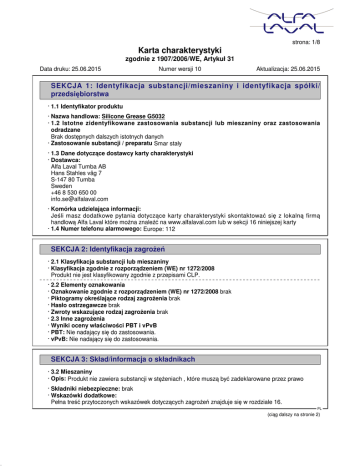41.0.10 strona: 1/8 Karta charakterystyki zgodnie z 1907/2006/WE, Artykuł 31 Data druku: 25.06.2015 Numer wersji 10 Aktualizacja: 25.06.2015 SEKCJA 1: Identyfikacja substancji/mieszaniny i identyfikacja spółki/ przedsiębiorstwa · 1.1 Identyfikator produktu · Nazwa handlowa: Silicone Grease G5032 · 1.2 Istotne zidentyfikowane zastosowania substancji lub mieszaniny oraz zastosowania odradzane Brak dostępnych dalszych istotnych danych · Zastosowanie substancji / preparatu Smar stały · 1.3 Dane dotyczące dostawcy karty charakterystyki · Dostawca: Alfa Laval Tumba AB Hans Stahles väg 7 S-147 80 Tumba Sweden +46 8 530 650 00 [email protected] · Komórka udzielająca informacji: Jeśli masz dodatkowe pytania dotyczące karty charakterystyki skontaktować się z lokalną firmą handlową Alfa Laval które można znaleźć na www.alfalaval.com lub w sekcji 16 niniejszej karty · 1.4 Numer telefonu alarmowego: Europe: 112 SEKCJA 2: Identyfikacja zagrożeń · 2.1 Klasyfikacja substancji lub mieszaniny · Klasyfikacja zgodnie z rozporządzeniem (WE) nr 1272/2008 Produkt nie jest klasyfikowany zgodnie z przepisami CLP. · 2.2 Elementy oznakowania · Oznakowanie zgodnie z rozporządzeniem (WE) nr 1272/2008 brak · Piktogramy określające rodzaj zagrożenia brak · Hasło ostrzegawcze brak · Zwroty wskazujące rodzaj zagrożenia brak · 2.3 Inne zagrożenia · Wyniki oceny właściwości PBT i vPvB · PBT: Nie nadający się do zastosowania. · vPvB: Nie nadający się do zastosowania. SEKCJA 3: Skład/informacja o składnikach · 3.2 Mieszaniny · Opis: Produkt nie zawiera substancji w stężeniach , które muszą być zadeklarowane przez prawo · Składniki niebezpieczne: brak · Wskazówki dodatkowe: Pełna treść przytoczonych wskazówek dotyczących zagrożeń znajduje się w rozdziale 16. PL (ciąg dalszy na stronie 2) 41.0.10 strona: 2/8 Karta charakterystyki zgodnie z 1907/2006/WE, Artykuł 31 Data druku: 25.06.2015 Numer wersji 10 Aktualizacja: 25.06.2015 Nazwa handlowa: Silicone Grease G5032 (ciąg dalszy od strony 1) SEKCJA 4: Środki pierwszej pomocy · 4.1 Opis środków pierwszej pomocy · Wskazówki ogólne: Środki specjalne nie są konieczne. · Po wdychaniu: Zadbać o świeże powietrze. · Po styczności ze skórą: Umyć wodą z mydłem. W przypadku trwałego podrażnienia skóry zgłosić się do lekarza. · Po styczności z okiem: Płukać oczy z otwartą powieką przez kilka minut pod bieżącą wodą. W przypadku utrzymującej się dolegliwości zasięgnąć porady lekarza. · Po przełknięciu: W PRZYPADKU POŁKNIĘCIA: wypłukać usta. NIE wywoływać wymiotów. Przy trwałych dolegliwościach porozumieć się z lekarzem. · 4.2 Najważniejsze ostre i opóźnione objawy oraz skutki narażenia Brak dostępnych dalszych istotnych danych · 4.3 Wskazania dotyczące wszelkiej natychmiastowej pomocy lekarskiej i szczególnego postępowania z poszkodowanym Brak dostępnych dalszych istotnych danych SEKCJA 5: Postępowanie w przypadku pożaru · 5.1 Środki gaśnicze · Przydatne środki gaśnicze: CO2, proszek gaśniczy lub strumień wody. Większy pożar zwalczać strumieniem wody lub pianą odporną na działanie alkoholu. · Środki gaśnicze nieprzydatne ze względów bezpieczeństwa: Nie nadający się do zastosowania. · 5.2 Szczególne zagrożenia związane z substancją lub mieszaniną Tlenek węgla i dwutlenek węgla Formaldehyd krzemionka Związki fluoru · 5.3 Informacje dla straży pożarnej · Specjalne wyposażenie ochronne: Środki specjalne nie są konieczne. · Inne dane Zagrożone zbiorniki ochłodzić strumieniem wody. SEKCJA 6: Postępowanie w przypadku niezamierzonego uwolnienia do środowiska · 6.1 Indywidualne środki ostrożności, sprzęt ochronny i procedury w sytuacjach awaryjnych Informacje na temat osobistego wyposażenia ochronnego patrz rozdział 8. · 6.2 Środki ostrożności w zakresie ochrony środowiska: Nie dopuścić do przedostania się do kanalizacji lub zbiorników wodnych. W odpowiednich pojemnikach dostarczyć do odzysku lub utylizacji. W przypadku przeniknięcia do ziemi poinformować właściwe władze. (ciąg dalszy na stronie 3) PL 41.0.10 strona: 3/8 Karta charakterystyki zgodnie z 1907/2006/WE, Artykuł 31 Data druku: 25.06.2015 Numer wersji 10 Aktualizacja: 25.06.2015 Nazwa handlowa: Silicone Grease G5032 (ciąg dalszy od strony 2) · 6.3 Metody i materiały zapobiegające rozprzestrzenianiu się skażenia i służące do usuwania skażenia: Zebrać za pomocą materiału wiążącego ciecze (piasek, ziemia okrzemkowa, materiał wiążący kwasy, materiał wiążący uniwersalny, trociny). Materiał skażony usunąć jako odpad wg punktu 13. · 6.4 Odniesienia do innych sekcji Informacje na temat bezpiecznej obsługi patrz rozdział 7. Informacje na temat osobistego wyposażenia ochronnego patrz rozdział 8. Informacje na temat utylizacji patrz rozdział 13. SEKCJ A 7: P ostępow an ie z s ubstancja mi i m ieszanina mi oraz ich magazynowanie · 7.1 Środki ostrożności dotyczące bezpiecznego postępowania Zadbać o dobry nawiew /odsysanie w miejscu pracy. Nie jeść i nie pić podczas stosowania produktu. · Wskazówki dla ochrony przeciwpożarowej i przeciwwybuchowej: Nie są potrzebne szczególne zabiegi. · 7.2 Warunki bezpiecznego magazynowania, w tym informacje dotyczące wszelkich wzajemnych niezgodności · Składowanie: · Wymagania w stosunku do pomieszczeń składowych i zbiorników: Brak szczególnych wymagań. · Wskazówki odnośnie wspólnego składowania: Nie składować w styczności ze środkami utleniającymi. · Dalsze wskazówki odnośnie warunków składowania: Brak. · 7.3 Szczególne zastosowanie(-a) końcowe Professional use only. SEKCJA 8: Kontrola narażenia/środki ochrony indywidualnej · 8.1 Parametry dotyczące kontroli · Składniki wraz z kontrolowanymi wartościami granicznymi zależnymi od miejsca pracy: Produkt nie zawiera znaczących ilości materiałów, których wartości gra
