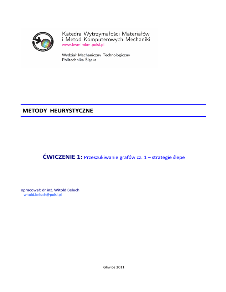 METODY HEURYSTYCZNE ĆWICZENIE 1: Przeszukiwanie grafów cz. 1 – strategie ślepe opracował: dr inż. Witold Beluch [email protected] Gliwice 2011 METODY HEURYSTYCZNE – ĆWICZENIE 1. Cel ćwiczenia Wykonując ćwiczenie zapoznasz się z jednym z dostępnych programów do tworzenia i przeszukiwania grafów i zastosujesz do wybranych problemów następujące strategie przeszukiwania: przeszukiwanie wszerz, przeszukiwanie w głąb i strategię jednolitego kosztu. Celem jest znalezienie najkrótszej drogi do celu. Celem dodatkowym jest zminimalizowanie liczby odwiedzonych węzłów. Trochę teorii... Szukanie (np. najkrótszej drogi) jest jedną z najważniejszych metod sztucznej inteligencji. Wiele praktycznych problemów może być przedstawionych w postaci zadania przeszukiwania grafu. Przeszukiwanie grafu (lub inaczej przechodzenie grafu) jest działaniem polegającym na odwiedzeniu w pewien usystematyzowany sposób wszystkich wierzchołków grafu w celu zebrania potrzebnych informacji. Do najprostszych strategii przeszukiwania należą tzw. strategie ślepe, do których zaliczają się: • przeszukiwanie wszerz; • przeszukiwanie w głąb; • strategia jednolitego kosztu; • przeszukiwanie ograniczone w głąb; • przeszukiwanie iteracyjnie pogłębiane; • przeszukiwanie dwukierunkowe. W ramach niniejszej instrukcji ograniczymy się do pierwszych trzech metod. Przeszukiwanie wszerz Strategia przeszukiwania wszerz (ang. Breadth-first search, BFS) polega na odwiedzaniu wszystkich nieodwiedzonych sąsiadów danego wierzchołka. Innymi słowy strategia wykonuje ekspansję najpłytszego węzła spośród tych, które nie były jeszcze rozszerzone. Kolejność przeszukiwania węzłów dla przykładowego grafu przedstawia Rys. 1 . Rys. 1. Algorytm przeszukiwania w głąb – kolejność przeszukiwania węzłów Lista węzłów które się już odwiedziło, musi być pamiętana, zatem złożoność pamięciowa strategii przeszukiwania wszerz wynosi O(V+ E), gdzie V jest liczbą węzłów a E liczbą krawędzi w grafie. Przeszukiwanie wszerz jest niepraktyczne dla dużych grafów właśnie ze względu na wymogi pamięciowe. Złożoność czasowa to również O(V+E), gdyż w najgorszym przypadku strategia musi przejść przez wszystkie krawędzie prowadzące do wszystkich węzłów. Gdy rozwiązanie istnieje, to strategia przeszukiwania wszerz odnajdzie je niezależnie od grafu. 2 METODY HEURYSTYCZNE – ĆWICZENIE 1. Przeszukiwanie w głąb Algorytm przeszukiwania w głąb (ang. Depth-first search, DFS) rozpoczyna przeszukiwanie się od korzenia i porusza się w dół do samego końca krawędzi, po czym wraca o jeden poziom i sprawdza kolejne krawędzie. Zatem metoda ta wykonuje rozwinięcie najgłębszego węzła spośród tych, które nie były jeszcze rozszerzone. Kolejność przeszukiwania węzłów dla przykładowego grafu przedstawia Rys. 2. Rys. 2. Algorytm przeszukiwania wszerz – kolejność przeszukiwania węzłów Złożoność pamięciowa algorytmu w przypadku drzewa jest o wiele mniejsza, niż przeszukiwania wszerz, jako że algorytm w każdym momencie wymaga zapamiętania tylko ścieżki od korzenia do bieżącego węzła. Złożoność czasowa jest taka sama jest w przypadku BFS, czyli O(V+E). Algorytm przeszukiwania w głąb dla drzew skończonych jest zupełny (zatem znajduje rozwiązanie lub informuje, że ono nie istnieje). Strategia jednolitego kosztu Strategia jednolitego kosztu (ang. uniform-cost search, UCS) wykonuje ekspansję węzła o najmniejszym koszcie spośród tych, które nie były jeszcze rozszerzone. Przeszukiwanie rozpoczyna się od węzła początkowego i jest prowadzone poprzez odwiedzanie węzłów, dla których koszt (liczony od korzenia) jest najmniejszy. Przykładowy graf wraz z zaznaczonymi kosztami dla poszczególnych krawędzi jest przedstawiony na Rys. 3. W tym przypadku kolejność działań algorytmu będzie następująca (w nawiasach podano koszt): A(0)->D (3) A(0)->B (5) A(0)->D ->E (5) A(0)->D ->F (5) A(0)->B->C (6) A(0)->D->F->G (8) Rys. 3. Strategia jednolitego kosztu: A – start, G- cel Strategia znajduje optymalne rozwiązanie, o ile koszt każdej dopuszczalnej akcji przewyższa pewną dodatnią wartość ε. Złożoność pamięciowa jak i obliczeniowa strategii to O(b1+C*/ε), gdzie C* jest kosztem rozwiązania optymalnego. 3 METODY HEURYSTYCZNE – ĆWICZENIE 1. Do wykonania Strona internetowa http://aispace.org reklamuje się jako “Narzędzia do nauki sztucznej inteligencji”. W dziale „Downloads” możesz znaleźć m.in. narzędzie służące do tworzenia i przeszukiwania grafów (Graph Searching) z zastosowaniem różnych metod przeszukiwania grafu. Poszukujemy najkrótszej z Rybnika (Rondo Gliwickie) na wydział MT. Korzystając z programu Search Applet spróbujemy taką drogę znaleźć korzystając z ślepych strategii przeszukiwania. Uruchom program Search Applet. Zapoznaj się z pomocą do programu. Korzystając z zakładki Create wygeneruj graf jak na Rys. 4. Wskazówki: • w celu wygenerowania węzłów skorzystaj z ikony Create Node; • do generowania krawędzi służy ikona Create Edge; • w celu wyświetlenia kosztów poszczególnych krawędzi (odległości) włącz View->Show Edge Costs; jeśli podczas pracy koszty krawędzi przestaną być widoczne wyłącz wspomnianą opcję i włącz ją z powrotem. Pamiętaj o zapisaniu wszystkich utworzonych na zajęciach grafów (w osobnych plikach). Mogą się jeszcze przydać... Rys. 4. Wybrane węzły i krawędzie na trasie Rybnik-MT 4 METODY HEURYSTYCZNE – ĆWICZENIE 1. Przejdź do zakładki Solve. Wybierz metodę przeszukiwania w głąb (Search Options-> Search Algorithms->Depth First). Klikaj ikonę Step zwracając uwagę na zmieniające się kolory węzłów i informacje w dolnej części okna aplikacji. Gdy algorytm zakończy pracę zanotuj w protokole (Tabela 1) znalezioną ścieżkę, koszt znalezionego rozwiązania (odległość w kilometrach) oraz li