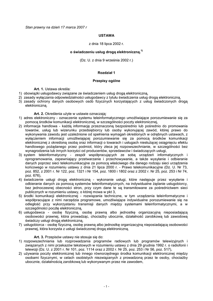 Stan prawny na dzień 17 marca 2007 r USTAWA z dnia 18 lipca 2002 r. 1) o świadczeniu usług drogą elektroniczną. (Dz. U. z dnia 9 września 2002 r.) Rozdział 1 Przepisy ogólne Art. 1. Ustawa określa: 1) obowiązki usługodawcy związane ze świadczeniem usług drogą elektroniczną, 2) zasady wyłączania odpowiedzialności usługodawcy z tytułu świadczenia usług drogą elektroniczną, 3) zasady ochrony danych osobowych osób fizycznych korzystających z usług świadczonych drogą elektroniczną. Art. 2. Określenia uŜyte w ustawie oznaczają: 1) adres elektroniczny - oznaczenie systemu teleinformatycznego umoŜliwiające porozumiewanie się za pomocą środków komunikacji elektronicznej, w szczególności poczty elektronicznej, 2) informacja handlowa - kaŜdą informację przeznaczoną bezpośrednio lub pośrednio do promowania towarów, usług lub wizerunku przedsiębiorcy lub osoby wykonującej zawód, której prawo do wykonywania zawodu jest uzaleŜnione od spełnienia wymagań określonych w odrębnych ustawach, z wyłączeniem informacji umoŜliwiającej porozumiewanie się za pomocą środków komunikacji elektronicznej z określoną osobą oraz informacji o towarach i usługach niesłuŜącej osiągnięciu efektu handlowego poŜądanego przez podmiot, który zleca jej rozpowszechnianie, w szczególności bez wynagrodzenia lub innych korzyści od producentów, sprzedawców i świadczących usługi, 3) system teleinformatyczny - zespół współpracujących ze sobą urządzeń informatycznych i oprogramowania, zapewniający przetwarzanie i przechowywanie, a takŜe wysyłanie i odbieranie danych poprzez sieci telekomunikacyjne za pomocą właściwego dla danego rodzaju sieci urządzenia końcowego w rozumieniu ustawy z dnia 21 lipca 2000 r. - Prawo telekomunikacyjne (Dz. U. Nr 73, poz. 852, z 2001 r. Nr 122, poz. 1321 i Nr 154, poz. 1800 i 1802 oraz z 2002 r. Nr 25, poz. 253 i Nr 74, poz. 676), 4) świadczenie usługi drogą elektroniczną - wykonanie usługi, które następuje przez wysyłanie i odbieranie danych za pomocą systemów teleinformatycznych, na indywidualne Ŝądanie usługobiorcy, bez jednoczesnej obecności stron, przy czym dane te są transmitowane za pośrednictwem sieci publicznych w rozumieniu ustawy, o której mowa w pkt 3, 5) środki komunikacji elektronicznej - rozwiązania techniczne, w tym urządzenia teleinformatyczne i współpracujące z nimi narzędzia programowe, umoŜliwiające indywidualne porozumiewanie się na odległość przy wykorzystaniu transmisji danych między systemami teleinformatycznymi, a w szczególności pocztę elektroniczną, 6) usługodawca - osobę fizyczną, osobę prawną albo jednostkę organizacyjną nieposiadającą osobowości prawnej, która prowadząc, chociaŜby ubocznie, działalność zarobkową lub zawodową świadczy usługi drogą elektroniczną, 7) usługobiorca - osobę fizyczną, osobę prawną albo jednostkę organizacyjną nieposiadającą osobowości prawnej, która korzysta z usługi świadczonej drogą elektroniczną. Art. 3. Przepisów ustawy nie stosuje się do: 1) rozpowszechniania lub rozprowadzania programów radiowych lub programów telewizyjnych i związanych z nimi przekazów tekstowych w rozumieniu ustawy z dnia 29 grudnia 1992 r. o radiofonii i telewizji (Dz. U. z 2001 r. Nr 101, poz. 1114 oraz z 2002 r. Nr 25, poz. 253 i Nr 56, poz. 517), 2) uŜywania poczty elektronicznej lub innego równorzędnego środka komunikacji elektronicznej między osobami fizycznymi, w celach osobistych niezwiązanych z prowadzoną przez te osoby, chociaŜby ubocznie, działalnością zarobkową lub wykonywanym przez nie zawodem, -1- 3) świadczenia przez operatora usług telekomunikacyjnych polegających na przekazywaniu danych lub sygnałów między zakończeniami sieci telekomunikacyjnej, jeŜeli przekaz ten dokonywany jest w oparciu o zasady określone w art. 12, 4) przeprowadzania rozliczeń i rozrachunków międzybankowych za pomocą elektronicznych nośników informacji, 5) wydawania i wykorzystywania kart płatniczych oraz pieniądza elektronicznego w rozumieniu ustawy z dnia 29 sierpnia 1997 r. - Prawo bankowe (Dz. U. z 2002 r. Nr 72, poz. 665, Nr 126, poz. 1070 i Nr 141, poz. 1178), 6) świadczenia usług drogą elektroniczną, jeŜeli odbywa się ono w ramach struktury organizacyjnej usługodawcy, przy czym usługa świadczona drogą elektroniczną słuŜy wyłącznie do kierowania pracą lub procesami gospodarczymi tego podmiotu. Art. 4. 1. JeŜeli ustawa wymaga uzyskania zgody usługobiorcy, to zgoda ta: 1) nie moŜe być domniemana lub dorozumiana z oświadczenia woli o innej treści, 2) moŜe być odwołana w kaŜdym czasie. 2. Usługodawca wykazuje uzyskanie zgody, o której mowa w ust. 1, dla celów dowodowych. Rozdział 2 Obowiązki usługodawcy świadczącego usługi drogą elektroniczną 1) 2) 1) 2) 3) 4) 5) Art. 5. 1. Usługodawca podaje, w sposób wyraźny, jednoznaczny i bezpośrednio dostępny poprzez system teleinformatyczny, którym posługuje się usługobiorca, informacje podstawowe określone w ust. 2-5. 2. Usługodawca podaje: adresy elektroniczne, imię, nazwisko, miejsce zamieszkania i adres albo nazwę lub firmę oraz siedzibę i adres. 3. JeŜeli usługodawcą jest przedsiębiorca, podaje on równieŜ informacje dotyczące właściwego zezwolenia i organu zezwalającego, w razie gdy świadczenie usługi wymaga, na podstawie odrębnych przepisów, takiego zezwolenia. (1) 4. Przepis ust. 3 nie narusza obowiązku określonego w art. 21 pkt 2 ustawy z dnia 2 lipca 2004 r. o swobodzie działalności gospodarczej (Dz. U. Nr 173, poz. 1807). 5. JeŜeli usługodawcą jest osoba fizyczna, której prawo do wykonywania zawodu jest uzaleŜnione od spełnienia określonych w odrębnych ustawach wymagań, podaje równieŜ: w przypadku ustanowienia pełnomocnika, jego imię, nazwisko, miejsce zamieszkania i adres albo jego nazwę lub firmę oraz siedzibę i adres, samorząd zawodowy, do któ
