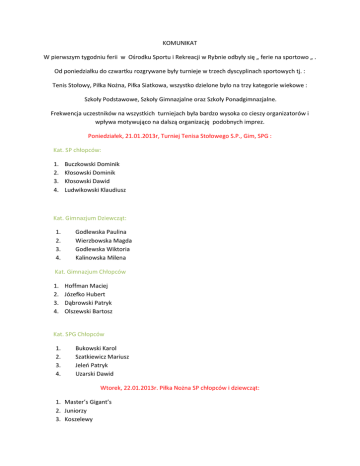 KOMUNIKAT W pierwszym tygodniu ferii w Ośrodku Sportu i Rekreacji w Rybnie odbyły się „ ferie na sportowo „ . Od poniedziałku do czwartku rozgrywane były turnieje w trzech dyscyplinach sportowych tj. : Tenis Stołowy, Piłka Nożna, Piłka Siatkowa, wszystko dzielone było na trzy kategorie wiekowe : Szkoły Podstawowe, Szkoły Gimnazjalne oraz Szkoły Ponadgimnazjalne. Frekwencja uczestników na wszystkich turniejach była bardzo wysoka co cieszy organizatorów i wpływa motywująco na dalszą organizację podobnych imprez. Poniedziałek, 21.01.2013r, Turniej Tenisa Stołowego S.P., Gim, SPG : Kat. SP chłopców: 1. 2. 3. 4. Buczkowski Dominik Kłosowski Dominik Kłosowski Dawid Ludwikowski Klaudiusz Kat. Gimnazjum Dziewcząt: 1. 2. 3. 4. Godlewska Paulina Wierzbowska Magda Godlewska Wiktoria Kalinowska Milena Kat. Gimnazjum Chłopców 1. 2. 3. 4. Hoffman Maciej Józefko Hubert Dąbrowski Patryk Olszewski Bartosz Kat. SPG Chłopców 1. 2. 3. 4. Bukowski Karol Szatkiewicz Mariusz Jeleń Patryk Uzarski Dawid Wtorek, 22.01.2013r. Piłka Nożna SP chłopców i dziewcząt: 1. Master’s Gigant’s 2. Juniorzy 3. Koszelewy 4. Koksy z podwórka Środa, 23.01.2013r., Piłka Nożna Gim, SPG Gimnazjum 1. 2. 3. 4. Tytani Betoniary Czerwone Diabły Spartanie SPG 1. Victoria 2. No Name 3. Królewscy 4. Galacticos Czwartek, Piłka Siatkowa, 24.01.2013r SP , GIM, SPG SP 1. 2. 3. Trójek Siatkarskich Rybno Dziewczęta Rybno Chłopcy I Rybno Chłopcy II Gimnazjum 1. 2. Ćwiarteczki Tytani SPG Dziewczęta 1. Hartowiec 2. Rybno SPG Chłopców 1. 2. Nigga Victoria Na zakończenie każdego turnieju we wszystkich kategoriach wiekowych uczestnicy, którzy zajmowali miejsca w pierwszej czwórce zostali nagrodzeni medalami.