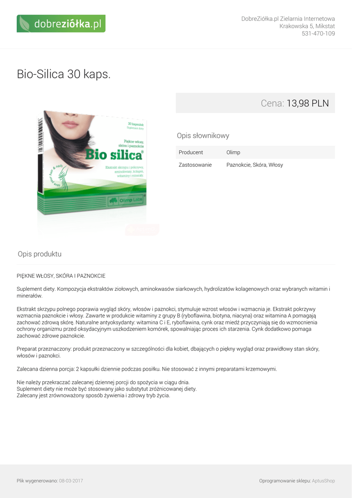 DobreZiółka.pl Zielarnia Internetowa Krakowska 5, Mikstat 531-470-109 Bio-Silica 30 kaps. Cena: 13,98 PLN Opis słownikowy Producent Olimp Zastosowanie Paznokcie, Skóra, Włosy Opis produktu PIĘKNE WŁOSY, SKÓRA I PAZNOKCIE Suplement diety. Kompozycja ekstraktów ziołowych, aminokwasów siarkowych, hydrolizatów kolagenowych oraz wybranych witamin i minerałów. Ekstrakt skrzypu polnego poprawia wygląd skóry, włosów i paznokci, stymuluje wzrost włosów i wzmacnia je. Ekstrakt pokrzywy wzmacnia paznokcie i włosy. Zawarte w produkcie witaminy z grupy B (ryboflawina, biotyna, niacyna) oraz witamina A pomagają zachować zdrową skórę. Naturalne antyoksydanty: witamina C i E, ryboflawina, cynk oraz miedź przyczyniają się do wzmocnienia ochrony organizmu przed oksydacyjnym uszkodzeniem komórek, spowalniając proces ich starzenia. Cynk dodatkowo pomaga zachować zdrowe paznokcie. Preparat przeznaczony: produkt przeznaczony w szczególności dla kobiet, dbających o piękny wygląd oraz prawidłowy stan skóry, włosów i paznokci. Zalecana dzienna porcja: 2 kapsułki dziennie podczas posiłku. Nie stosować z innymi preparatami krzemowymi. Nie należy przekraczać zalecanej dziennej porcji do spożycia w ciągu dnia. Suplement diety nie może być stosowany jako substytut zróżnicowanej diety. Zalecany jest zrównoważony sposób żywienia i zdrowy tryb życia. Plik wygenerowano: 08-03-2017 Powered by TCPDF (www.tcpdf.org) Oprogramowanie sklepu: AptusShop