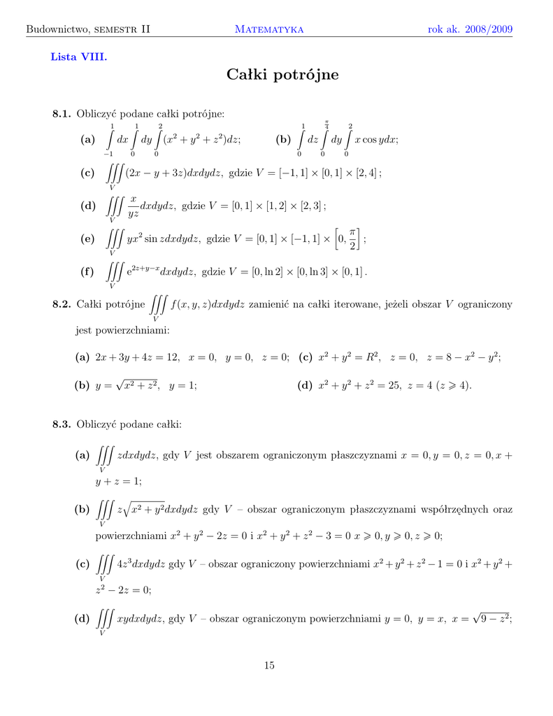 Budownictwo, semestr II rok ak. 2008/2009 Matematyka Lista VIII. Całki potrójne 8.1. Obliczyć podane całki potrójne: Z1 (a) dx −1 dy 0 ZZZ (c) Z1 Z2 2 2 2 (x + y + z )dz; (b) 0 Z1 0 π dz Z4 dy 0 Z2 x cos ydx; 0 (2x − y + 3z)dxdydz, gdzie V = [−1, 1] × [0, 1] × [2, 4] ; V ZZZ (d) V ZZZ (e) x dxdydz, gdzie V = [0, 1] × [1, 2] × [2, 3] ; yz yx2 sin zdxdydz, gdzie V = [0, 1] × [−1, 1] × 0, V ZZZ (f ) π ; 2 e2z+y−x dxdydz, gdzie V = [0, ln 2] × [0, ln 3] × [0, 1] . V 8.2. Całki potrójne ZZZ f (x, y, z)dxdydz zamienić na całki iterowane, jeżeli obszar V ograniczony V jest powierzchniami: (a) 2x + 3y + 4z = 12, x = 0, y = 0, z = 0; (c) x2 + y 2 = R2 , z = 0, z = 8 − x2 − y 2 ; (b) y = √ x2 + z 2 , y = 1; (d) x2 + y 2 + z 2 = 25, z = 4 (z 4). 8.3. Obliczyć podane całki: (a) ZZZ zdxdydz, gdy V jest obszarem ograniczonym płaszczyznami x = 0, y = 0, z = 0, x + V y + z = 1; (b) ZZZ q z x2 + y 2 dxdydz gdy V – obszar ograniczonym płaszczyznami współrzędnych oraz V powierzchniami x2 + y 2 − 2z = 0 i x2 + y 2 + z 2 − 3 = 0 x 0, y 0, z 0; (c) ZZZ 4z 3 dxdydz gdy V – obszar ograniczony powierzchniami x2 + y 2 + z 2 − 1 = 0 i x2 + y 2 + V 2 z − 2z = 0; (d) ZZZ xydxdydz, gdy V – obszar ograniczonym powierzchniami y = 0, y = x, x = V 15 √ 9 − z2; Budownictwo, semestr II (e) (f ) ZZZ V ZZZ Matematyka rok ak. 2008/2009 ydxdydz, gdy V – obszar ograniczony powierzchniami z = y, z = 0, y = 1 − x2 ; (x2 + y 2 )dxdydz, gdy V – obszar ograniczony powierzchniami z = y 2 − x2 , x = 0, y = 1, V y = x i z = 0; (g) ZZZ V z cos dxdydz, gdy V – obszar ograniczony powierzchniami y = π6 , y = x, x = π2 , z = xy, y z = 0; (h) (i) (j) (k) ZZZ V ZZZ V ZZZ V ZZZ x2 dxdydz, gdy V – obszar ograniczony powierzchniami z = 9 − x2 − y 2 , z = 0; √ (x2 + y 2 )dxdydz, gdy V – obszar ograniczony powierzchniami z = 2 x2 + y 2 , z = 8; z 2 dxdydz, gdy V – obszar ograniczony powierzchniami z = xyzdxdydz, gdy V – obszar ograniczony powierzchnią x2 + y 2 + z 2 = 4. V 8.4. Obliczyć objętości obszarów ograniczonych powierzchniami: (a) 3x + 6y + 4z = 12, x = 0, y = 0, z = 0; (b) y = x2 , y + z = 4, x = 0, z = 0; (c) y 2 + z 2 = 1, y = x, x = 0; (d) x2 + y 2 + z 2 = 16, x2 + y 2 = 4x; (e) x2 + y 2 + z 2 = 9, z = (f ) √ √ 8 − x2 − y 2 , z = x2 + y 2 ; √ x2 + y 2 ; z = 4x2 + y 2 , z = 4 − 3y 2 . 16