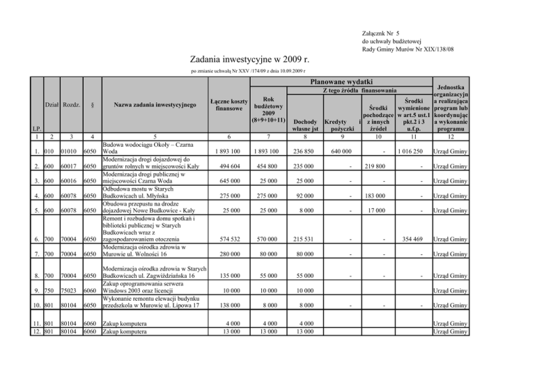 Załącznk Nr 5 do uchwały budżetowej Rady Gminy Murów Nr XIX/138/08 Zadania inwestycyjne w 2009 r. po zmianie uchwałą Nr XXV /174/09 z dnia 10.09.2009 r Planowane wydatki Jednostka organizacyjn Środki a realizująca Środki wymienione program lub pochodzące w art.5 ust.1 koordynując Dochody Kredyty i z innych pkt.2 i 3 a wykonanie własne jst pożyczki źródeł u.f.p. programu 8 9 10 11 12 Z tego źródła finansowania Dział Rozdz. LP. 1 2 3 § 4 Nazwa zadania inwestycyjnego 5 Budowa wodociągu Okoły – Czarna Woda Modernizacja drogi dojazdowej do gruntów rolnych w miejscowości Kały Modernizacja drogi publicznej w miejscowości Czarna Woda Odbudowa mostu w Starych Budkowicach ul. Młyńska Obudowa przepustu na drodze dojazdowej Nowe Budkowice - Kały Remont i rozbudowa domu spotkań i biblioteki publicznej w Starych Budkowicach wraz z zagospodarowaniem otoczenia Modernizacja ośrodka zdrowia w Murowie ul. Wolności 16 1. 010 01010 6050 2. 600 60017 6050 3. 600 60016 6050 4. 600 60078 6050 5. 600 60078 6050 6. 700 70004 6050 7. 700 70004 6050 8. 700 70004 6050 9. 750 75023 6060 10. 801 80104 6050 Modernizacja ośrodka zdrowia w Starych Budkowicach ul. Zagwiździańska 16 Zakup oprogramowania serwera Windows 2003 oraz licencji Wykonanie remontu elewacji budynku przedszkola w Murowie ul. Lipowa 17 11. 801 12. 801 80104 80104 6060 6060 Zakup komputera Zakup komputera Łączne koszty finansowe Rok budżetowy 2009 (8+9+10+11) 6 7 1 893 100 1 893 100 236 850 640 000 - 1 016 250 Urząd Gminy 494 604 454 800 235 000 - 219 800 - Urząd Gminy 645 000 25 000 25 000 - - - Urząd Gminy 275 000 275 000 92 000 - 183 000 - Urząd Gminy 25 000 25 000 8 000 - 17 000 - Urząd Gminy 574 532 570 000 215 531 - - 354 469 Urząd Gminy 280 000 80 000 80 000 - - - Urząd Gminy 135 000 55 000 55 000 - - - Urząd Gminy 10 000 10 000 10 000 138 000 8 000 8 000 4 000 13 000 4 000 13 000 4 000 13 000 Urząd Gminy - - - Urząd Gminy Urząd Gminy Urząd Gminy Planowane wydatki Dział Rozdz. § Nazwa zadania inwestycyjnego Łączne koszty finansowe Rok budżetowy 2009 (8+9+10+11) LP. 13. 801 80110 Przebudowa pomieszczeń szkolnych 6050 w Publicznym Gimnazjum w Zagwiździu 14. 900 90001 6050 15. 900 90001 6050 900 90015 6050 921 18. 926 92120 92601 6050 6060 16. 17. 441 819 Rozbudowa oczyszczalni ścieków oraz budowa kanalizacji saniatrnej w Gminie Murów Zadanie 1. Budowa kanalizacji sanitarnej Zagwiździe - II etap Zadanie 2.Dokumentacja + modernizacja i rozbudowa oczyszczalni ścieków w Murowie 10 405 719 Jednostka organizacyjn Środki a realizująca Środki wymienione program lub pochodzące w art.5 ust.1 koordynując z innych pkt.2 i 3 a wykonanie źródeł u.f.p. programu Z tego źródła finansowania 21 819 Dochody własne jst 21 819 Kredyty i pożyczki - - - Urząd Gminy 3 483 395 30 000 2 290 950 - 1 162 445 Urząd Gminy 597 800 140 300 90 000 - 367 500 Urząd Gminy 16 500 16 500 195 621 9 200 135 000 9 200 3 500 9 200 - - 131 500 RAZEM: 16 153 895 7 676 614 1 203 700 3 020 950 419 800 3 032 164 Budowa odcinka kanalizacji sanitarnej w Murowie od studzienki rozprężnej do oczyszczalni ścieków wraz z przyłączeniem nieruchomości ul. Lipowej Wykonanie trzech punktów świetlnych Zagwiździe ul. Łubniańska Remont i wyposażenie obiektu zabytkowego Huty Żelaza w Zagwiździu w przeznaczeniem na cele społecznokulturalne Zakup kosiarki 597 800 16 500 Urząd Gminy Urząd Gminy Urząd Gminy