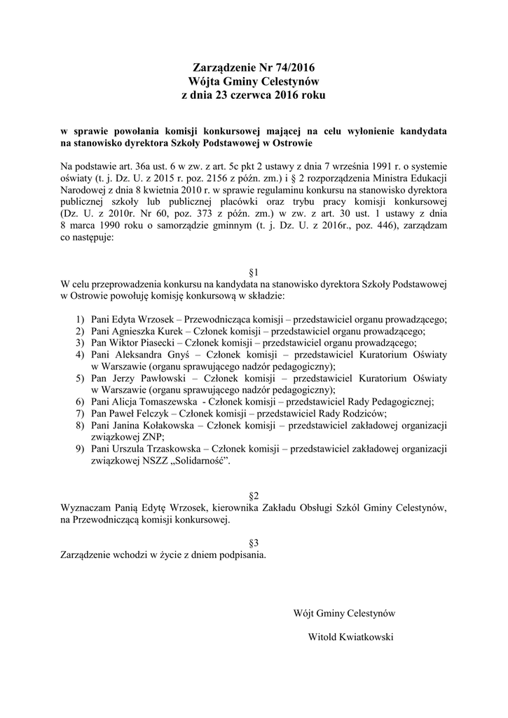 Zarządzenie Nr 74/2016 Wójta Gminy Celestynów z dnia 23 czerwca 2016 roku w sprawie powołania komisji konkursowej mającej na celu wyłonienie kandydata na stanowisko dyrektora Szkoły Podstawowej w Ostrowie Na podstawie art. 36a ust. 6 w zw. z art. 5c pkt 2 ustawy z dnia 7 września 1991 r. o systemie oświaty (t. j. Dz. U. z 2015 r. poz. 2156 z późn. zm.) i § 2 rozporządzenia Ministra Edukacji Narodowej z dnia 8 kwietnia 2010 r. w sprawie regulaminu konkursu na stanowisko dyrektora publicznej szkoły lub publicznej placówki oraz trybu pracy komisji konkursowej (Dz. U. z 2010r. Nr 60, poz. 373 z późn. zm.) w zw. z art. 30 ust. 1 ustawy z dnia 8 marca 1990 roku o samorządzie gminnym (t. j. Dz. U. z 2016r., poz. 446), zarządzam co następuje: §1 W celu przeprowadzenia konkursu na kandydata na stanowisko dyrektora Szkoły Podstawowej w Ostrowie powołuję komisję konkursową w składzie: 1) 2) 3) 4) 5) 6) 7) 8) 9) Pani Edyta Wrzosek – Przewodnicząca komisji – przedstawiciel organu prowadzącego; Pani Agnieszka Kurek – Członek komisji – przedstawiciel organu prowadzącego; Pan Wiktor Piasecki – Członek komisji – przedstawiciel organu prowadzącego; Pani Aleksandra Gnyś – Członek komisji – przedstawiciel Kuratorium Oświaty w Warszawie (organu sprawującego nadzór pedagogiczny); Pan Jerzy Pawłowski – Członek komisji – przedstawiciel Kuratorium Oświaty w Warszawie (organu sprawującego nadzór pedagogiczny); Pani Alicja Tomaszewska - Członek komisji – przedstawiciel Rady Pedagogicznej; Pan Paweł Felczyk – Członek komisji – przedstawiciel Rady Rodziców; Pani Janina Kołakowska – Członek komisji – przedstawiciel zakładowej organizacji związkowej ZNP; Pani Urszula Trzaskowska – Członek komisji – przedstawiciel zakładowej organizacji związkowej NSZZ „Solidarność”. §2 Wyznaczam Panią Edytę Wrzosek, kierownika Zakładu Obsługi Szkól Gminy Celestynów, na Przewodniczącą komisji konkursowej. §3 Zarządzenie wchodzi w życie z dniem podpisania. Wójt Gminy Celestynów Witold Kwiatkowski