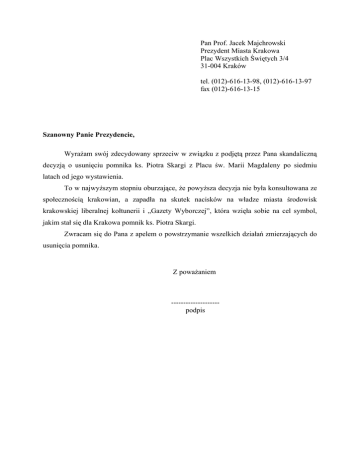 Pan Prof. Jacek Majchrowski Prezydent Miasta Krakowa Plac Wszystkich Świętych 3/4 31-004 Kraków tel. (012)-616-13-98, (012)-616-13-97 fax (012)-616-13-15 Szanowny Panie Prezydencie, Wyrażam swój zdecydowany sprzeciw w związku z podjętą przez Pana skandaliczną decyzją o usunięciu pomnika ks. Piotra Skargi z Placu św. Marii Magdaleny po siedmiu latach od jego wystawienia. To w najwyższym stopniu oburzające, że powyższa decyzja nie była konsultowana ze społecznością krakowian, a zapadła na skutek nacisków na władze miasta środowisk krakowskiej liberalnej kołtunerii i „Gazety Wyborczej”, która wzięła sobie na cel symbol, jakim stał się dla Krakowa pomnik ks. Piotra Skargi. Zwracam się do Pana z apelem o powstrzymanie wszelkich działań zmierzających do usunięcia pomnika. Z poważaniem -------------------podpis