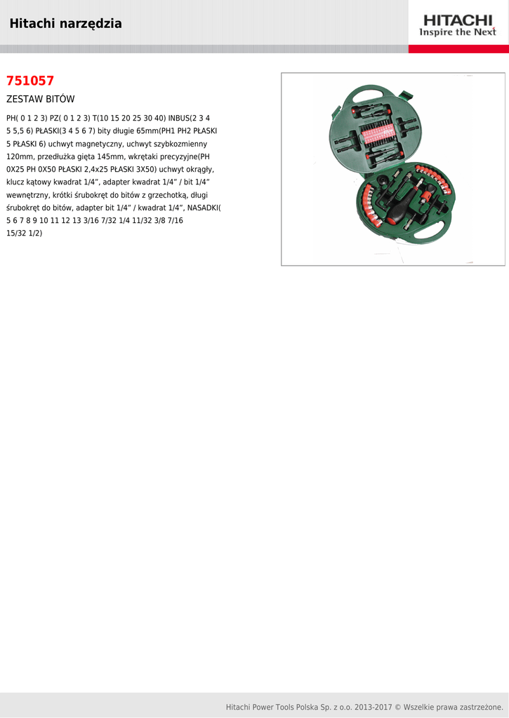 Hitachi narzędzia 751057 ZESTAW BITÓW PH( 0 1 2 3) PZ( 0 1 2 3) T(10 15 20 25 30 40) INBUS(2 3 4 5 5,5 6) PŁASKI(3 4 5 6 7) bity długie 65mm(PH1 PH2 PŁASKI 5 PŁASKI 6) uchwyt magnetyczny, uchwyt szybkozmienny 120mm, przedłużka gięta 145mm, wkrętaki precyzyjne(PH 0X25 PH 0X50 PŁASKI 2,4x25 PŁASKI 3X50) uchwyt okrągły, klucz kątowy kwadrat 1/4”, adapter kwadrat 1/4” / bit 1/4” wewnętrzny, krótki śrubokręt do bitów z grzechotką, długi śrubokręt do bitów, adapter bit 1/4” / kwadrat 1/4”, NASADKI( 5 6 7 8 9 10 11 12 13 3/16 7/32 1/4 11/32 3/8 7/16 15/32 1/2) Hitachi Power Tools Polska Sp. z o.o. 2013-2017 © Wszelkie prawa zastrzeżone.