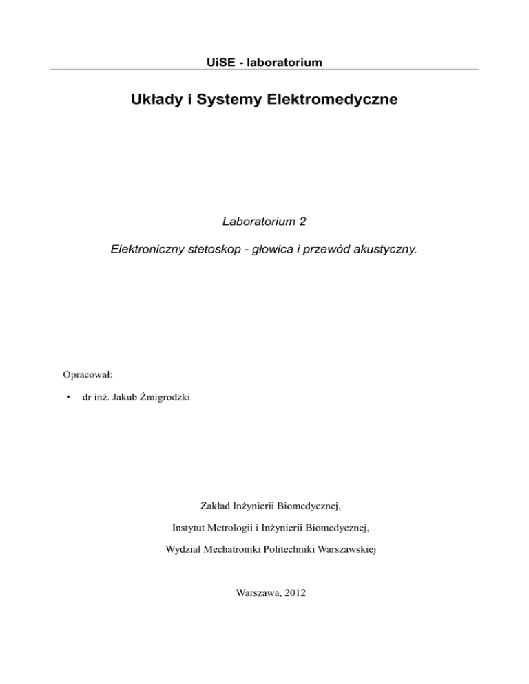 UiSE - laboratorium Układy i Systemy Elektromedyczne Laboratorium 2 Elektroniczny stetoskop - głowica i przewód akustyczny. Opracował: • dr inż. Jakub Żmigrodzki Zakład Inżynierii Biomedycznej, Instytut Metrologii i Inżynierii Biomedycznej, Wydział Mechatroniki Politechniki Warszawskiej Warszawa, 2012 UiSE laboratorium 1 Wymagane wiadomości i umiejętności 1. Podstawowe informacje na temat pomiarów wielkości elektrycznych [1]. 2. Wiadomości zawarte we wprowadzeniu do laboratorium UiSE. - 2/10 - UiSE laboratorium 2 Przebieg ćwiczenia 2.1 Aparatura Spis wykorzystywanej aparatury laboratoryjnej: 1. Uniwersalny zasilacz laboratoryjny. 2. Generator funkcyjny. 3. Oscyloskop cyfrowy. 4. Multimetr. 5. Mikrofony elektretowe przygotowane do bezpośredniego połączenia z głowicą stetoskopu (parametry techniczne mikrofonów są dostępne w dodatku „4.1 Parametry techniczne mikrofonów elektretowych wykorzystanych w ćwiczeniu” znajdującym się na str.8): ● MCE-2002 (niebieski), ● MCE-4000 (zielony). 6. Dwustronna głowica stetoskopu. 7. Generator sygnału testującego (słuchawka). 8. Uchwyt uniwersalny. 9. Komora pomiarowa. 10. Regulowany układ zasilania mikrofonu elektretowego wraz ze wzmacniaczem o regulowanym wzmocnieniu (rys.1). - 3/10 - UiSE laboratorium Rysunek 1: Schemat elektryczny regulowanego układu zasilania dla mikrofonów elektretowych oraz regulowanego wzmacniacza sygnału wejściowego. - 4/10 - UiSE laboratorium 2.2 Konfiguracja wzmacniacza Przed przystąpieniem do właściwych pomiarów należy ustawić odpowiednie parametry pracy zasilacza laboratoryjnego. W tym celu należy: • ustawić zasilacz w trybie pracy szeregowej (umożliwia to uzyskanie na wyjściach zasilacza napięcia symetrycznego), • ustawić ograniczenie prądowe obu torów zasilacza na ok. 100 mA, • ustawić wartość napięcie wyjściowego na ±15 V. Rozłączyć wszystkie zworki znajdujące się na płytce wzmacniacza. Podłączyć moduł wzmacniacza do zasilacza (zwrócić uwagę na polaryzację). Na wejście wzmacniacza P5 doprowadzić napięcie sinusoidalne o amplitudzie 200 mV i częstotliwości 1 kHz. Za pomocą czerwonego potencjometru RV3 ustawić wartość wzmocnienia na około 50 V/V (pomiarów dokonać za pomocą multimetru). Po ustawieniu żądanej wartości wzmocnienia nie należy jej zmieniać (nie kręcić czerwonym potencjometrem) w dalszych częściach ćwiczenia. 2.3 Pomiar charakterystyki amplitudowej wzmacniacza Nie zmieniając wartości amplitudy sygnału z generatora zmierzyć charakterystykę amplitudową wzmacniacza w paśmie od 10 Hz do 2,5 kHz (pomiarów dokonać za pomocą multimetru). 2.4 Pomiar charakterystyki amplitudowej mikrofonu MCE-4000 Załączyć wszystkie zworki. Ustawić oba potencjometry (zielony - RV2 i żółty – RV1) w pozycji środkowej. Podłączyć mikrofon MCE-4000 (zielony) do wejścia J1 wzmacniacza. Za pomocą potencjometru żółtego ustawić napięcie zasilania mikrofonu na 5 V (pomiar wykonać za pomocą multimetru). Podłączyć do zestawu słuchawkowego generator funkcyjny, podać przebieg sinusoidalny o amplitudzie 2 V i częstotliwości 100 Hz. Umocować mikrofon w uchwycie uniwersalnym i ustawić nad słuchawką, tak aby mikrofon znajdował się, jak najbliżej źródła dźwięku, ale nie dotykał bezpośrednio słuchawki. Całość osłonić tekturową osłoną i umieścić w miejscu, które będzie zapewniać jak najmniejszą ilość zakłóceń (np.: w postaci drgań przenoszonych przez blat stołu). Do wyjścia wzmacniacza podłączyć oscyloskop oraz multimetr. Na wyjściu wzmacniacza powinien być widoczny przebieg sinusoidalny o częstotliwości równej częstotliwości sygnału podawanego z generatora funkcyjnego. Kręcąc powoli zielonym potencjometrem RV2 dobrać taką wartość rezystan- 5/10 - UiSE laboratorium cji układu zasilania mikrofonu elektretowego, przy której uzyskuje się największą wartość sygnału na wyjściu wzmacniacza (największe wzmocnienie przedwzmacniacza). Rozłączyć zworki JP1 i JP2, a następnie zmierzyć za pomocą multimetru ustawioną wartość rezystancji drenu RL (patrz rys. 1). Następnie zewrzeć wszystkie zworki i zmierzyć charakterystykę amplitudową mikrofonu w zakresie od 30 Hz do 2,5 kHz. 2.5 Pomiar charakterystyki amplitudowej stetoskopu W tym punkcie należy zmierzyć charakterystyki amplitudowe części mechanicznej stetoskopu elektronicznego w paśmie od 30 Hz do 2,5 kHz. Podłączyć głowicę stetoskopu do mikrofonu MCE-4000 tak aby przewód akustyczny był możliwie krótki. Wszystkie następne pomiary należy wykonywać z wybranym mikrofonem. Wybrać membranę stetoskopu jako aktywną stronę głowicy i umieścić głowicę na słuchawce, a całość przykryć tekturową osłoną. Zmierzyć charakterystykę amplitudową. W analogiczny sposób przeprowadzić pomiary charakterystyki amplitudowej: • lejka stetoskopu - pozostawiając krótki przewód akustyczny, • membrany i lejka stosując długi przewód akustyczny. Określić wzmocnienie części mechanicznej stetoskopu we wszystkich zastosowanych konfiguracjach pomiarowych. Jako odniesienie wykorzystać wyniki pomiarów z pkt. 2.4. 2.6 Pomiar charakterystyki amplitudowej mikrofonu MCE-2002 Podłączyć do wzmacniacza mikrofon MCE-2002 (niebieski) i wykonać ponownie wszystkie pomiary z pkt. 2.4. - 6/10 - UiSE laboratorium 3 Sprawozdanie W sprawozdaniu umieścić i skomentować wszystkie wyniki uzyskane w punkcie 2 „Przebieg ćwiczenia”. W szczególności należy: 1. porównać i skomentować charakterystyki amplitudowe obu mikrofonów, 2. porównać i skomentować charakterystyki amplitudowe membrany oraz lejka zarówno przy długim, jak i krótkim przewodzie akustycznym – wyjaśnić źródło różnicy w charakterystykach otrzymanych przy długim i krótkim przewodzie akustycznym, - 7/10 - UiSE laboratorium 4 Dodatki 4.1 Parametry techniczne mikrofonów elektretowych wykorzystanych w ćwiczeniu 4