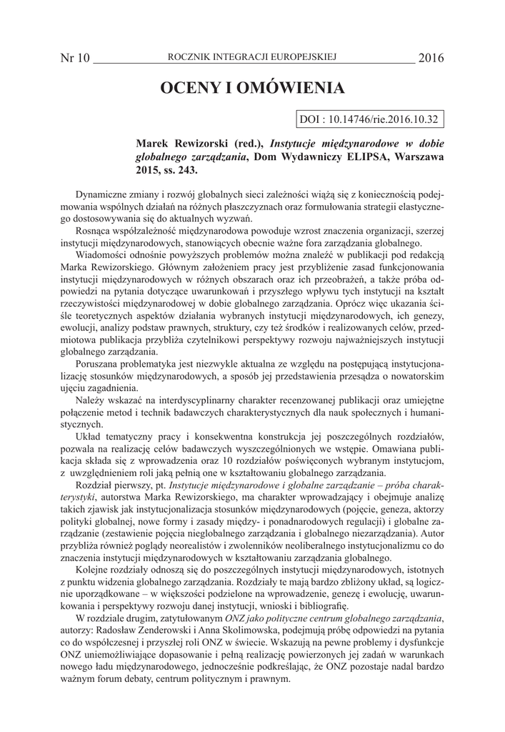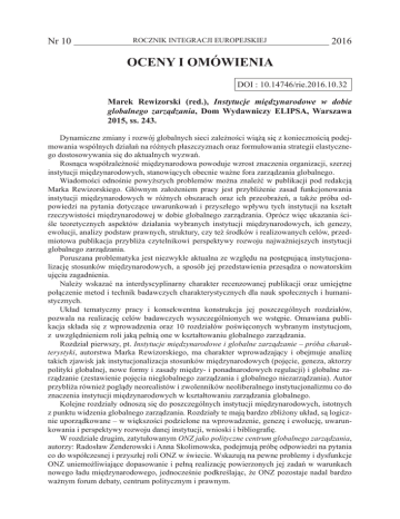 Nr 10 ROCZNIK INTEGRACJI EUROPEJSKIEJ 2016 OCENY I OMÓWIENIA DOI : 10.14746/rie.2016.10.32 Marek Rewizorski (red.), Instytucje międzynarodowe w dobie globalnego zarządzania, Dom Wydawniczy ELIPSA, Warszawa 2015, ss. 243. Dynamiczne zmiany i rozwój globalnych sieci zależności wiążą się z koniecznością podejmowania wspólnych działań na różnych płaszczyznach oraz formułowania strategii elastycznego dostosowywania się do aktualnych wyzwań. Rosnąca współzależność międzynarodowa powoduje wzrost znaczenia organizacji, szerzej instytucji międzynarodowych, stanowiących obecnie ważne fora zarządzania globalnego. Wiadomości odnośnie powyższych problemów można znaleźć w publikacji pod redakcją Marka Rewizorskiego. Głównym założeniem pracy jest przybliżenie zasad funkcjonowania instytucji międzynarodowych w różnych obszarach oraz ich przeobrażeń, a także próba odpowiedzi na pytania dotyczące uwarunkowań i przyszłego wpływu tych instytucji na kształt rzeczywistości międzynarodowej w dobie globalnego zarządzania. Oprócz więc ukazania ściśle teoretycznych aspektów działania wybranych instytucji międzynarodowych, ich genezy, ewolucji, analizy podstaw prawnych, struktury, czy też środków i realizowanych celów, przedmiotowa publikacja przybliża czytelnikowi perspektywy rozwoju najważniejszych instytucji globalnego zarządzania. Poruszana problematyka jest niezwykle aktualna ze względu na postępującą instytucjonalizację stosunków międzynarodowych, a sposób jej przedstawienia przesądza o nowatorskim ujęciu zagadnienia. Należy wskazać na interdyscyplinarny charakter recenzowanej publikacji oraz umiejętne połączenie metod i technik badawczych charakterystycznych dla nauk społecznych i humanistycznych. Układ tematyczny pracy i konsekwentna konstrukcja jej poszczególnych rozdziałów, pozwala na realizację celów badawczych wyszczególnionych we wstępie. Omawiana publikacja składa się z wprowadzenia oraz 10 rozdziałów poświęconych wybranym instytucjom, z uwzględnieniem roli jaką pełnią one w kształtowaniu globalnego zarządzania. Rozdział pierwszy, pt. Instytucje międzynarodowe i globalne zarządzanie – próba charakterystyki, autorstwa Marka Rewizorskiego, ma charakter wprowadzający i obejmuje analizę takich zjawisk jak instytucjonalizacja stosunków międzynarodowych (pojęcie, geneza, aktorzy polityki globalnej, nowe formy i zasady między- i ponadnarodowych regulacji) i globalne zarządzanie (zestawienie pojęcia nieglobalnego zarządzania i globalnego niezarządzania). Autor przybliża również poglądy neorealistów i zwolenników neoliberalnego instytucjonalizmu co do znaczenia instytucji międzynarodowych w kształtowaniu zarządzania globalnego. Kolejne rozdziały odnoszą się do poszczególnych instytucji międzynarodowych, istotnych z punktu widzenia globalnego zarządzania. Rozdziały te mają bardzo zbliżony układ, są logicznie uporządkowane – w większości podzielone na wprowadzenie, genezę i ewolucję, uwarunkowania i perspektywy rozwoju danej instytucji, wnioski i bibliografię. W rozdziale drugim, zatytułowanym ONZ jako polityczne centrum globalnego zarządzania, autorzy: Radosław Zenderowski i Anna Skolimowska, podejmują próbę odpowiedzi na pytania co do współczesnej i przyszłej roli ONZ w świecie. Wskazują na pewne problemy i dysfunkcje ONZ uniemożliwiające dopasowanie i pełną realizację powierzonych jej zadań w warunkach nowego ładu międzynarodowego, jednocześnie podkreślając, że ONZ pozostaje nadal bardzo ważnym forum debaty, centrum politycznym i prawnym. 510 Oceny i omówienia RIE 10 ’16 Następne trzy rozdziały poświęcone są instytucjom o charakterze gospodarczym: Międzynarodowemu Funduszowi Walutowemu, Bankowi Światowemu, Światowej Organizacji Handlu. Rozdział trzeci pt. Rola Międzynarodowego Funduszu Walutowego w kształtowaniu globalnego zarządzania, autorstwa Kariny Jędrzejowskiej, przedstawia bardzo trafne omówienie znaczenia MFW jako jednego z filarów globalnego zarządzania finansami, z uwzględnieniem form, jak również obszarów i zmiennych sposobów działania MFW, będących reakcją na zachodzące kryzysy finansowe. W rozdziale czwartym, pt. Rola Banku Światowego w kształtowaniu globalnego zarządzania, słusznie zwraca się uwagę na koncentrację aktywności Banku Światowego na celach prorozwojowych. Autor, Marek Wróblewski porusza istotne kwestie dotyczące m.in. instrumentów pomocowych, struktury sektorowej wsparcia BŚ, krytyki jego aktywności oraz konieczności podjęcia reform wewnętrznych. Zdzisław W. Puślecki w rozdziale piątym, poświęconym Światowej Organizacji Handlu (WTO) w kształtowaniu globalnego zarządzania, zwraca szczególną uwagę na znaczenie WTO i nowe formy globalnego zarządzania, porusza też kwestie zmian systemu płatności bezpośrednich WPR UE, bezpieczeństwa żywnościowego, zwiększenia znaczenia porozumień bilateralnych, przeciwdziałania destabilizacji cen na rynku światowym grupy G-20, polepszania integralności i transparentności instrumentów pochodnych na rynkach towarowych. W rozdziale pt. Rola OECD w kształtowaniu globalnego zarządzania. Miękki wymiar zarządzania, którego autorem jest Justyna Nakonieczna, podkreśla się szczególną rolę tej organizacji w zakresie wsparcia eksperckiego oraz organizacyjnego państw i instytucji. Rozwinięto też zagadnienia dotyczące mechanizmów działania i relacji z państwami, instytucjami i przedstawicielami społeczeństwa obywatelskiego. Kolejne trzy rozdziały poświęcone są organizacjom o charakterze regionalnym. Rozdział siódmy pt. Unia Europejska wobec wyzwań globalnego zarządzania, autorstwa Beaty Przybylskiej-Maszner, koncentruje się na analizie dynamiki zmian instytucjonalnych UE w obliczu wyzwań polityki zagranicznej. Przemysław Osiewicz w rozdziale dotyczącym Roli i znaczenia Organizacji Współprac
