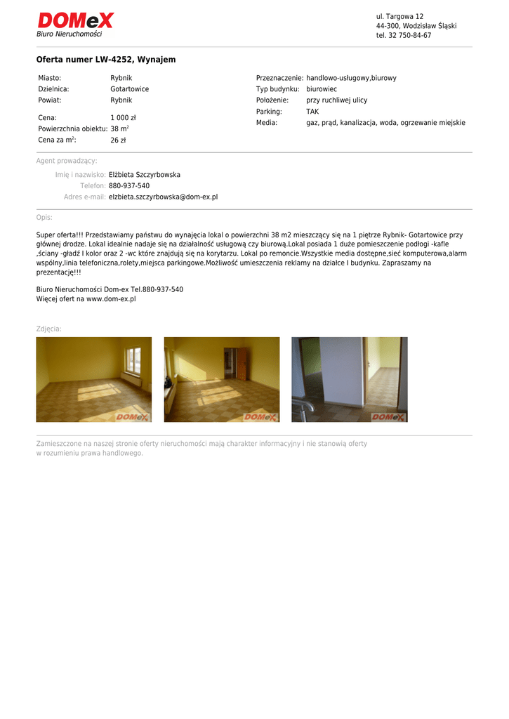ul. Targowa 12 44-300, Wodzisław Śląski tel. 32 750-84-67 Oferta numer LW-4252, Wynajem Miasto: Rybnik Przeznaczenie: handlowo-usługowy,biurowy Dzielnica: Gotartowice Typ budynku: biurowiec Powiat: Rybnik Położenie: przy ruchliwej ulicy Parking: TAK Media: gaz, prąd, kanalizacja, woda, ogrzewanie miejskie Cena: 1 000 zł Powierzchnia obiektu: 38 m2 Cena za m2: 26 zł Agent prowadzący: Imię i nazwisko: Elżbieta Szczyrbowska Telefon: 880-937-540 Adres e-mail: [email protected] Opis: Super oferta!!! Przedstawiamy państwu do wynajęcia lokal o powierzchni 38 m2 mieszczący się na 1 piętrze Rybnik- Gotartowice przy głównej drodze. Lokal idealnie nadaje się na działalność usługową czy biurową.Lokal posiada 1 duże pomieszczenie podłogi -kafle ,ściany -gładź I kolor oraz 2 -wc które znajdują się na korytarzu. Lokal po remoncie.Wszystkie media dostępne,sieć komputerowa,alarm wspólny,linia telefoniczna,rolety,miejsca parkingowe.Możliwość umieszczenia reklamy na działce I budynku. Zapraszamy na prezentację!!! Biuro Nieruchomości Dom-ex Tel.880-937-540 Więcej ofert na www.dom-ex.pl Zdjęcia: Zamieszczone na naszej stronie oferty nieruchomości mają charakter informacyjny i nie stanowią oferty w rozumieniu prawa handlowego.