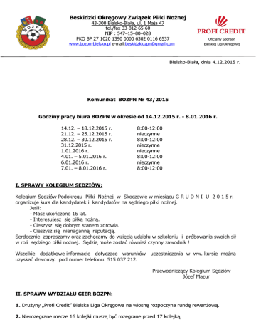 Beskidzki Okręgowy Związek Piłki Nożnej 43-300 Bielsko-Biała, ul. 1 Maja 47 tel./fax 33-812-65-60 NIP : 547–15–80–028 PKO BP 27 1020 1390 0000 6302 0116 6537 Oficjalny Sponsor www.bozpn-bielsko.pl e-mail:[email protected] Bielskiej Ligi Okręgowej Bielsko-Biała, dnia 4.12.2015 r. Komunikat BOZPN Nr 43/2015 Godziny pracy biura BOZPN w okresie od 14.12.2015 r. - 8.01.2016 r. 14.12. – 18.12.2015 r. 21.12. – 25.12.2015 r. 28.12. – 30.12.2015 r. 31.12.2015 r. 1.01.2016 r. 4.01. – 5.01.2016 r. 6.01.2016 r. 7.01. – 8.01.2016 r. 8:00-12:00 nieczynne 8:00-12:00 nieczynne nieczynne 8:00-12:00 nieczynne 8:00-12:00 I. SPRAWY KOLEGIUM SĘDZIÓW: Kolegium Sędziów Podokręgu Piłki Nożnej w Skoczowie w miesiącu G R U D N I U 2 0 1 5 r. organizuje kurs dla kandydatek i kandydatów na sędziego piłki nożnej. Jeśli: - Masz ukończone 16 lat. - Interesujesz się piłką nożną. - Cieszysz się dobrym stanem zdrowia. - Cieszysz się nienaganną reputacją. Serdecznie zapraszamy oraz zachęcamy do wzięcia udziału w szkoleniu i próbowania swoich sił w roli sędziego piłki nożnej. Sędzią może zostać również czynny zawodnik ! Wszelkie dodatkowe informacje dotyczące warunków uczestniczenia w ww. kursie można uzyskać dzwoniąc pod numer telefonu: 515 037 212. Przewodniczący Kolegium Sędziów Józef Mazur II. SPRAWY WYDZIAŁU GIER BOZPN: 1. Drużyny „Profi Credit” Bielska Liga Okręgowa na wiosnę rozpoczyna rundę rewanżową. 2. Nierozegrane mecze 16 kolejki muszą być rozegrane przed 17 kolejką. 3. Juniorzy II Ligi Wojewódzkiej A1 Juniorów Gr. 4 rozpoczną rozgrywki rewanżowe 2-3 kwietnia 2016 r. Drużyna, która zajmie pierwsze miejsce w rozgrywkach weźmie udział w barażach o awans do I Ligi w dniach 19.06.2016 r., rewanż 22.06.2016 r., dlatego wyłonienie mistrza musi nastąpić 12.06.2016 r. 4. Wszystkie rozgrywki młodzieżowe prowadzone przez BOZPN rozpoczną się na początku kwietnia. 5. Podajemy grupy rozgrywkowe w, których na wiosnę zostaną rozegrane mecz i rewanż: a. III Liga Wojewódzka B1 Juniorów Młodszych Gr. 6 BOZPN – wiosna 2016 1. KP Beskid Skoczów 2. BBTS Podbeskidzie 3. LKS Beskid Godziszka 4. GLKS Wilkowice 5. BKS Stal Bielsko-Biała Jest możliwość zgłoszenia drużyny w tym roczniku do 20.01.2016 r. W tej grupie rozgrywkowej nie ma awansów ani spadków. b. III Liga Wojewódzka D1 Młodzików Gr. 6 – rocznik 2003/2004 1. Żywiecka APN 2. RKS Cukrownik Chybie 3. LKS Czaniec 4. LKS Beskid Gilowice 5. KS Międzyrzecze 6. LKS Goleszów 7. GLKS Wilkowice W tej grupie rozgrywkowej mistrz awansuje do II Ligi Śląskiego Związku Piłki Nożnej c. III Liga Wojewódzka D2 Młodzików Gr. 6 – rocznik 2004 i młodsi 1. UKS APN Góral Istebna 2. TS Piast Cieszyn 3. LKS Zapora Porąbka 4. Lukam Skoczów 5. BTS Rekord II Bielsko-Biała 6. United Żywiec Zwycięzca awansuje do II Ligi Śląskiego Związku Piłki Nożnej Zobowiązujemy kluby do potwierdzenia udziału drużyn w danej grupie rozgrywkowej do 22.01.2016 r. Prosimy również o uaktualnienie danych kontaktowych z klubem w następującej formie: ZESPÓŁ, GRUPA ROZGRYWKOWA, NAZWISKO I IMIĘ, TEL., E-MAIL. Jeżeli jedna osoba zajmuje się kilkoma zespołami prosimy to zaznaczyć w grupie rozgrywkowej. Przewodniczący Wydział Gier BOZPN Janusz Mędrzak