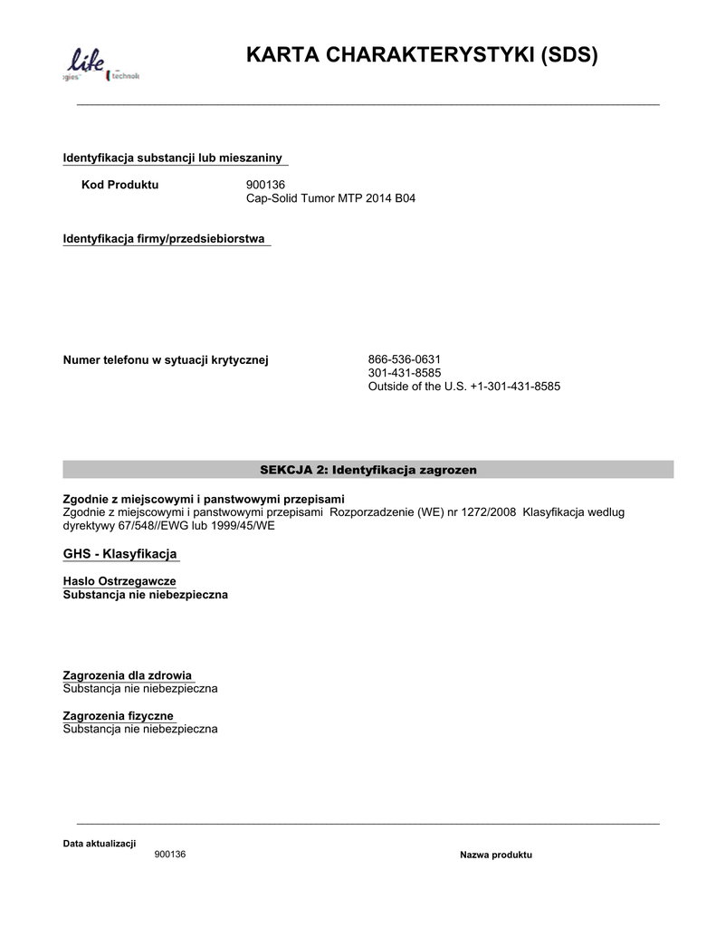 KARTA CHARAKTERYSTYKI (SDS) ________________________________________________________________________________________________________________ Identyfikacja substancji lub mieszaniny Kod Produktu 900136 Cap-Solid Tumor MTP 2014 B04 Identyfikacja firmy/przedsiebiorstwa Numer telefonu w sytuacji krytycznej 866-536-0631 301-431-8585 Outside of the U.S. +1-301-431-8585 SEKCJA 2: Identyfikacja zagrozen Zgodnie z miejscowymi i panstwowymi przepisami Zgodnie z miejscowymi i panstwowymi przepisami Rozporzadzenie (WE) nr 1272/2008 Klasyfikacja wedlug dyrektywy 67/548//EWG lub 1999/45/WE GHS - Klasyfikacja Haslo Ostrzegawcze Substancja nie niebezpieczna Zagrozenia dla zdrowia Substancja nie niebezpieczna Zagrozenia fizyczne Substancja nie niebezpieczna ________________________________________________________________________________________________________________ Data aktualizacji 900136 Nazwa produktu Unia Europejska Zwroty wskazujace na szczególne zagrozenia UE R -zdanie(a) Zaden(-a,-e) Zwroty S Zaden(-a,-e) Potencjalne skutki zdrowotne OCZY skóra wdychanie SPOZYCIE Moze dzialac drazniaco na oczy u osób wrazliwych. Moze dzialac drazniaco na skóre u osób wrazliwych. Moze dzialac szkodliwie przy wdychaniu. SUBSTANCJA MOZE BYC SZKODLIWA W PRZYPADKU SPOZYCIA. Dzialania szczególne Dzialania rakotwórcze DZIALANIA MUTAGENNE Toksycznosc rozrodcza Uczulenie Zaden(-a,-e) Zaden(-a,-e) Zaden(-a,-e) Zaden(-a,-e) Brak znanych dzialan w normalnych warunkach stosowania Dzialanie na organy docelowe SEKCJA 3: Sklad/informacja o skladnikach Niniejszy produkt nie zawiera zadnych substancji, które w podanych stezeniach uwaza sie za niebezpieczne dla zdrowia. Zalecamy obslugi wszystkich chemikaliów z ostroznoscia. SEKCJA 4: Srodki pierwszej pomocy Ostroznie plukac woda przez kilka minut. W przypadku wystapienia objawów, nalezy zasiegnac porady medycznej. Bezzwlocznie przeplukiwac duza iloscia wody przez co najmniej 15 minut, takze pod powiekami. Jesli objawy nie ustepuja, wezwac lekarza. Nigdy nie podawac niczego doustnie osobie nieprzytomnej. Jesli objawy nie ustepuja, wezwac lekarza. Nie wywolywac wymiotów bez uprzedniego zasiegniecia porady medycznej. Usunac na swieze powietrze. Jesli objawy nie ustepuja, wezwac lekarza. W przypadku braku oddychania zastosowac sztuczne oddychanie. Leczyc objawowo. Kontakt ze skóra Kontakt z oczyma SPOZYCIE wdychanie Uwagi dla lekarza SEKCJA 5: Postepowanie w przypadku pozaru Odpowiednie srodki gasnicze Specjalne wyposazenie ochronne dla strazaków Rozpylona woda. Dwutlenek wegla (CO2). Piana. Sucha substancja chemiczna. Stosowac niezalezny aparat oddechowy oraz odziez ochronna. ________________________________________________________________________________________________________________ Data aktualizacji Kod Produktu 21-Aug-2014 900136 Strona 2 / 5 Nazwa produktu Cap-Solid Tumor MTP 2014 B04 www.lifetechnologies.com SEKCJA 6: Postepowanie w przypadku niezamierzonego uwolnienia do srodowiska Indywidualne srodki ostroznosci Stosowac wyposazenie ochrony indywidualnej. Absorbowac obojetnym materialem absorbujacym. Metody usuwania Srodki ostroznosci w zakresie ochrony srodowiska O ile jest to bezpieczne, nalezy zapobiec dalszemu uwalnianiu lub wyciekaniu. Patrz: sekcja 12 po dalsze informacje. SEKCJA 7: Postepowanie z substancjami i mieszaninami oraz ich magazynowanie Unikac kontaktu ze skóra, oczami i ubraniem. Stosowac srodki ochrony osobistej. Trzymac w suchym, chlodnym i dobrze wentylowanym miejscu. Postepowanie Przechowywanie SEKCJA 8: Kontrola narazenia/srodki ochrony indywidualnej Wartosci graniczne narazenia Nie dysponujemy informacjami o jakichkolwiek krajowych limitach narazenia. Srodki techniczne Zapewnic odpowiednia wentylacje, szczególnie w miejscach zamknietych. Wyposazenie ochrony indywidualnej Wymagane srodki ochrony osobistej sa zalezne od oceny ryzyka w danej instytucji i zaleza od oceny ryzyka kazdego laboratorium gdzie dany material moze byc uzywany. Ochrona dróg oddechowych W przypadku niedostatecznej wentylacji stosowac odpowiednie indywidualne srodki ochrony dróg oddechowych. Ochrona rak Ochrona oczu Ochrona skóry i ciala Srodki higieny Srodki kontrolne narazenia srodowiska Nieprzepuszczalne rekawice. Okulary ochronne z oslonami bocznymi. lekka odziez ochronna. Postepowac zgodnie z ogólnie przyjetymi zasadami BHP. Zapobiec przedostaniu sie produktu do kanalizacji. SEKCJA 9: Wlasciwosci fizyczne i chemiczne Informacje ogólne Plyn Postac ________________________________________________________________________________________________________________ Data aktualizacji Kod Produktu 21-Aug-2014 900136 Strona 3 / 5 Nazwa produktu Cap-Solid Tumor MTP 2014 B04 www.lifetechnologies.com wyglad Zapach Temperatura wrzenia / przedzial temperatur wrzenia Temperatura topnienia / zakres temperatury topnienia Temperatura zaplonu Temperatura samozaplonu Wlasciwosci utleniajace Rozpuszczalnosc w wodzie Brak danych Brak danych °C brak danych °F brak danych °C brak danych °F brak danych °C brak danych °C Brak danych rozpuszczalny °F brak danych °F brak danych SEKCJA 10: Stabilnosc i reaktywnosc stabilnosc Materialy, których nalezy unikac Niebezpieczne produkty rozkladu Polimeryzacja Substancja stabilna w normalnych warunkach. Brak reakcji niebezpiecznych pod warunkiem normalnego uzycia. Zadne w normalnych warunkach stosowania. Nie dochodzi do niebezpiecznej polimeryzacji. SEKCJA 11: Informacje toksykologiczne Toksycznosc ostra Substancja nie niebezpieczna Potencjalne skutki zdrowotne OCZY skóra wdychanie SPOZYCIE Moze dzialac drazniaco na oczy u osób wrazliwych Moze dzialac drazniaco na skóre u osób wrazliwych Moze dzialac szkodliwie przy wdychaniu SUBSTANCJA MOZE BYC SZKODLIWA W PRZYPADKU SPOZYCIA Dzialania rakotwórcze DZIALANIA MUTAGENNE Toksycznosc rozrodcza Uczulenie Zaden(-a,-e) Zaden(-a,-e) Zaden(-a,-e) Zaden(-a,-e) Dzialanie na organy docelowe Brak znanych dzialan w normalnych warunkach stosowania SEKCJA 12: Informacje ekologiczne Brak danych Br