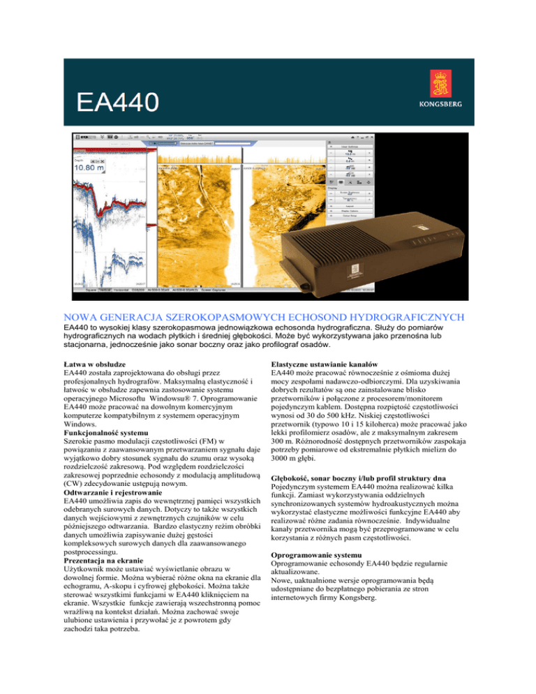 NOWA GENERACJA SZEROKOPASMOWYCH ECHOSOND HYDROGRAFICZNYCH EA440 to wysokiej klasy szerokopasmowa jednowiązkowa echosonda hydrograficzna. Służy do pomiarów hydrograficznych na wodach płytkich i średniej głębokości. Może być wykorzystywana jako przenośna lub stacjonarna, jednocześnie jako sonar boczny oraz jako profilograf osadów. Łatwa w obsłudze EA440 została zaprojektowana do obsługi przez profesjonalnych hydrografów. Maksymalną elastyczność i łatwośc w obsłudze zapewnia zastosowanie systemu operacyjnego Microsoftu Windowsu® 7. Oprogramowanie EA440 może pracować na dowolnym komercyjnym komputerze kompatybilnym z systemem operacyjnym Windows. Funkcjonalność systemu Szerokie pasmo modulacji częstotliwości (FM) w powiązaniu z zaawansowanym przetwarzaniem sygnału daje wyjątkowo dobry stosunek sygnału do szumu oraz wysoką rozdzielczość zakresową. Pod względem rozdzielczości zakresowej poprzednie echosondy z modulacją amplitudową (CW) zdecydowanie ustępują nowym. Odtwarzanie i rejestrowanie EA440 umożliwia zapis do wewnętrznej pamięci wszystkich odebranych surowych danych. Dotyczy to także wszystkich danych wejściowymi z zewnętrznych czujników w celu późniejszego odtwarzania. Bardzo elastyczny reżim obróbki danych umożliwia zapisywanie dużej gęstości kompleksowych surowych danych dla zaawansowanego postprocessingu. Prezentacja na ekranie Użytkownik może ustawiać wyświetlanie obrazu w dowolnej formie. Można wybierać różne okna na ekranie dla echogramu, A-skopu i cyfrowej głębokości. Można także sterować wszystkimi funkcjami w EA440 kliknięciem na ekranie. Wszystkie funkcje zawierają wszechstronną pomoc wrażliwą na kontekst działań. Można zachować swoje ulubione ustawienia i przywołać je z powrotem gdy zachodzi taka potrzeba. Elastyczne ustawianie kanałów EA440 może pracować równocześnie z ośmioma dużej mocy zespołami nadawczo-odbiorczymi. Dla uzyskiwania dobrych rezultatów są one zainstalowane blisko przetworników i połączone z procesorem/monitorem pojedynczym kablem. Dostępna rozpiętość częstotliwości wynosi od 30 do 500 kHz. Niskiej częstotliwości przetwornik (typowo 10 i 15 kiloherca) może pracować jako lekki profilomierz osadów, ale z maksymalnym zakresem 300 m. Różnorodność dostępnych przetworników zaspokaja potrzeby pomiarowe od ekstremalnie płytkich mielizn do 3000 m głębi. Głębokość, sonar boczny i/lub profil struktury dna Pojedynczym systemem EA440 można realizować kilka funkcji. Zamiast wykorzystywania oddzielnych synchronizowanych systemów hydroakustycznych można wykorzystać elastyczne możliwości funkcyjne EA440 aby realizować różne zadania równocześnie. Indywidualne kanały przetwornika mogą być przeprogramowane w celu korzystania z różnych pasm częstotliwości. Oprogramowanie systemu Oprogramowanie echosondy EA440 będzie regularnie aktualizowane. Nowe, uaktualnione wersje oprogramowania będą udostępniane do bezpłatnego pobierania ze stron internetowych firmy Kongsberg. PODSTAWOWE PARAMETRY EA440 jest bardzo precyzyjną echosondą hydrograficzną. • Wielorakie aplikacje: hydrografia, skanowanie boczne i lekki profilomierz osadów (SBP) • do ośmiu jednocześnie pracujących kanałów • Częstotliwość od 30 kHz do 500 kHz • Profilomierz osadów (SBP) 10 kHz oraz 15 kHz • Formy impulsów CW/FM • Łatwa instalacja na komputerach pod Windows 7 • Kompensacja wahań bocznych, wzdłużnych i pionowych • Rejestrowanie surowych danych • Światowe standardy detekcji dna A. Hydrograficzna stacja operatora (panel komputera zintegrowany z monitorem B. Zespół nad-odb (szerokopasmowy Transceiver WBT) C. Przetwornik SPECYFIKACJA TECHNICZNA Długość impulsu i maksymalna rozdzielczość • 500 kHz: CW 32 - 512 μs, FM, rozdzielczość 0.6 cm • 200 kHz: CW 64 - 1024 μs, rozdzielczość 1.2 cm • 38 kHz: CW 256 - 4096 μs, rozdzielczość 4.8 cm • 18 kHz: CW 512 - 8192 μs, rozdzielczość 9.8 cm • 12 kHz: CW: 1 - 16 ms, rozdzielczość 19.6 cm Zakresy • Zakres wskaźnika: 1 do 12,500 metrów • Zakres przetwornika: 30 do 500 kHz oraz SBP Częstość pingowania • Maximum 20 na sekundę Prędkość dźwięku • Ręcznie (1400 do 1700 m/s) • Kalkulowana z temperatury i zasolenia • Kalkulowana z czujnika temperatury i zasolenia • Odczyt z sondy prędkości dźwięku Interfejsy • Transceiver: komunikacja przez Ethernet • Opcjonalne interfejsy: • Ethernet do sieci statkowej • Sensory: GPS, żyrokompas, czujnik ruchu, log prędkości, temperatura oraz prędkość dźwięku • Formaty eksportu plików: patrz specyfikacja interfejsów • Wyjście głębokości: patrz specyfikacja interfejsów • Zdalne sterowanie: zdalny start/stop logowania dostępny z sieci lub łącza szeregowego Interfejs użytkownika • System operacyjny: Microsoft® Windows® 7 Specyfikacja może ulec zmianie bez uprzedzenia. • Główne sterowania: mysz albo manipulator kulkowy na systemie menu • Języki menu: angielski, francuski, islandzki, norweski, hiszpański Obsługiwane formaty datagramów dla wyj. głębokości: DBS, DBT, DPT, Simrad, Atlas oraz Hymas Formaty eksportu plików: Raw data, xtf, SEG-Y, xyz, echogram oraz format EA400 Ciężar oraz wymiary zewnętrzne Jednostka zespołu nad-odb: • Typ: Szerokopasmowy transceiver (WBT) • Wymiary zewnętrzne • Głębokość: 213 mm • Szerokość: 438 mm • Wysokość: 84 mm • Ciężar: około 5 kg Power specifications Zespół nad-odb: • Typ: Szerokopasmowy transceiver (WBT) • Napięcie: 12 do 15 Vdc, 5A Z echosondą EA440 dostarczany jest odpowiedni zasilacz sieciowy 230/115 V AC. Warunki środowiskowe Zespół nad-odb: • Typ: Szerokopasmowy transceiver (WBT) o • Temperatura pracy: 0 do +50 C o • Temperatura przechowywania: –40 do +70 C • Nie kondensowana wilgotność względna: 5 to 95%