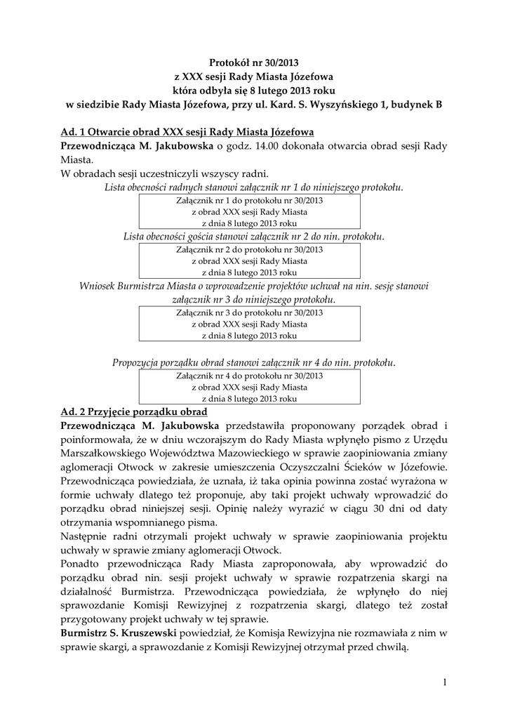 Protokół nr 30/2013 z XXX sesji Rady Miasta Józefowa która odbyła się 8 lutego 2013 roku w siedzibie Rady Miasta Józefowa, przy ul. Kard. S. Wyszyńskiego 1, budynek B Ad. 1 Otwarcie obrad XXX sesji Rady Miasta Józefowa Przewodnicząca M. Jakubowska o godz. 14.00 dokonała otwarcia obrad sesji Rady Miasta. W obradach sesji uczestniczyli wszyscy radni. Lista obecności radnych stanowi załącznik nr 1 do niniejszego protokołu. Załącznik nr 1 do protokołu nr 30/2013 z obrad XXX sesji Rady Miasta z dnia 8 lutego 2013 roku Lista obecności gościa stanowi załącznik nr 2 do nin. protokołu. Załącznik nr 2 do protokołu nr 30/2013 z obrad XXX sesji Rady Miasta z dnia 8 lutego 2013 roku Wniosek Burmistrza Miasta o wprowadzenie projektów uchwał na nin. sesję stanowi załącznik nr 3 do niniejszego protokołu. Załącznik nr 3 do protokołu nr 30/2013 z obrad XXX sesji Rady Miasta z dnia 8 lutego 2013 roku Propozycja porządku obrad stanowi załącznik nr 4 do nin. protokołu. Załącznik nr 4 do protokołu nr 30/2013 z obrad XXX sesji Rady Miasta z dnia 8 lutego 2013 roku Ad. 2 Przyjęcie porządku obrad Przewodnicząca M. Jakubowska przedstawiła proponowany porządek obrad i poinformowała, że w dniu wczorajszym do Rady Miasta wpłynęło pismo z Urzędu Marszałkowskiego Województwa Mazowieckiego w sprawie zaopiniowania zmiany aglomeracji Otwock w zakresie umieszczenia Oczyszczalni Ścieków w Józefowie. Przewodnicząca powiedziała, że uznała, iż taka opinia powinna zostać wyrażona w formie uchwały dlatego też proponuje, aby taki projekt uchwały wprowadzić do porządku obrad niniejszej sesji. Opinię należy wyrazić w ciągu 30 dni od daty otrzymania wspomnianego pisma. Następnie radni otrzymali projekt uchwały w sprawie zaopiniowania projektu uchwały w sprawie zmiany aglomeracji Otwock. Ponadto przewodnicząca Rady Miasta zaproponowała, aby wprowadzić do porządku obrad nin. sesji projekt uchwały w sprawie rozpatrzenia skargi na działalność Burmistrza. Przewodnicząca powiedziała, że wpłynęło do niej sprawozdanie Komisji Rewizyjnej z rozpatrzenia skargi, dlatego też został przygotowany projekt uchwały w tej sprawie. Burmistrz S. Kruszewski powiedział, że Komisja Rewizyjna nie rozmawiała z nim w sprawie skargi, a sprawozdanie z Komisji Rewizyjnej otrzymał przed chwilą. 1 Radny P. Kołodziej zaproponował, aby na nin. sesji nie rozpatrywać skargi, gdyż jego zdaniem sprawa nie została dobrze przygotowana przez Komisję Rewizyjną. W związku z powyższym przewodnicząca M. Jakubowska powiedziała, że wycofuje swoją propozycję odnośnie wprowadzenia do porządku obrad projektu uchwały w sprawie rozpatrzenia skargi. Przewodnicząca poddała pod głosowanie wprowadzenie do porządku obrad projektu uchwały w sprawie zaopiniowania projektu uchwały w sprawie zmiany aglomeracji Otwock (jako pkt 18, kolejne ulegają przenumerowaniu). Rada Miasta w pełnym składzie jednogłośnie zaakceptowała powyższą propozycję. Przewodnicząca M. Jakubowska poddała pod głosowanie porządek obrad. Rada Miasta w pełnym składzie jednogłośnie zatwierdziła porządek obrad niniejszej sesji. Porządek obrad: 1. 2. 3. 4. Otwarcie obrad XXX sesji Rady Miasta Józefowa. Przyjęcie porządku obrad. Przyjęcie protokołu z obrad XXIX sesji Uchwała zmieniająca uchwałę Nr 244/VI/2012 Rady Miasta Józefowa z dnia 18 grudnia 2012 roku w sprawie Wieloletniej Prognozy Finansowej Miasta Józefowa na lata 2013-2024. 5. Uchwała w sprawie zmian w uchwale budżetowej Miasta Józefowa na 2013 rok. 6. Uchwała zmieniająca uchwałę w sprawie zaciągnięcia pożyczki długoterminowej w Wojewódzkim Funduszu Ochrony Środowiska i Gospodarki Wodnej w Warszawie. 7. Uchwała w sprawie udzielenia pomocy rzeczowej z zakresu powiatowych dróg publicznych. 8. Uchwała w sprawie regulaminu utrzymania czystości i porządku na terenie miasta Józefowa. 9. Uchwała w sprawie zatwierdzenia miejscowego planu zagospodarowania przestrzennego miasta Józefowa. 10. Uchwała w sprawie zatwierdzenia miejscowego planu zagospodarowania przestrzennego miasta Józefowa dla terenu w rejonie ul. Polnej, Piłsudskiego, Wyszyńskiego, Parkowej, Sosnowej, Leśnej, Świderskiej i Ogrodowej. 11. Uchwała w sprawie nabycia do zasobu nieruchomości Gminy Miasta Józefowa prawa własności nieruchomości gruntowej Położonej w Józefowie w liniach rozgraniczających drogi bez nazwy (dz. ew. nr 156/2 i 159/2 w obr. 4). 12. Uchwała w sprawie zmiany uchwały w sprawie programu gospodarowania mieszkaniowym zasobem Miasta Józefowa na lata 2009-2013. 13. Uchwała w sprawie zmiany uchwały w sprawie nadania statutu Samodzielnemu Publicznemu Zakładowi Opieki Zdrowotnej Przychodnia Miejska w Józefowie. 2 14. Uchwała w sprawie uchwalenia planu pracy Rady Miasta Józefowa na 2013 rok. 15. Sprawozdania z pracy komisji Rady Miasta Józefowa w 2012 roku. 16. Plany pracy komisji Rady Miasta Józefowa na rok 2013. 17. Protokół Komisji Rewizyjnej z kontroli wydatków związanych z zasiłkami wypłaconymi z budżetu gminy 18. Uchwała w sprawie zaopiniowania projektu uchwały w sprawie zmiany aglomeracji Otwock 19. Informacja Przewodniczącego Rady Miasta Józefowa. 20. Informacja Burmistrza Miasta Józefowa o podejmowaniu działań w ostatnim okresie. 21. Wnioski i interpelacje radnych. 22. Wolne wnioski. 23. Zakończenie obrad XXX sesji Rady Miasta Józefowa Przewodnicząca M. Jakubowska zaproponowała następujący skład Komisji Skrutacyjnej: radna Anna Masik i radny Jacek Sekuła. Wyżej wymienieni wyrazili zgodę na udział w pracach komisji. Ad. 3 Przyjęcie protokołu z obrad XXIX sesji Przewodnicząca M. Jakubowska poddała pod głosowanie protokół nr 29/2012. Rada Miasta w pełnym składzie – 14 głosami „za”, przy 1 głosie „wstrzymującym się” zaakceptowała ww. protokół. Ad. 4 Uchwała zmieniająca uchwałę Nr 244/VI/2012 Rady Miasta Józefowa z dnia 18 grudnia 2012 roku w sp