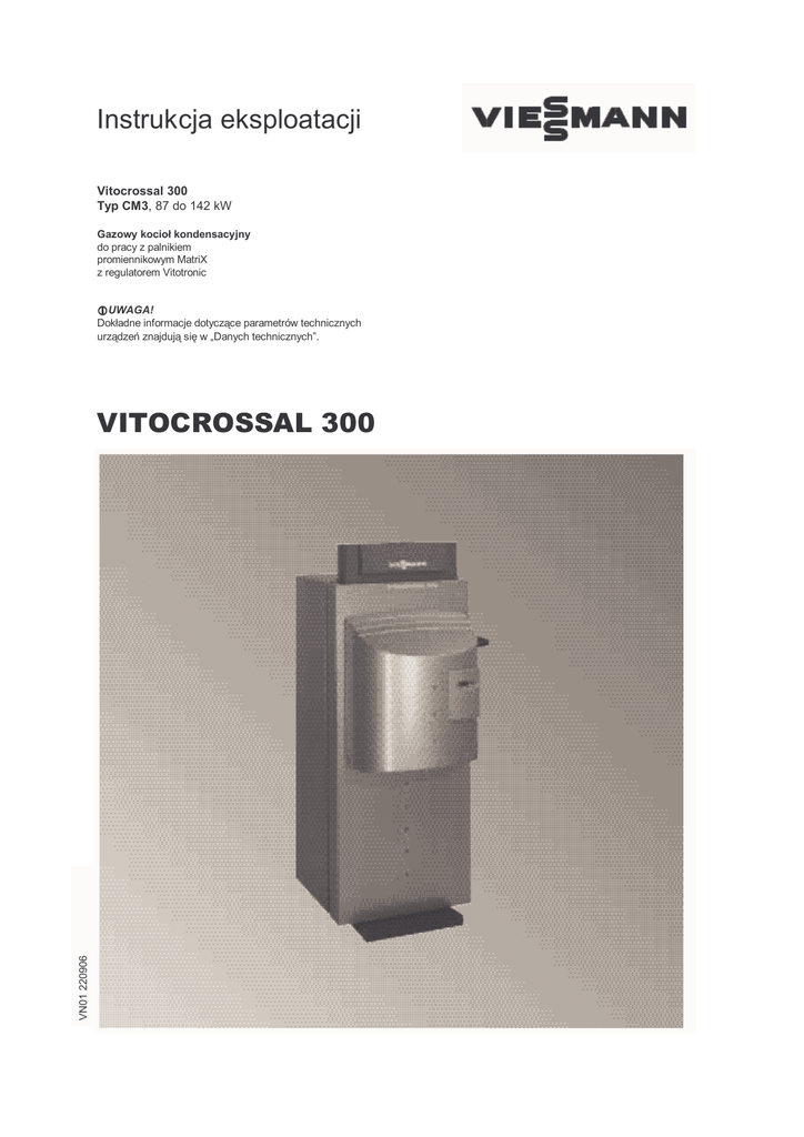 Instrukcja eksploatacji Vitocrossal 300 Typ CM3, 87 do 142 kW Gazowy kocioł kondensacyjny do pracy z palnikiem promiennikowym MatriX z regulatorem Vitotronic UWAGA! Dokładne informacje dotyczące parametrów technicznych urządzeń znajdują się w „Danych technicznych”. VN01 220906 VITOCROSSAL 300 Instrukcja eksploatacji Vitocrossal 300 Typ CM3 , 87 do 142 kW Charakterystyka techniczna Gazowy kocioł kondensacyjny do pracy z palnikiem promiennikowym MatriX i regulatorem Vitotronic. Umieszczone pionowo powierzchnie grzewcze Inox-Crossal zapewniają bezpieczeństwo eksploatacji i duŜą trwałość. Dzięki zamontowanym ciągom spalin nagromadzony kondensat spływa bez przeszkód pionowo w dół. Przez to unika się stęŜenia powodowanego przez ponowne odparowywanie kondensatu. Wzmocniony efekt samooczyszczania się dzięki gładkim powierzchniom ze stali nierdzewnej. Sprawność znormalizowana do 109% dzięki intensywnej kondensacji. Temperatura spalin jest tylko o około 5 do 15 K wyŜsza od temeperatury wody na powrocie. Spalanie z niską emisją zanieczyszczeń dzięki niskiemu obciąŜeniu komory spalania i przelotowej komorze spalania. Dane techniczne Znamionowa moc cieplna przy temp. wody 50/30 oC grzewczej 80/60 oC Znamiononowe obciąŜenie cieplne kW kW kW 29-87 27-80 27-82 Oznakowanie CE Ciśnienie na przyłączu gazu Maks. dop. ciśnienie na przyłączu gazu 38-115 35-105 36-108 47-142 43-130 45-134 CE-0085 BN 0569 mbar mbar 20 50 20 50 20 50 m3/h Parametry na przyłączu w odniesieniu do maks. obciąŜenia gazem o HuB gaz ziemny GZ-50 9,45 kWh/m3 34,01 MJ/m3 gaz ziemny GZ-41,5 8,13 kWh/m3 29,25 MJ/m3 Dopuszczalna temperatura robocza Dop. temperatura zabezpieczenia Dop. nadciśnienie robocze *1 Opór przepływu spalin 8,7 11,4 14,2 3 m /h 10,1 13,3 16,5 o C C bar Pa mbar 100 110 4 85 0,85 100 110 4 130 1,3 100 110 4 150 1,5 Wymiary korpusu kotła Długość Szerokość Wysokość mm mm mm 812 600 1640 812 600 1640 812 600 1640 Wymiary całkowite (z palnikiem) Długość całkowita Szerokość całkowita Wysokość całkowita mm mm mm 1025 690 1867 1025 690 1867 1025 690 1867 mm kg 2057 253 2057 258 2057 261 litry 116 113 110 ½ 50 50 40 1¼ 1 ½ ½ 50 50 40 1¼ 1 ½ ½ 50 50 40 1¼ 1 ½ Wysokość konserwacyjna (regulator) CięŜar całkowity Kocioł grzewczy z izolacją cieplną i regulatorem obiegu kotła Pojemność wodna kotła Przyłącza kotła grzewczego 2 mufy do dodatkowych urządzeń regulacyjnych Zasilanie Powrót do kotła 1 *1 Powrót do kotła 2 *1 Przyłącze zabezpieczające Spust Odpływ kondensatu o R (gw. zew.) PN 6 DN PN 6 DN PN 6 DN G (gw. zew.) R (gw. zew.) R (gw. zew.) 2 Instrukcja eksploatacji Parametry spalin *2 Temperatura (przy temperaturze wody w kotle wynoszącej 30 oC) - przy znamionowej mocy cieplnej - przy obciąŜeniu częściowym Temperatura (przy temperaturze wody w kotle wynoszącej 60 oC) Masowe natęŜenie przepływu (przy oleju opałowym lekkim i gazie ziemnym) - przy znamionowej mocy cieplnej - przy obciąŜeniu częściowym Dyspozycyjne ciśnienie tłoczenia przy króćcu spalin *3 Sprawność znormalizowana przy temp. systemu 50/30 oC grzewczego równej 80/60 oC Króciec spalin Vitocrossal 300 Typ CM3 , 87 do 142 kW o o o C C 55 35 55 35 55 35 C 75 75 75 126 42 70 0,7 166 55 70 0,7 206 69 70 0,7 kg/h kg/h Pa mbar % 109 109 109 % 106 106 106 125 125 125 śred. zew. ∅ mm Strata dyŜurna qB,70 % 0,6 0,5 0,4 *1 W przypadku przyłaczenia 2 obiegów grzewczych do powrotu do kotła 1 naleŜy przyłączyć obieg grzewczy o najniŜszym poziomie temperatury. *2 Wartości rachunkowe do projektowania instalacji spalinowej wg normy DIN 4705 w odniesieniu do 10 % CO2 w przypadku gazu ziemnego. Temperatury spalin jako zmierzone wartości brutto przy 20 oC temperatury powietrza do spalania. Dane obciąŜenia częściowego odnoszą się do wydajności wynoszącej 30 % znamionowej mocy cieplnej. Przy obciąŜeniu częściowym odbiegającym od podanych wartości (zaleŜnie od sposobu eksploatacji) naleŜy odpowiednio obliczyć przepływ masowy spalin. Temperatura spalin przy temperaturze wody na powrocie wynoszącej 30 oC jest miarodajna dla projektowania instalacji spalinowej. *3 Dysponowane ciśnienie tłoczenia moŜna osiągnąć przy zastosowaniu palników promiennikowych MatriX objętych programem sprzedaŜy. Przy zastosowaniu kotła Vitocrossal 300 przy kominach niewraŜliwych na wilgoć ciśnienie tłoczenia moŜe wynosić maksymalnie 0 Pa. 3 Instrukcja eksploatacji Vitocrossal 300 Typ CM3 , 87 do 142 kW Nominalne i minimalne grubości ścianek a kW b c d Rys. tech. MIn Rys. tech. Min Rys. tech. Min Rys. tech. Min 80 4 4 4 4 4 3,6 3 2,6 105 4 4 4 4 4 3,6 3 2,6 130 4 4 4 4 4 3,6 3 2,6 4 Instrukcja eksploatacji Vitocrossal 300 Typ CM3 , 87 do 142 kW Wskazówki dotyczące bezpieczeństwa i eksploatacji Przepisy bezpieczeństwa NaleŜy przestrzegać krajowych przepisów bezpieczeństwa w zakresie eksploatacji urządzeń ciśnieniowych. Prace przy instalacji gazowej moŜe wykonywać wyłącznie instalator, który jest do tego upowaŜniony przez zakład gazowniczy. Wskazówka! Przed przystąpieniem do czynności eksploatacyjnych naleŜy starannie przeczytać tę instrukcję oraz instrukcje obsługi wszystkich urządzeń zamontowanych w kotłowni. Bezpieczne uŜytkowanie kotła nie wymaga stałej obecności osób obsługujących, pod warunkiem, Ŝe jest on wyposaŜony w osprzęt zabezpieczający i ciśnieniowy, który powoduje wyłączenie kotła po wystąpieniu zakłóceń, bez moŜliwości jego uszkodzenia. Prace przy urządzeniu MontaŜ, konserwacja, naprawy muszą być wykonywane przez autoryzowane firmy (firmy instalatorskie / firmy serwisowe). Czynności obsługowe kotła moŜe wykonywać wyłącznie osoba posiadająca stosowne uprawnienia eksploatacyjne zgodne z wymaganiami URE. Nadzór nad pracownikami wykonującymi czynności obsługowe kotła moŜe wykonywać wyłącznie osoba posiadająca stosowne uprawnienia dozorowe zgodnie z wymagan