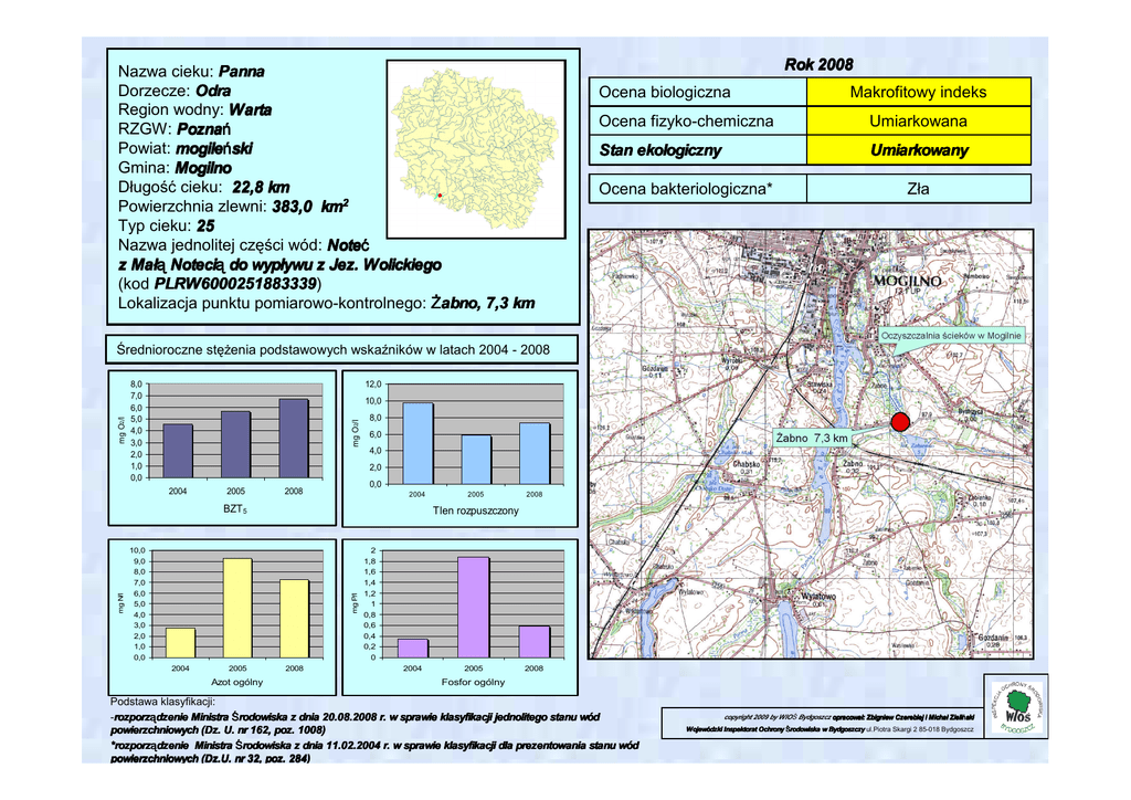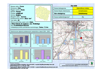 Nazwa cieku: Panna Dorzecze: Odra Region wodny: Warta RZGW: Poznań Poznań Powiat: mogileń mogileński Gmina: Mogilno Długość cieku: 22,8 km Powierzchnia zlewni: 383,0 km2 Typ cieku: 25 Nazwa jednolitej części wód: Noteć Noteć z Mał Małą Notecią Notecią do wypł wypływu z Jez. Wolickiego (kod PLRW6 PLRW 6000251883339 000251883339) 251883339 Lokalizacja punktu pomiarowo-kontrolnego: śabno, 7,3 km Rok 2008 Ocena biologiczna Makrofitowy indeks Ocena fizyko-chemiczna Umiarkowana Stan ekologiczny Umiarkowany Ocena bakteriologiczna* Zła 8,0 7,0 6,0 5,0 4,0 3,0 2,0 1,0 0,0 12,0 10,0 mg O2/l mg O2/l Średnioroczne stęŜenia podstawowych wskaźników w latach 2004 - 2008 8,0 6,0 4,0 2,0 2004 2005 0,0 2008 2004 10,0 9,0 8,0 7,0 6,0 5,0 4,0 3,0 2,0 1,0 0,0 2004 2005 Azot ogólny 2005 2008 Tlen rozpuszczony mg P/l mg N/l BZT 5 2008 2 1,8 1,6 1,4 1,2 1 0,8 0,6 0,4 0,2 0 2004 2005 2008 Fosfor ogólny Podstawa klasyfikacji: -rozporz rozporzą jednolitego o stanu wó rozporządzenie Ministra Środowiska z dnia 20.08.2008 r. w sprawie klasyfikacji jednoliteg wód powierzchniowych (Dz. U. nr 162, poz. 1008) *rozporzą prezentowania towania stanu wó *rozporządzenie Ministra Środowiska z dnia 11.02.2004 r. w sprawie klasyfikacji dla prezen wód powierzchniowych (Dz.U. nr 32, poz. 284) copyright 2009 by WIOŚ Bydgoszcz opracował opracował: Zbigniew Czerebiej i Michał Michał Zieliń Zieliński Wojewó Wojewódzki Inspektorat Ochrony Środowiska w Bydgoszczy ul.Piotra Skargi 2 85-018 Bydgoszcz
