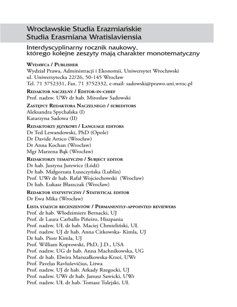 Wrocławskie Studia Erazmiańskie — Studia Erasmiana Wratislaviensia Interdyscyplinarny rocznik naukowy,— którego kolejne zeszyty mają charakter monotematyczny Wydawca / Publisher Wydział Prawa, Administracji i Ekonomii, Uniwersytet Wrocławski ul. Uniwersytecka 22/26, 50-145 Wrocław Tel. 71 3752331, Fax. 71 3752332, e-mail: [email protected] Redaktor naczelny / Editor-in-chief Prof. nadzw. UWr dr hab. Mirosław Sadowski Zastępcy Redaktora Naczelnego / subeditors Aleksandra Spychalska (I) Katarzyna Sadowa (II) Redaktorzy językowi / Language editors Dr Ted Lewandowski, PhD (Opole) Dr Davide Artico (Wrocław) Dr Anna Kochan (Wrocław) Mgr Marzena Bąk (Wrocław) Redaktorzy tematyczni / Subject editor Dr hab. Justyna Jurewicz (Łódź) Dr hab. Małgorzata Łuszczyńska (Lublin) Prof. UWr dr hab. Rafał Wojciechowski (Wrocław) Dr hab. Łukasz Błaszczak (Wrocław) Redaktor statystyczny / Statistical editor Dr Ewa Mika (Wrocław) Lista stałych recenzentów / Permanently-appointed reviewers Prof. dr hab. Włodzimierz Bernacki, UJ Prof. dr Laura Carballo Piñeiro, Hiszpania Prof. nadzw. UŁ dr hab. Maciej Chmieliński, UŁ Prof. nadzw. UJ dr hab. Anna Citkowska- Kimla, UJ Dr hab. Piotr Kimla, UJ Prof. William Koprowski, PhD, J.D., USA Prof. nadzw. UG dr hab. Anna Machnikowska, UG Prof. dr hab. Elwira Marszałkowska-Krześ, UWr Prof. Pavelas Ravluševičius, Litwa Prof. nadzw. UJ dr hab. Arkady Rzegocki, UJ Prof. nadzw. UWr dr hab. Janusz Sawicki, UWr Prof. nadzw. UŁ dr hab. Tomasz Tulejski, UŁ Procedura recenzowania i kwalifikowania— tekstów do druku Na osiem miesięcy przed końcowym terminem nadsyłania prac, którym jest koniec września każdego roku, Redakcja podaje tematykę kolejnego zeszytu. Redakcja przyjmuje prace drogą elektroniczną, zapisane w plikach programu Microsoft Word z rozszerzeniami .doc lub .docx, przy czym teksty powinny być złożone czcionką Times New Roman 12 punktów (przypisy – tą samą czcionką wielkości 10 punktów) i zawierać streszczenie w językach polskim i angielskim (wraz z tłumaczeniem tytułu pracy); podane muszą być także dane kontaktowe autora (autorów). Nadsyłane prace powinny mieć objętość 0,75–1,5 arkuszy wydawniczych, w wyjątkowych przypadkach Redakcja może przyjąć pracę dłuższą, jeśli uzasadnia to jej poziom merytoryczny i nowatorstwo (wymogi dotyczące objętości nie dotyczą artykułów recenzyjnych). Procedurze recenzowania poddawane są jedynie prace odpowiadające wskazanej tematyce zeszytu. Do oceny artykułu powoływanych jest dwóch niezależnych recenzentów, przy czym nie znają oni tożsamości autora (autorów), podobnie jak autorzy nie otrzymują informacji o tożsamości recenzentów konkretnej pracy, a jedynie treść recenzji. W przypadku tekstów w językach obcych przynajmniej jeden z recenzentów ma afiliację zagraniczną inną niż afiliacja autora (autorów). Recenzje, przedstawiane na przygotowanym przez Redakcję formularzu, zawierają jednoznaczny wniosek dotyczący przyjęcia pracy do druku w formie zaproponowanej przez autora, przyjęcia do druku po wprowadzeniu zmian redakcyjnych albo odrzucenia pracy. Publikowane są prace, w których przypadku obie recenzje zawierały konkluzję o przyjęciu do druku. Autorzy prac zakwalifikowanych do wydania muszą ponadto nadesłać podpisane oświadczenia o nienaruszaniu praw osób trzecich, a także – w przypadku współautorstwa – dotyczących wskazania wkładu każdego ze współautorów. Guidelines concerning the review and acceptance— of texts for publication Eight months prior to the submission deadline, i.e. the end of September of each year, the editorial staff announces a general theme for the succeeding volume. Editors accept papers in electronic form, saved in Microsoft Word files as .doc or .docx, with texts written in Times New Roman font size 12 (footnotes size 10), accompanied by summaries in both Polish and English (including a translation of the title) and author’s (authors’) contact information. Submitted papers should not exceed 40,000 characters including spaces. In special cases the editorial staff might accept a longer paper if it boasts innovative and valuable content (guidelines for the size exclude reviews). Only texts that comply with the volume’s given theme are subject to review. Articles are reviewed by two independent referees unaware of the author’s (authors’) identity, just as the authors are not provided with the identity of the reviewers of a given text, short of the content of the review. As regards texts in foreign languages, at least one of the referees has an international affiliation different to the affiliation of the author (authors). Reviews provided on a form supplied by the editors contain a definitive conclusion about the acceptance for publication in the original form, the acceptance for publication after completing editorial changes, or the rejection of the paper. Published papers receive two positive reviews regarding the acceptance for publication. The authors of papers accepted for publication are required to send a signed statement regarding non-violation of third-party rights, and – in cases of coauthorship – statements about the contribution of each of the coauthors.
