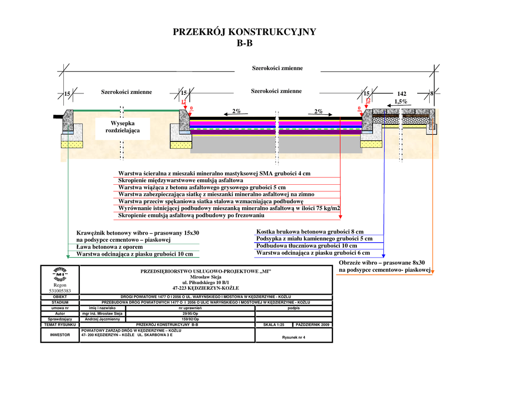PRZEKRÓJ KONSTRUKCYJNY B-B Szeroko ci zmienne 15 Szeroko ci zmienne Szeroko ci zmienne 15 15 12 12 0 2% 0 2% 142 1,5% 8 Wysepka rozdzielaj ca Warstwa cieralna z mieszaki mineralno mastyksowej SMA grubo ci 4 cm Skropienie mi dzywarstwowe emulsj asfaltowa Warstwa wi ca z betonu asfaltowego grysowego grubo ci 5 cm Warstwa zabezpieczaj ca siatk z mieszanki mineralno asfaltowej na zimno Warstwa przeciw sp kaniowa siatka stalowa wzmacniaj ca podbudow Wyrównanie istniej cej podbudowy mieszank mineralno asfaltow w ilo ci 75 kg/m2 Skropienie emulsj asfaltow podbudowy po frezowaniu Kraw nik betonowy wibro – prasowany 15x30 na podsypce cementowo – piaskowej Ława betonowa z oporem Warstwa odcinaj ca z piasku grubo ci 10 cm Kostka brukowa betonowa grubo ci 8 cm Podsypka z miału kamiennego grubo ci 5 cm Podbudowa tłuczniowa grubo ci 10 cm Warstwa odcinaj ca z piasku grubo ci 6 cm Obrze e wibro – prasowane 8x30 na podsypce cementowo- piaskowej PRZEDSI BIORSTWO USŁUGOWO-PROJEKTOWE „MI” Mirosław Sieja ul. Piłsudskiego 10 B/1 47-223 K DZIERZYN-KO LE Regon 531005383 OBIEKT DROGI POWIATOWE 1477 O I 2056 O UL. WARY SKIEGO I MOSTOWA W K DZIERZYNIE - KO LU STADIUM PRZEBUDOWA DRÓG POWIATOWYCH 1477 O I 2056 O ULIC WARY SKIEGO I MOSTOWEJ W K DZIERZYNIE - KO LU umowa nr imi i nazwisko Autor mgr in . Mirosław Sieja Sprawdzaj cy Andrzej J czmienny TEMAT RYSUNKU INWESTOR nr uprawnie podpis 29/95/Op 159/92/Op PRZEKRÓJ KONSTRUKCYJNY B-B POWIATOWY ZARZ D DRÓG W K DZIERZYNIE – KO LU 47- 200 K DZIERZYN – KO LE UL. SKARBOWA 3 E SKALA 1:25 PA DZIERNIK 2009 Rysunek nr 4