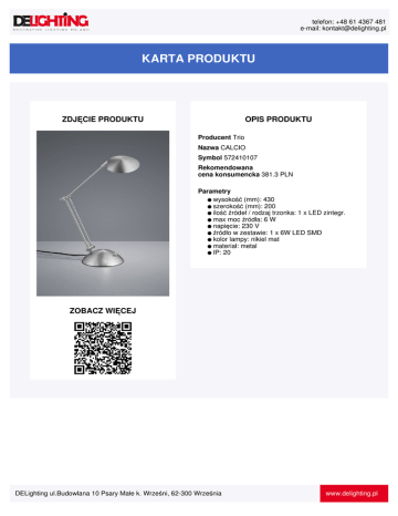 telefon: +48 61 4367 481 e-mail: [email protected] KARTA PRODUKTU ZDJĘCIE PRODUKTU OPIS PRODUKTU Producent Trio Nazwa CALCIO Symbol 572410107 Rekomendowana cena konsumencka 381.3 PLN Parametry ● wysokość (mm): 430 ● szerokość (mm): 200 ● ilość źródeł / rodzaj trzonka: 1 x LED zintegr. ● max moc źródła: 6 W ● napięcie: 230 V ● źródło w zestawie: 1 x 6W LED SMD ● kolor lampy: nikiel mat ● materiał: metal ● IP: 20 ZOBACZ WIĘCEJ DELighting ul.Budowlana 10 Psary Małe k. Wrześni, 62-300 Września www.delighting.pl