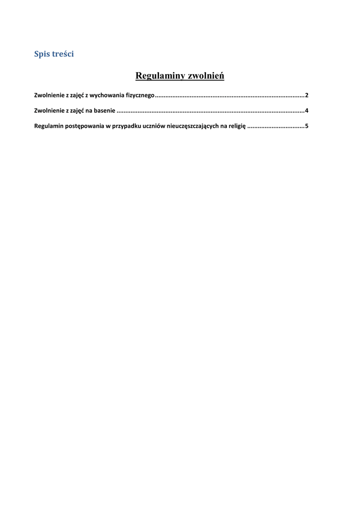 Spis treści Regulaminy zwolnień Zwolnienie z zajęć z wychowania fizycznego ...................................................................................... 2 Zwolnienie z zajęć na basenie ............................................................................................................ 4 Regulamin postępowania w przypadku uczniów nieuczęszczających na religię ................................. 5 REGULAMIN UZYSKIWANIA ZWOLNIEŃ Z ZAJĘĆ WYCHOWANIA FIZYCZNEGO W SZKOLE PODSTAWOWEJ NR 9 STO W WARSZAWIE 1. W uzasadnionych przypadkach uczeń może być zwolniony na czas określony z zajęć wychowania fizycznego. 2. Dłuższe zwolnienie ucznia z zajęć wychowania fizycznego musi być poparte odpowiednią opinią o ograniczonych możliwościach uczestniczenia ucznia w tych zajęciach wystawioną przez lekarza. 3. Opinię lekarską, wskazującą na konieczność zwolnienia ucznia z zajęć wychowania fizycznego na okres nie dłuższy niż 1 miesiąc, należy przekazać nauczycielowi wychowania fizycznego, który obowiązany jest przechowywać ją do końca danego roku szkolnego tj. do 31 sierpnia. Nauczyciel wychowania fizycznego przekazuje informację wychowawcy klasy. 4. Opinię lekarską wystawioną na okres dłuższy niż jeden miesiąc, jednak nie obejmującą całego semestru, należy złożyć wraz z podaniem dyrektorowi szkoły. W przypadku dostarczenia kolejnej / kolejnych opinii dyrektor szkoły wydaje decyzję o zwolnieniu ucznia z zajęć wychowania fizycznego na podstawie tych wszystkich opinii. 5. Zwolnienie może dotyczyć pierwszego lub drugiego semestru bądź całego roku szkolnego, w zależności od wskazań lekarza zawartych w opinii o ograniczonych możliwościach uczestniczenia ucznia w zajęciach. 6. O zwolnienie ucznia z zajęć wychowania fizycznego występują jego rodzice (prawni opiekunowie), którzy składają do dyrektora szkoły podanie wraz z opinią lekarską. 7. Podanie należy przedłożyć dyrektorowi szkoły niezwłocznie po uzyskaniu opinii od lekarza, jednak nie później niż: a) w przypadku zwolnienia dotyczącego I semestru – do 30 września danego roku szkolnego, b) w przypadku zwolnienia dotyczącego II semestru – do 31 stycznia danego roku szkolnego. W przypadku zdarzeń losowych i opinii lekarskich wystawionych w ciągu roku szkolnego rodzice (prawni opiekunowie) składają podania poza ustalonymi wyżej terminami, jednak niezwłocznie po uzyskaniu opinii lekarskiej. 8. Opinia lekarska zwalniająca ucznia z ćwiczeń z wsteczną datą (np. opinia wystawiona w dniu 15 października, a zwalniająca ucznia z zajęć wychowania fizycznego od 1 września) będzie respektowana od daty wystawienia opinii. 9. Zwolnienie niedostarczone w terminie będzie ważne od daty jego złożenia u dyrektora szkoły. 10. Dyrektor szkoły wydaje decyzję o zwolnieniu ucznia z zajęć w terminie do 7 dni roboczych od daty wpływu podania. 11. W przypadku decyzji odmownej rodzice (prawni opiekunowie) ucznia mogą odwołać się za pośrednictwem dyrektora do Mazowieckiego Kuratora Oświaty. 12. O zwolnieniu ucznia z zajęć poinformowany zostaje nauczyciel prowadzący zajęcia oraz wychowawca ucznia. 13. Jeżeli uczeń uzyskuje zwolnienie w trakcie roku szkolnego, a jego nieobecności na lekcjach nie przekroczyły połowy wymaganego czasu i są podstawy do wystawienia oceny, wówczas uczeń podlega klasyfikacji z wychowania fizycznego zgodnie z WSO. 14. Jeżeli okres zwolnienia ucznia z zajęć wychowania fizycznego uniemożliwia ustalenie semestralnej lub rocznej oceny klasyfikacyjnej, w dokumentacji przebiegu nauczania zamiast oceny klasyfikacyjnej wpisuje się ‘zwolniony’. 15. W uzasadnionych przypadkach rodzice (prawni opiekunowie) mogą zwolnić ucznia z uczestnictwa w pojedynczych zajęciach z wychowania fizycznego poprzez dokonanie wpisu do dziennika elektronicznego. 16. Uczeń może nie być klasyfikowany z zajęć wychowania fizycznego, jeżeli brak jest podstaw do ustalenia semestralnej lub rocznej oceny klasyfikacyjnej z powodu nieobecności ucznia na zajęciach, przekraczającej połowę czasu przeznaczonego na te zajęcia w szkolnym planie nauczania. Obecność na zajęciach wychowania fizycznego rozumiana jest jako aktywne uczestniczenie w nich. 17. Uczeń zwolniony z zajęć wychowania fizycznego ma obowiązek być obecny na tych zajęciach wraz ze swoją grupą i pod opieką nauczyciela prowadzącego. 18. W szczególnych przypadkach, gdy lekcje te są pierwszymi lub ostatnimi zajęciami w danym dniu, uczeń może być zwolniony z tego obowiązku na podstawie pisemnego oświadczenia rodziców (prawnych opiekunów) złożonego u wychowawcy klasy. O tym fakcie informowany jest nauczyciel wychowania fizycznego. Rodzice (prawni opiekunowie) zobowiązani są odebrać dziecko osobiście lub przez upoważnione osoby. Samodzielny powrót dziecka do domu wymaga dodatkowej pisemnej zgody rodziców (prawnych opiekunów). W takim przypadku rodzice (prawni opiekunowie) ponoszą pełną odpowiedzialność za dziecko nieobecne na terenie szkoły. Uczeń nieobecny w szkole w czasie zajęć, z których jest zwolniony, ma zaznaczone w dzienniku elektronicznym nieobecności usprawiedliwione. 19. Zawarte w opinii lekarskiej ewentualne ograniczenia, skutkujące zwolnieniem z wykonywania wybranej grupy ćwiczeń, nie są podstawą do zwolnienia ucznia z zajęć wychowania fizycznego. Taką opinię rodzice (prawni opiekunowie) przedstawiają nauczycielowi wychowania fizycznego, który zobowiązany jest uwzględnić zalecenia lekarza w pracy z uczniem. 20. Z niniejszą procedurą nauczyciel wychowania fizycznego zapoznaje uczniów na pierwszych zajęciach w danym roku szkolnym, natomiast wychowawca klasy rodziców (prawnych opiekunów) na pierwszym zebraniu z rodzicami. REGULAMIN UZYSKIWANIA ZWOLNIEŃ Z ZAJĘĆ NA BASENIE W SZKOLE PODSTAWOWEJ NR 9 STO W WARSZAWIE 1. W uzasadnionych przypadkach uczeń może być zwolniony z zajęć na basenie. 2. Z