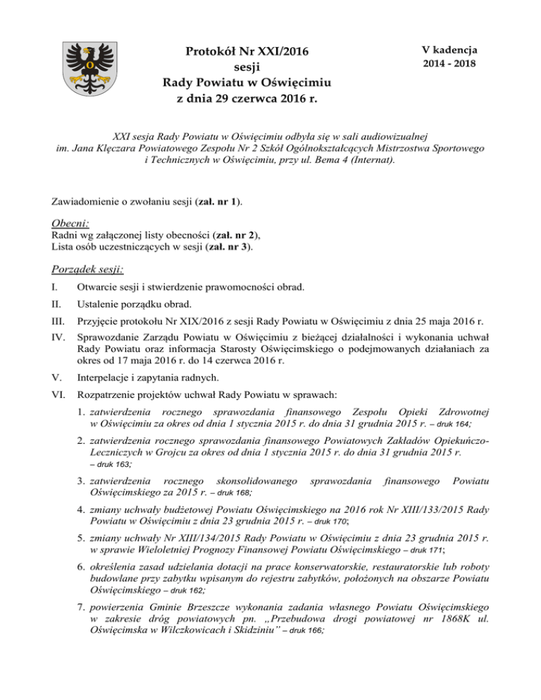 Protokół Nr XXI/2016 sesji Rady Powiatu w Oświęcimiu z dnia 29 czerwca 2016 r. V kadencja 2014 - 2018 XXI sesja Rady Powiatu w Oświęcimiu odbyła się w sali audiowizualnej im. Jana Klęczara Powiatowego Zespołu Nr 2 Szkół Ogólnokształcących Mistrzostwa Sportowego i Technicznych w Oświęcimiu, przy ul. Bema 4 (Internat). Zawiadomienie o zwołaniu sesji (zał. nr 1). Obecni: Radni wg załączonej listy obecności (zał. nr 2), Lista osób uczestniczących w sesji (zał. nr 3). Porządek sesji: I. Otwarcie sesji i stwierdzenie prawomocności obrad. II. Ustalenie porządku obrad. III. Przyjęcie protokołu Nr XIX/2016 z sesji Rady Powiatu w Oświęcimiu z dnia 25 maja 2016 r. IV. Sprawozdanie Zarządu Powiatu w Oświęcimiu z bieżącej działalności i wykonania uchwał Rady Powiatu oraz informacja Starosty Oświęcimskiego o podejmowanych działaniach za okres od 17 maja 2016 r. do 14 czerwca 2016 r. V. Interpelacje i zapytania radnych. VI. Rozpatrzenie projektów uchwał Rady Powiatu w sprawach: 1. zatwierdzenia rocznego sprawozdania finansowego Zespołu Opieki Zdrowotnej w Oświęcimiu za okres od dnia 1 stycznia 2015 r. do dnia 31 grudnia 2015 r. – druk 164; 2. zatwierdzenia rocznego sprawozdania finansowego Powiatowych Zakładów OpiekuńczoLeczniczych w Grojcu za okres od dnia 1 stycznia 2015 r. do dnia 31 grudnia 2015 r. – druk 163; 3. zatwierdzenia rocznego skonsolidowanego Oświęcimskiego za 2015 r. – druk 168; sprawozdania finansowego Powiatu 4. zmiany uchwały budżetowej Powiatu Oświęcimskiego na 2016 rok Nr XIII/133/2015 Rady Powiatu w Oświęcimiu z dnia 23 grudnia 2015 r. – druk 170; 5. zmiany uchwały Nr XIII/134/2015 Rady Powiatu w Oświęcimiu z dnia 23 grudnia 2015 r. w sprawie Wieloletniej Prognozy Finansowej Powiatu Oświęcimskiego – druk 171; 6. określenia zasad udzielania dotacji na prace konserwatorskie, restauratorskie lub roboty budowlane przy zabytku wpisanym do rejestru zabytków, położonych na obszarze Powiatu Oświęcimskiego – druk 162; 7. powierzenia Gminie Brzeszcze wykonania zadania własnego Powiatu Oświęcimskiego w zakresie dróg powiatowych pn. „Przebudowa drogi powiatowej nr 1868K ul. Oświęcimska w Wilczkowicach i Skidziniu” – druk 166; (21) Protokół sesji Nr XXI/2016 z dnia 29 czerwca 2016 r. V Kadencji Rady Powiatu w Oświęcimiu ________________________________________________________________________________________________ 8. powierzenia Gminie Brzeszcze wykonania zadania własnego Powiatu Oświęcimskiego w zakresie dróg powiatowych pn. „Przebudowa drogi powiatowej nr 1870K ul. Nosala w Brzeszczach etap II” - druk 169; 9. zmiany uchwały Nr XVI/164/2016 Rady Powiatu w Oświęcimiu z dnia 23 marca 2016 r. w sprawie określenia rodzaju zadań powiatu z zakresu rehabilitacji zawodowej i społecznej osób niepełnosprawnych i podział środków na 2016 r. przyznanych samorządowi powiatowemu według algorytmu – druk 165; 10. uchwalenia „Strategii Rozwiązywania Problemów Społecznych Powiatu Oświęcimskiego na lata 2016-2020” – druk 167. VII. Odpowiedzi na interpelacje i zapytania radnych. VIII. Wnioski i oświadczenia radnych. IX. Sprawy bieżące. X. Zamknięcie sesji. Ad. I. Otwarcie sesji i stwierdzenie prawomocności obrad. Wiceprzewodniczący Rady Powiatu Adam Merta otworzył XXI sesję Rady Powiatu w Oświęcimiu witając radnych, zaproszonych gości oraz pozostałe osoby biorące udział w sesji. Na podstawie listy obecności Wiceprzewodniczący stwierdził, że w sesji uczestniczy 23 radnych, co stanowi quorum wymagane do podejmowania prawomocnych uchwał Rady Powiatu w Oświęcimiu. Ad. II. Ustalenie porządku obrad. Starosta Oświęcimski Zbigniew Starzec w imieniu Zarządu poprosił o wprowadzenie do porządku obrad dwa projekty uchwał: Projekt uchwały w sprawie udzielenia pomocy finansowej dla Gminy Osiek na realizację zadania pn. „Zakup dwuosiowej przyczepy WIOLA TYP-3 do przewozu sprzętu przeciwpowodziowego i zdarzeń środowiskowych dla Ochotniczej Straży Pożarnej w Osieku” – druk 172. Głosowanie nad przyjęciem projektu uchwały do porządku obrad: Za: 23 Przeciw: 0 Wstrzymało się: 0 Projekt uchwały został przyjęty do porządku obrad. Projekt uchwały w sprawie udzielenia pomocy finansowej dla Gminy Oświęcim na realizacje zadania pn. „Zakup defibrylatora AED” – druk 173. Głosowanie nad przyjęciem projektu uchwały do porządku obrad: Za: 23 Przeciw: 0 Wstrzymało się: 0 Projekt uchwały został przyjęty do porządku obrad. Strona 2 z 8 (21) Protokół sesji Nr XXI/2016 z dnia 29 czerwca 2016 r. V Kadencji Rady Powiatu w Oświęcimiu ________________________________________________________________________________________________ Rada Powiatu nie wnosząc uwag do zmian porządku obrad przystąpiła do głosowania. Głosowanie całości porządku obrad: Za: 23 Przeciw: 0 Wstrzymało się: 0 Porządek obrad został przyjęty. Ad. III. Przyjęcie protokołu Nr XIX/2016 z sesji Rady Powiatu w Oświęcimiu z dnia 25 maja 2016 r. Protokół Nr XIX/2016 z dnia 25 maja 2016 r. został przyjęty przy 23 głosach za. Ad. IV. Sprawozdanie Zarządu Powiatu w Oświęcimiu z bieżącej działalności i wykonania uchwał Rady Powiatu oraz informacja Starosty Oświęcimskiego o podejmowanych działaniach w okresie od 17 maja 2016 r. do 14 czerwca 2016 r. Sprawozdanie Zarządu Powiatu w Oświęcimiu z bieżącej działalności i wykonania uchwał Rady Powiatu oraz informacja Starosty Oświęcimskiego o podejmowanych działaniach w okresie od 17 maja 2016 r. do 14 czerwca 2016 r. (zał. nr 4). Starosta Zbigniew Starzec zaproponował, aby radni zadawali pytania do konkretnego punktu. Brak pytań. Ad. V. Interpelacje i zapytania radnych. Radny Adam Merta złożył interpelację dotyczącą obecnego stanu dróg powiatowych oraz remontów pozimowych związanych z dużymi uszkodzeniami nawierzchni często zagrażających bezpieczeństwu użytkowników (zał. nr 5). VI. Ro