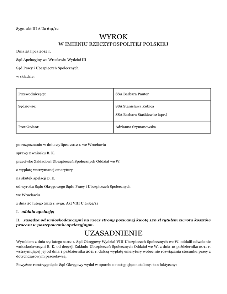 Sygn. akt III A Ua 619/12 WYROK W IMIENIU RZECZYPOSPOLITEJ POLSKIEJ Dnia 25 lipca 2012 r. Sąd Apelacyjny we Wrocławiu Wydział III Sąd Pracy i Ubezpieczeń Społecznych w składzie: Przewodniczący: SSA Barbara Pauter Sędziowie: SSA Stanisława Kubica SSA Barbara Staśkiewicz (spr.) Protokolant: Adrianna Szymanowska po rozpoznaniu w dniu 25 lipca 2012 r. we Wrocławiu sprawy z wniosku B. K. przeciwko Zakładowi Ubezpieczeń Społecznych Oddział we W. o wypłatę wstrzymanej emerytury na skutek apelacji B. K. od wyroku Sądu Okręgowego Sądu Pracy i Ubezpieczeń Społecznych we Wrocławiu z dnia 29 lutego 2012 r. sygn. Akt VIII U 2454/11 I. oddala apelację; II. zasądza od wnioskodawczyni na rzecz strony pozwanej kwotę 120 zł tytułem zwrotu kosztów procesu w postępowaniu apelacyjnym. UZASADNIENIE Wyrokiem z dnia 29 lutego 2012 r. Sąd Okręgowy Wydział VIII Ubezpieczeń Społecznych we W. oddalił odwołanie wnioskodawczyni B. K. od decyzji Zakładu Ubezpieczeń Społecznych Oddział we W. z dnia 12 października 2011 r. wstrzymującej jej od dnia 1 października 2011 r. dalszą wypłatę emerytury wobec nie rozwiązania stosunku pracy z dotychczasowym pracodawcą. Powyższe rozstrzygnięcie Sąd Okręgowy wydał w oparciu o następująco ustalony stan faktyczny: Wnioskodawczyni, urodzona (...), decyzją z dnia 16 grudnia 2009 r. organ rentowy przyznał jej od dnia 1 listopada 2009 r. emeryturę. Wobec tego, że wnioskodawczyni kontynuowała zatrudnienie i osiągała przychód w kwocie przekraczającej 70% przeciętnego wynagrodzenia, świadczenie podlegało zmniejszeniu. Na wniosek z dnia 5 stycznia 2010 r. organ rentowy wobec ukończenia przez wnioskodawczynię powszechnego wieku emerytalnego rozpoczął wypłacanie jej emerytury w pełnej wysokości. W decyzji waloryzacyjnej z dnia 9 marca 2011 r., to jest w pouczeniu tej decyzji określonej w ust. 8 pkt.3 zawarta została informacja o nowych przepisach, to jest o wejściu w życie ustawy z dnia 16 grudnia 2010 r. o zmianie ustawy o finansach publicznych oraz niektórych innych ustaw (Dz. U. z 2010 r., Nr 257, poz. 1726) dotyczącej warunków pobierania emerytury, w tym możliwości wstrzymania wypłaty świadczenia. Wnioskodawczyni od dnia nabycia prawa do emerytury do chwili obecnej kontynuowała zatrudnienie w Urzędzie Miejskim we W. z tego względu organ rentowy decyzją z dnia 12 października 2011 r. wstrzymał jej wypłatę emerytury z dniem 1 października 2011 r. Przy tak poczynionych ustaleniach faktycznych Sąd Okręgowy uznał, że odwołanie wnioskodawczyni jest nieuzasadnione. Sąd Okręgowy wskazał, że prawo do emerytury ulega zawieszeniu, jeżeli emeryt nie rozwiąże wszystkich stosunków pracy, w których pozostawał bezpośrednio przed dniem nabycia prawa do emerytury. Nadto Sad I instancji zauważył, że ze zmienionego przepisu art. 103a ustawy z dnia 17 grudnia 1998 r. o emeryturach i rentach z Funduszu Ubezpieczeń Społecznych (Dz. U. z 2009 r., Nr 153, poz. 1227) nie wynika obowiązek rozwiązania stosunku pracy przez pracownika, który nabył prawo do emerytury. Przepis ten nie nakłada również na pracodawcę obowiązku rozwiązania z takim pracownikiem stosunku pracy z dniem 1 października 2011 r. Istota regulacji zawartej w tym przepisie jest ograniczenie równoczesnego pobierania dwóch świadczeń: emerytury i wynagrodzenia za pracę, jeżeli pracownik nie miał zamiaru przejść na emeryturę, lecz planował nadal pracować u tego samego pracodawcy bez rozwiązywania dotychczasowego i nawiązania nowego stosunku pracy. W judykaturze potwierdzono, że kontynuacja zatrudnienia, bez rozwiązania stosunku pracy – po dniu nabycia prawa do emerytury, przesądza o zawieszeniu tego prawa (wyroki Sądu Najwyższego: z dnia 19 lutego 2004 r., sygn. akt II UK 274/03, z dnia 12 lutego 2004 r., sygn. akt II UK 237/03). Sąd Okręgowy wskazał, że wnioskodawczyni została poinformowana o zmianie przepisów i mimo tego nie rozwiązała stosunku pracy i nadal kontynuuje zatrudnienie w Urzędzie Miejskim we W.. Skoro więc wnioskodawczyni pobiera emeryturę od dnia 1 października 2009 r., kontynuując jednocześnie zatrudnienie u dotychczasowego pracodawcy do chwili obecnej, to wyczerpuje ona swym zachowaniem dyspozycję art. 103a ustawy, wobec czego zasadnie organ rentowy wstrzymał jej z dniem 1 października 2011 r. wypłatę emerytury. Natomiast samo wstrzymanie wypłaty emerytury nie oznacza całkowitego pozbawienia jej prawa do jej pobierania, gdyż w sytuacji rozwiązania stosunku pracy, będzie mogła ubiegać się o przywrócenie wypłaty tegoż świadczenia. Powyższy wyrok w całości zaskarżyła B. K., podnosząc, że wstrzymanie jej wypłaty emerytury jest niezgodne z Konstytucją, a w szczególności z art. 2 Konstytucji. Podniosła, że zgodnie z tego przepisu wynikają zasady: nie działania prawa wstecz, ochrony praw słusznie nabytych oraz budowy zaufania do państwa i stanowionego przez nie praw, które nie zostały uwzględnione przez Sąd Okręgowy. Wskazując na powyższe wniosła o zmianę zaskarżonego wyroku i zaskarżonej decyzji organu rentowego i podjęcie jej wypłaty emerytury. Sąd Apelacyjny zważył co następuje: Apelacja wnioskodawczyni nie jest zasadna. Zgodnie z art. 6 pkt 2 ustawy z dnia 16 grudnia 2010 r. (Dz. U. Nr 257, poz. 1726) o zmianie ustawy o finansach publicznych oraz niektórych innych ustaw w ustawie o emeryturach i rentach z Funduszu Ubezpieczeń Społecznych po art. 103 dodano art. 103a w brzmieniu: prawo do emerytury ulega zawieszeniu bez względu na wysokość przychodu uzyskiwanego przez emeryta z tytułu zatrudnienia kontynuowanego bez uprzedniego rozwiązania stosunku pracy z pracodawcą, na rzecz którego wykonywał je bezpośrednio przed dniem nabycia prawa do emerytury, ustalonym w decyzji organu rentowego. Natomiast po myśli art. 27 ustawy o zmianie ustawy o finansach publicznych oraz niektórych innych ustaw Zakład Ubezpieczeń Społec