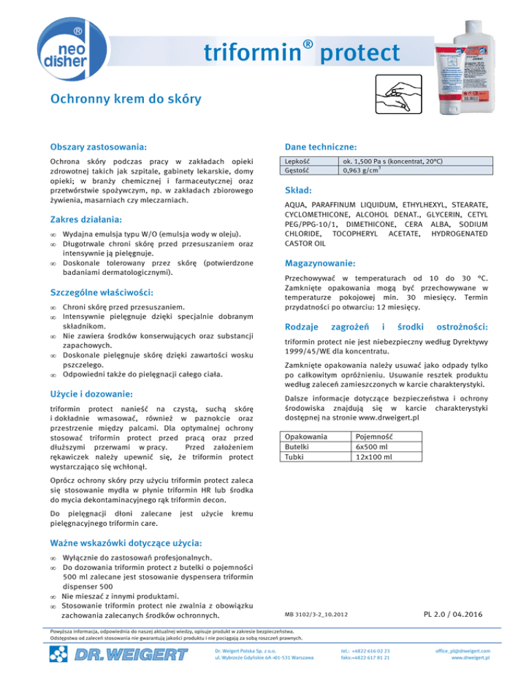 ® triformin protect Ochronny krem do skóry Obszary zastosowania: Dane techniczne: Ochrona skóry podczas pracy w zakładach opieki zdrowotnej takich jak szpitale, gabinety lekarskie, domy opieki; w branży chemicznej i farmaceutycznej oraz przetwórstwie spożywczym, np. w zakładach zbiorowego żywienia, masarniach czy mleczarniach. Lepkość Gęstość Zakres działania: • • • Wydajna emulsja typu W/O (emulsja wody w oleju). Długotrwale chroni skórę przed przesuszaniem oraz intensywnie ją pielęgnuje. Doskonale tolerowany przez skórę (potwierdzone badaniami dermatologicznymi). Szczególne właściwości: • • • • • Chroni skórę przed przesuszaniem. Intensywnie pielęgnuje dzięki specjalnie dobranym składnikom. Nie zawiera środków konserwujących oraz substancji zapachowych. Doskonale pielęgnuje skórę dzięki zawartości wosku pszczelego. Odpowiedni także do pielęgnacji całego ciała. Użycie i dozowanie: triformin protect nanieść na czystą, suchą skórę i dokładnie wmasować, również w paznokcie oraz przestrzenie między palcami. Dla optymalnej ochrony stosować triformin protect przed pracą oraz przed dłuższymi przerwami w pracy. Przed założeniem rękawiczek należy upewnić się, że triformin protect wystarczająco się wchłonął. ok. 1,500 Pa s (koncentrat, 20°C) 3 0,963 g/cm Skład: AQUA, PARAFFINUM LIQUIDUM, ETHYLHEXYL, STEARATE, CYCLOMETHICONE, ALCOHOL DENAT., GLYCERIN, CETYL PEG/PPG-10/1, DIMETHICONE, CERA ALBA, SODIUM CHLORIDE, TOCOPHERYL ACETATE, HYDROGENATED CASTOR OIL Magazynowanie: Przechowywać w temperaturach od 10 do 30 °C. Zamknięte opakowania mogą być przechowywane w temperaturze pokojowej min. 30 miesięcy. Termin przydatności po otwarciu: 12 miesięcy. Rodzaje zagrożeń i środki ostrożności: triformin protect nie jest niebezpieczny według Dyrektywy 1999/45/WE dla koncentratu. Zamknięte opakowania należy usuwać jako odpady tylko po całkowitym opróżnieniu. Usuwanie resztek produktu według zaleceń zamieszczonych w karcie charakterystyki. Dalsze informacje dotyczące bezpieczeństwa i ochrony środowiska znajdują się w karcie charakterystyki dostępnej na stronie www.drweigert.pl Opakowania Butelki Tubki Pojemność 6x500 ml 12x100 ml Oprócz ochrony skóry przy użyciu triformin protect zaleca się stosowanie mydła w płynie triformin HR lub środka do mycia dekontaminacyjnego rąk triformin decon. Do pielęgnacji dłoni zalecane pielęgnacyjnego triformin care. jest użycie kremu Ważne wskazówki dotyczące użycia: • • Wyłącznie do zastosowań profesjonalnych. Do dozowania triformin protect z butelki o pojemności 500 ml zalecane jest stosowanie dyspensera triformin dispenser 500 • Nie mieszać z innymi produktami. • Stosowanie triformin protect nie zwalnia z obowiązku zachowania zalecanych środków ochronnych. MB 3102/3-2_10.2012 PL 2.0 / 04.2016 Powyższa informacja, odpowiednia do naszej aktualnej wiedzy, opisuje produkt w zakresie bezpieczeństwa. Odstępstwa od zaleceń stosowania nie gwarantują jakości produktu i nie pociągają za sobą roszczeń prawnych. Dr. Weigert Polska Sp. z o.o. ul. Wybrzeże Gdyńskie 6A •01-531 Warszawa tel.: +4822 616 02 23 faks:+4822 617 81 21 [email protected] www.drweigert.pl