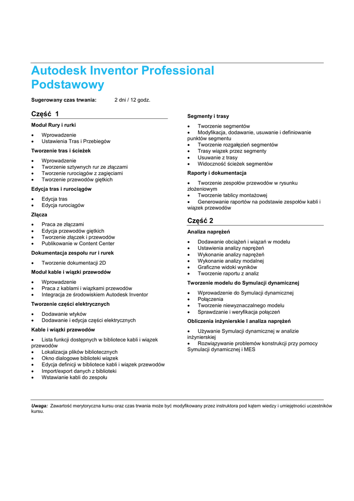 Autodesk Inventor Professional Podstawowy Sugerowany czas trwania: 2 dni / 12 godz. Część 1 Moduł Rury i rurki • • Wprowadzenie Ustawienia Tras i Przebiegów Tworzenie tras i ścieŜek • • • • Wprowadzenie Tworzenie sztywnych rur ze złączami Tworzenie rurociągów z zagięciami Tworzenie przewodów giętkich Edycja tras i rurociągów • • Edycja tras Edycja rurociągów Segmenty i trasy • Tworzenie segmentów • Modyfikacja, dodawanie, usuwanie i definiowanie punktów segmentu • Tworzenie rozgałęzień segmentów • Trasy wiązek przez segmenty • Usuwanie z trasy • Widoczność ścieŜek segmentów Raporty i dokumentacja • Tworzenie zespołów przewodów w rysunku złoŜeniowym • Tworzenie tablicy montaŜowej • Generowanie raportów na podstawie zespołów kabli i wiązek przewodów Złącza • • • • Praca ze złączami Edycja przewodów giętkich Tworzenie złączek i przewodów Publikowanie w Content Center Dokumentacja zespołu rur i rurek • Tworzenie dokumentacji 2D Moduł kable i wiązki przewodów • • • Wprowadzenie Praca z kablami i wiązkami przewodów Integracja ze środowiskiem Autodesk Inventor Tworzenie części elektrycznych • • Dodawanie wtyków Dodawanie i edycja części elektrycznych Kable i wiązki przewodów • Lista funkcji dostępnych w bibliotece kabli i wiązek przewodów • Lokalizacja plików bibliotecznych • Okno dialogowe biblioteki wiązek • Edycja definicji w bibliotece kabli i wiązek przewodów • Import/export danych z biblioteki • Wstawianie kabli do zespołu Część 2 Analiza napręŜeń • • • • • • Dodawanie obciąŜeń i wiązań w modelu Ustawienia analizy napręŜeń Wykonanie analizy napręŜeń Wykonanie analizy modalnej Graficzne widoki wyników Tworzenie raportu z analiz Tworzenie modelu do Symulacji dynamicznej • • • • Wprowadzenie do Symulacji dynamicznej Połączenia Tworzenie niewyznaczalnego modelu Sprawdzanie i weryfikacja połączeń Obliczenia inŜynierskie I analiza napręŜeń • UŜywanie Symulacji dynamicznej w analizie inŜynierskiej • Rozwiązywanie problemów konstrukcji przy pomocy Symulacji dynamicznej i MES Uwaga: Zawartość merytoryczna kursu oraz czas trwania moŜe być modyfikowany przez instruktora pod kątem wiedzy i umiejętności uczestników kursu.
