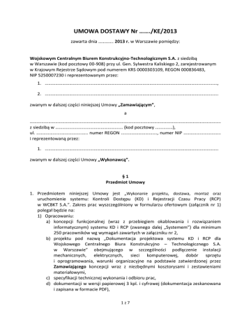 UMOWA DOSTAWY Nr ……./KE/2013 zawarta dnia …………. 2013 r. w Warszawie pomiędzy: Wojskowym Centralnym Biurem Konstrukcyjno-Technologicznym S.A. z siedzibą w Warszawie (kod pocztowy 00-908) przy ul. Gen. Sylwestra Kaliskiego 2, zarejestrowanym w Krajowym Rejestrze Sądowym pod numerem KRS 0000303109, REGON 000836483, NIP 5250007230 i reprezentowanym przez: 1. …………………………………………………………………………………………………………………………………., 2. ………………………………………………………………………………………………………………………………….. zwanym w dalszej części niniejszej Umowy „Zamawiającym”, a ………………………………………………………………………….……………………………………………………………………. z siedzibą w …………………………………………………. (kod pocztowy ……………), ul. ………………….……………..….. numer REGON …………………………., numer NIP ………………………….. i reprezentowaną przez: 1. ………………………………………………………………………………………………………………………………….. zwanym w dalszej części Umowy „Wykonawcą”. §1 Przedmiot Umowy 1. Przedmiotem niniejszej Umowy jest „Wykonanie projektu, dostawa, montaż oraz uruchomienie systemu: Kontroli Dostępu (KD) i Rejestracji Czasu Pracy (RCP) w WCBKT S.A.”. Zakres prac wyszczególniony w formularzu ofertowym (załącznik nr 1) polegał będzie na: 1) Opracowaniu: a) koncepcji funkcjonalnej (wraz z przebiegiem okablowania i rozwiązaniem informatycznym) systemu KD i RCP (zwanego dalej „Systemem”) dla minimum 250 pracowników wg wymagań zawartych w załączniku nr 2, b) projektu pod nazwą „Dokumentacja projektowa systemu KD i RCP dla Wojskowego Centralnego Biura Konstrukcyjno – Technologicznego S.A. w Warszawie” obejmującego w szczególności podłączenie instalacji mechanicznych, elektrycznych, sieci komputerowej, dobór sprzętu i oprogramowania, warunki organizacyjne na podstawie zatwierdzonej przez Zamawiającego koncepcji wraz z niezbędnymi kosztorysami i zestawieniami materiałowymi, c) specyfikacji technicznej wykonania i odbioru prac, d) dokumentacji w wersji papierowej 3 kpl. i cyfrowej (dokumentacja zeskanowana i zapisana w formacie PDF), 1z7 2. 3. 4. 5. e) dokumentacji eksploatacyjnej (min. instrukcji obsługi systemu i instrukcji oprogramowania itp.). 2) Uzyskaniu wymaganych opinii, uzgodnień i sprawdzeń rozwiązań projektowych w zakresie wynikającym z przepisów (m.in. ppoż.). 3) Dostawie Systemu wynikającego z dokumentacji projektowej. 4) Wykonaniu prac montażowych wynikających z dokumentacji projektowej. 5) Prowadzeniu nadzoru autorskiego podczas realizacji prac montażowych. 6) Wykonaniu zgodnie z dokumentacją projektową Systemu KD i RCP oraz jego instalacji w siedzibie WCBKT S.A. 7) Przeprowadzeniu testów sprawdzających poprawność działania (odbiór). 8) Szkolenie w zakresie obsługi urządzeń i oprogramowania przeprowadzone na terenie WCBKT S.A. Wraz z Systemem dostarczone będą: a) dokumentacja (instrukcje eksploatacji, deklaracje zgodności, instrukcje użytkowania, karty katalogowe), b) wymagania dotyczące montażu, c) zestawienie dotyczące producentów podzespołów systemu, d) zestawienie dotyczące dostępności części w okresie gwarancyjnym i pogwarancyjnym, kosztach serwisowania i cenach materiałów eksploatacyjnych. Urządzenia wchodzące w skład Systemu będą fabrycznie nowe z produkcji 2013 roku. Wykonawca zobowiązany jest do: a) dostawy Systemu określonego w ust. 1 loco siedziba Wojskowego Centralnego Biura Konstrukcyjno-Technologicznego S.A., b) montażu instalacji i uruchomienia Systemu, c) przeszkolenia operatorskiego pracowników Zamawiającego, dedykowanych do obsługi, d) przekazania działającego Systemu Zamawiającemu. Wykonawca zobowiązuje się do przeprowadzenia Szkolenia pracowników Spółki. Szkolenie trwa ….. dni i jest połączone z instalacją Systemu. §2 Wartość Umowy 1. Wynagrodzenie ryczałtowe za prace objęte Umową wynosi zgodnie z przedłożoną ofertą kwotę netto ………….…………….………….. zł (słownie: ……………..…………………………………………... …………………………………………………………………………………………………………………………………………) plus podatek VAT w wysokości 23% tj. ……….……………………………... zł, co stanowi wartość brutto: ………………………………………………………. zł (słownie: ……………………...………………………… ………………………………………………………………………………………………………………………………………..). 2. Wartość może być zmniejszona o kary umowne w przypadku i na zasadach określonych w § 9 niniejszej Umowy. 3. Wynagrodzenie obejmować będzie: wszystkie koszt związane realizacją przedmiotu zamówienia ujętego w § 1 ust. 1. 2z7 §3 Termin wykonania Umowy 1. Przekazanie Zamawiającemu kompletu dokumentacji projektowej ustala się na dzień …………………………. 2. Termin rozpoczęcia prac montażowych ustala się na dzień protokolarnego przekazania pomieszczeń Wykonawcy, lecz nie później niż 7 dni po wykonaniu przez Wykonawcę dokumentacji projektowej. 3. Termin zakończenia prac montażowych zgodnie z zakresem wskazanym w § 1 ustala się na ………………………. 4. Termin wykonania prac może ulec zmianie za zgodą stron w przypadku ewentualnego zlecenia prac dodatkowych lub zamiennych mogących mieć wpływ na pierwotnie uzgodniony termin wykonania Umowy. §4 Warunki odbioru 1. 2. 3. 4. 5. 6. 7. 8. Odbiór Systemu obj
