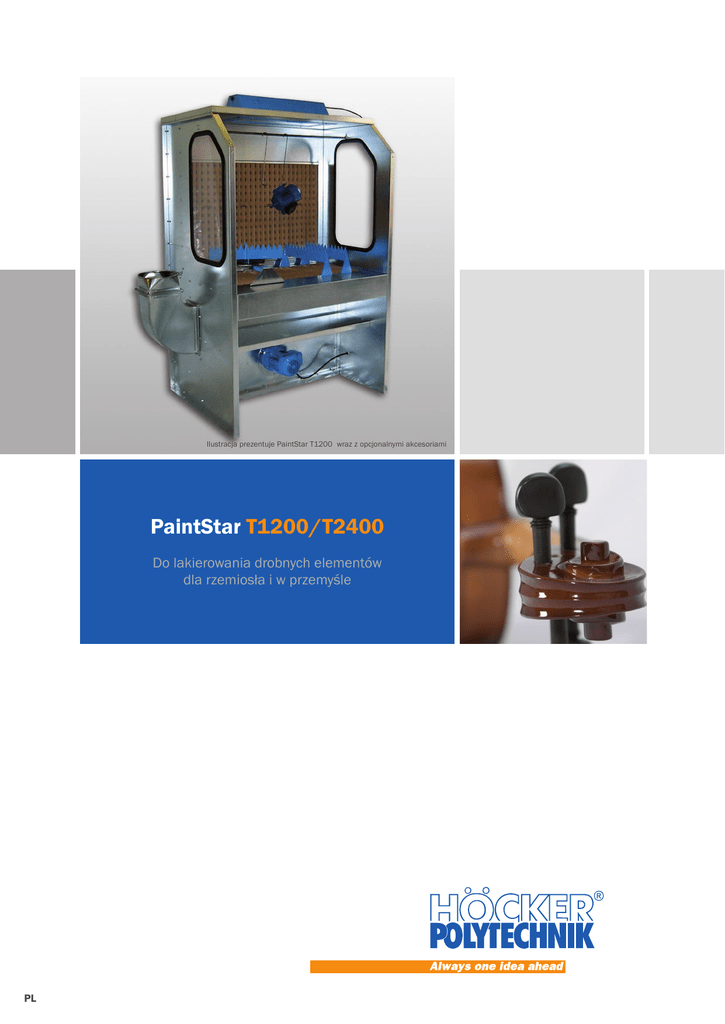 Ilustracja prezentuje PaintStar T1200 wraz z opcjonalnymi akcesoriami PaintStar T1200/T2400 Do lakierowania drobnych elementów dla rzemiosła i w przemyśle PL T jak Topowe rozwiązanie dla małych detali Sucha ściana typu PainStar T jest najmniejszym modelem z typoszeregu PaintStar – ta kabina natryskowa jest idealna dla lakierowania drobnych elementów, zarówno w rzemiośle, jak i w przemyśle, ponieważ konwencjonalne kabiny natryskowe nie zawsze są idealne do lakierowania małych detali. Ergonomiczna wysokość powierzchni roboczej oraz wysoka siła ssąca przy dwustopniowej filtracji – pionowej i poziomej oraz strumień powietrza pozbawiony turbulencji gwarantuje czyste powietrze oraz najlepszą jakość lakierowanej powierzchni. Stanowisko lakierowania PaintStar T uzupełnione wkładem filtra kartonowego Polytechnik chroni kieszeń użytkownika i oszczędza środowisko. W razie zapotrzebowania modele typu PaintStar można w łatwy sposób doposażyć o dodatkowe funkcje. Przy większych gabarytach pracy prezentujemy 2,4-metrowej szerokości model PaintStar T2400, jako ciekawą alternatywę dla kabin lakierniczych typu PaintStar T1200. Wszystkie zalety w zarysie • Korzystny zakup i niskie zapotrzebowanie na energię. • Optymalna szerokość robocza 1,20 m (PaintStar T1200). • Wysoki stopień separacji – filtracji cząstek stałych. • Niskie koszty eksploatacji dzięki tanim filtrom. • Zintegrowana półka poniżej stołu odciągowego. • Zintegrowany drążek do wieszania małych przedmiotów. • Długa żywotność i czas pracy przy niskich kosztach. 1960 mm • Pionowo i poziomo rozmieszczone powierzchnie odciągu. • Bardzo wysoka sprawność energetyczna. Specjalne wyposażenie za dopłatą: • Dach z wbudowanym oświetleniem (wykonanie p.wybuchowe) • Boczne okienka. 20 96 12 0m m mm • Koziołki - wsporniki (dostarczane w parach). • Wieniec obrotowy do lakierowanych elementów. • Mobilny stojak do zawieszania polakierowanych elementów. • Tryb recyrkulacji (tylko w przypadku farb - lakierów typu VOC) Kabina natryskowa PaintStar T2400 Dostarczone urządzenie jest kompletnie zmontowane na bezzwrotnej, drewnianej palecie. Wyłącznie kolano kanałowe wydmuchu powietrza musimy przykręcić czterema śrubami (do wyboru z prawej lub lewej strony) oraz wykonać podłączenie elektryczne. Ze względu na wysokość transportową wyposażenie dodatkowe dostarczane jest oddzielnie. Wyrzutnia: średnica 250 mm Silnik napędu: EExe II ATEX; 230/400 V; 0,75 kW; 1500 1/min Wydajność: ca. 1900 m³/h przy zewnętrznym podciśnieniu 350 Pa Poziom hałasu: ca. 73 dB(A) w wolnej przestrzeni na wysokości 1,20 m HÖCKER POLYTECHNIK GmbH Borgloher Straße 1 · 49176 Hilter · Germany · Fon + 49 (0) 5409 405 - 0 · Fax + 49 (0) 5409 405 - 555 www.hoecker-polytechnik.de · [email protected] (2440 mm x 960 mm) Copyright HÖCKER POLYTECHNIK GmbH • Zastrzega się możliwość wprowadzenia zmian technicznych i wystąpienia błędów w druku • 02/16 – 91110931 900 mm • Zabudowany wentylator odciągowy 0,75 kW (wg Atex).
