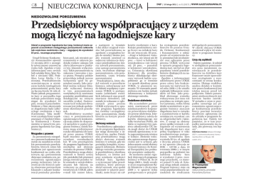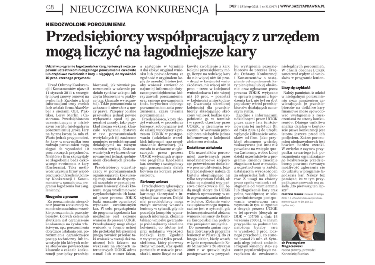 C8 NIEUCZCIWA KONKURENCJA DGP | 15 lutego 2011 | nr 31 (2917) | WWW.GAZETAPRAWNA.PL NIEDOZWOLONE POROZUMIENIA Przedsiębiorcy współpracujący z urzędem mogą liczyć na łagodniejsze kary Udział w programie łagodzenia kar (ang. leniency) może zapewnić uczestnikom nielegalnego porozumienia całkowite lub częściowe zwolnienie z kary – sięgającej do wysokości 10 proc. rocznego przychodu Urząd Ochrony Konkurencji i Konsumentów ujawnił 11 stycznia 2011 r. szczegóły nowej zmowy cenowej na rynku farb. Zgodnie z tymi informacjami ceny swoich farb ustalała firma Akzo Nobel z sieciami OBI, Praktiker, Leroy Merlin i Castorama. Przedsiębiorcom uczestniczącym w niniejszym kartelu (nielegalnym porozumieniu) grożą kary na łączną kwotę 54 mln zł. Warto jednak przypomnieć, że kary w przypadku tego rodzaju porozumień mogą sięgać do wysokości 10 proc. rocznych przychodów. Niektóre z firm skorzystały ze złagodzenia bądź całkowitego zwolnienia z kary (Castorama). Taką możliwość uzyskują firmy współpracujące z Urzędem Ochrony Konkurencji i Konsumentów w ramach tzw. programu łagodzenia kar (ang. leniency). Niezgodne z prawem Za porozumienia niezgodne z prawem konkurencji rozumie się zasadniczo wszelkie porozumienia przedsiębiorstw, których celem lub skutkiem jest ograniczenie konkurencji na rynku właściwym, np.: porozumienia dotyczące ustalania cen, porozumienia ograniczające postęp techniczny lub inwestycje (do których należą stosowane powszechnie klauzule o zakazie konkurencji pomiędzy przedsię- biorcami), jak również porozumienia w zakresie podziału rynków zakupu lub zbytu (stosowane w praktyce tzw. klauzule wyłączności). Takie porozumienia są zakazane i nieważne z mocy prawa. Przepisy polskie przewidują jednak pewne wyłączenia spod tej generalnej zasady. Jako przykład można wskazać klauzule wyłącznej dostawy w tzw. porozumieniach wertykalnych (tj. zawierane pomiędzy przedsiębiorcami działającymi na różnym szczeblu rynku). Zastosowanie tych wyłączeń obwarowane jest jednak spełnieniem określonych przesłanek. Przedsiębiorcy uczestniczący w porozumieniach ograniczających konkurencję mają zatem do dyspozycji narzędzie w postaci programu leniency, dzięki któremu mogą wyeliminować ryzyko obciążenia ich karami przez prezesa UOKiK bądź znacznie ograniczyć wysokość ewentualnych kar. W celu przystąpienia do programu łagodzenia kar niezbędne jest złożenie wniosku do prezesa UOKiK. Przedsiębiorcy mogą złożyć wniosek w formie ustnej (do protokołu) lub pisemnej (mogą również przesłać taki wniosek w wersji elektronicznej lub faksem na wskazany na stronach internetowych UOKiK adres e-mail lub numer faksu, a następnie w terminie 3 dni złożyć oryginał wniosku lub poświadczoną za zgodność z oryginałem kopię do urzędu). Istotne jest, aby wniosek zawierał co najmniej informacje dotyczące przedsiębiorców, którzy zawarli porozumienie, oraz samego porozumienia (min. terytorium objętego porozumieniem, celu porozumienia, czasu trwania porozumienia). Przedsiębiorca, który złożył wniosek w procedurze leniency, zobowiązany jest do dalszej współpracy z prezesem UOKiK w postępowaniu (udzielanie wszelkich informacji oraz przedstawianie dowodów). Jak zostało to wskazane w ogłoszonych przez prezesa UOKiK wytycznych w sprawie programu łagodzenia kar, rzetelny i szczegółowy opis porozumienia działa bowiem na korzyść przedsiębiorcy. Skrócony wniosek Przedsiębiorcy zgłaszający się do programu łagodzenia kar mogą skorzystać z instytucji tzw. marker. Dzięki niej przedsiębiorcy mogą złożyć skrócony wniosek leniency w sytuacji, gdy nie posiadają kompletu wymaganych informacji. Złożenie takiego wniosku gwarantuje przedsiębiorcy określoną kolejność, co istotne jest przy ustalaniu wysokości redukcji kary. Zgodnie z wytycznymi tylko przedsiębiorca, który pierwszy złożył wniosek, oraz spełni pozostałe w ustawie przesłanki, może liczyć na cał- kowite zwolnienie z kary. Kolejni przedsiębiorcy mogą liczyć na redukcję kary do nie więcej niż: 50 proc. – drugi w kolejności wnioskodawca, nie więcej niż 30 proc. – trzeci w kolejności wnioskodawca i nie więcej niż 20 proc. – pozostali w kolejności wnioskodawcy. Gwarancją określonej kolejności dla przedsiębiorcy składającego skrócony wniosek będzie uzupełnienie go w terminie i w sposób określony przez UOKiK, w pisemnym wezwaniu. W wezwaniu przedsiębiorca nie będzie jednak informowany o kolejności złożonego wniosku. Dodatkowe ułatwienia Dla uczestników porozumień zawieranych przez międzynarodowe korporacje przewidziano dodatkowo pewne ułatwienia. Jeżeli przedsiębiorcy należą do kartelu obejmującego nie tylko terytorium Polski, ale także co najmniej trzy państwa członkowskie UE, będą mogli złożyć do UOKiK wniosek uproszczony, w celu zagwarantowania miejsca w kolejce. Złożenie wniosku uproszczonego dopuszczalne jest w sytuacji, gdy jednocześnie został złożony wniosek leniency do Komisji Europejskiej (na podstawie przepisów unijnych). Do momentu zmian regulacji dotyczących programu leniency w Polsce (tj. do 24 lutego 2009 r., kiedy weszły w życie rozporządzenie Rady Ministrów z 26 stycznia 2009 r. w sprawie trybu postępowania w przypad- ku wystąpienia przedsiębiorców do prezesa Urzędu Ochrony Konkurencji i Konsumentów o odstąpienie od wymierzenia kary pieniężnej lub jej obniżenie oraz ogłoszone przez prezesa UOKiK wytyczne w sprawie programu łagodzenia kar), nie był on zbyt popularny wśród przedsiębiorców działających na naszym rynku. Zgodnie z informacjami udzielonymi przez UOKiK przez cztery lata funkcjonowania tej instytucji (tj. od roku 2004 r.) do urzędu wpłynęło kilkanaście wniosków od firm. Jako przykład złożonego wniosku wskazywana jest inna niż powołana na wstępie sprawa Castoramy, wobec której dzięki uczestnictwie