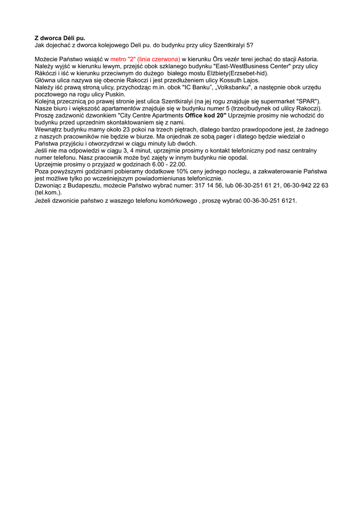 Z dworca Déli pu. Jak dojechać z dworca kolejowego Deli pu. do budynku przy ulicy Szentkiralyi 5? Możecie Państwo wsiąść w metro "2" (linia czerwona) w kierunku Örs vezér terei jechać do stacji Astoria. Należy wyjść w kierunku lewym, przejść obok szklanego budynku "East-WestBusiness Center" przy ulicy Rákóczi i iść w kierunku przeciwnym do dużego białego mostu Elżbiety(Erzsebet-hid). Główna ulica nazywa się obecnie Rakoczi i jest przedłużeniem ulicy Kossuth Lajos. Należy iść prawą stroną ulicy, przychodząc m.in. obok "IC Banku”, „Volksbanku", a następnie obok urzędu pocztowego na rogu ulicy Puskin. Kolejną przecznicą po prawej stronie jest ulica Szentkiralyi (na jej rogu znajduje się supermarket "SPAR"). Nasze biuro i większość apartamentów znajduje się w budynku numer 5 (trzecibudynek od ulilcy Rakoczi). Proszę zadzwonić dzwonkiem "City Centre Apartments Office kod 20" Uprzejmie prosimy nie wchodzić do budynku przed uprzednim skontaktowaniem się z nami. Wewnątrz budynku mamy około 23 pokoi na trzech piętrach, dlatego bardzo prawdopodone jest, że żadnego z naszych pracowników nie będzie w biurze. Ma onjednak ze sobą pager i dlatego będzie wiedział o Państwa przyjściu i otworzydrzwi w ciągu minuty lub dwóch. Jeśli nie ma odpowiedzi w ciągu 3, 4 minut, uprzejmie prosimy o kontakt telefoniczny pod nasz centralny numer telefonu. Nasz pracownik może być zajęty w innym budynku nie opodal. Uprzejmie prosimy o przyjazd w godzinach 6.00 - 22.00. Poza powyższymi godzinami pobieramy dodatkowe 10% ceny jednego noclegu, a zakwaterowanie Państwa jest możliwe tylko po wcześniejszym powiadomieniunas telefonicznie. Dzwoniąc z Budapesztu, możecie Państwo wybrać numer: 317 14 56, lub 06-30-251 61 21, 06-30-942 22 63 (tel.kom.). Jeżeli dzwonicie państwo z waszego telefonu komórkowego , proszę wybrać 00-36-30-251 6121.