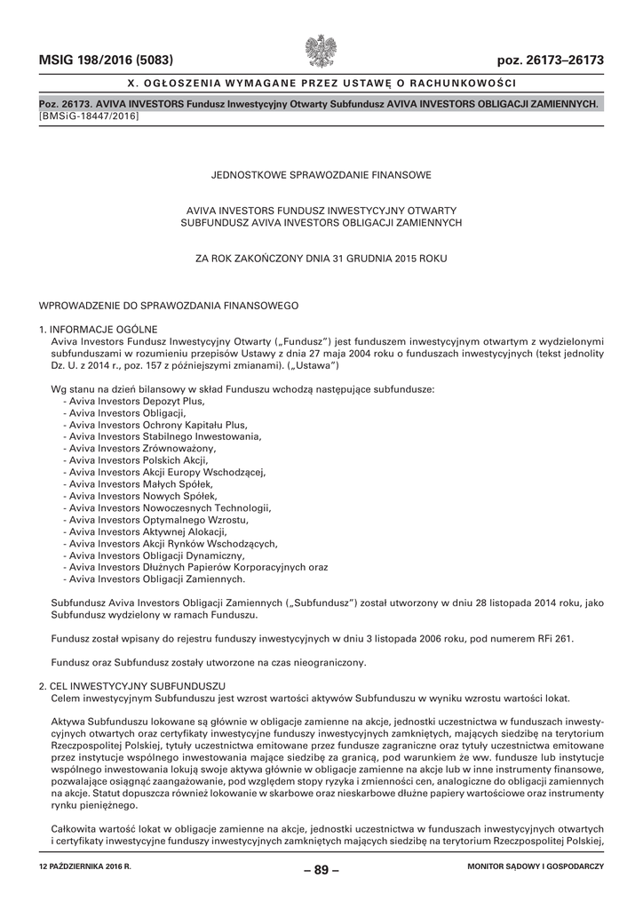 MSIG 198/2016 (5083) poz. 26173–26173 X . O G Ł O S Z E N I A W Y M A G A N E P R Z E Z U S TAW Ę O R A C H U N K O W O Ś C I Poz. 26173. AVIVA INVESTORS Fundusz Inwestycyjny Otwarty Subfundusz AVIVA INVESTORS OBLIGACJI ZAMIENNYCH. [BMSiG-18447/2016] JEDNOSTKOWE SPRAWOZDANIE FINANSOWE AVIVA INVESTORS FUNDUSZ INWESTYCYJNY OTWARTY SUBFUNDUSZ AVIVA INVESTORS OBLIGACJI ZAMIENNYCH ZA ROK ZAKOŃCZONY DNIA 31 GRUDNIA 2015 ROKU WPROWADZENIE DO SPRAWOZDANIA FINANSOWEGO 1. INFORMACJE OGÓLNE Aviva lnvestors Fundusz Inwestycyjny Otwarty („Fundusz”) jest funduszem inwestycyjnym otwartym z wydzielonymi subfunduszami w rozumieniu przepisów Ustawy z dnia 27 maja 2004 roku o funduszach inwestycyjnych (tekst jednolity Dz. U. z 2014 r., poz. 157 z późniejszymi zmianami). („Ustawa”) Wg stanu na dzień bilansowy w skład Funduszu wchodzą następujące subfundusze: - Aviva lnvestors Depozyt Plus, - Aviva lnvestors Obligacji, - Aviva lnvestors Ochrony Kapitału Plus, - Aviva lnvestors Stabilnego Inwestowania, - Aviva lnvestors Zrównoważony, - Aviva lnvestors Polskich Akcji, - Aviva lnvestors Akcji Europy Wschodzącej, - Aviva lnvestors Małych Spółek, - Aviva lnvestors Nowych Spółek, - Aviva lnvestors Nowoczesnych Technologii, - Aviva lnvestors Optymalnego Wzrostu, - Aviva lnvestors Aktywnej Alokacji, - Aviva lnvestors Akcji Rynków Wschodzących, - Aviva lnvestors Obligacji Dynamiczny, - Aviva lnvestors Dłużnych Papierów Korporacyjnych oraz - Aviva lnvestors Obligacji Zamiennych. Subfundusz Aviva Investors Obligacji Zamiennych („Subfundusz”) został utworzony w dniu 28 listopada 2014 roku, jako Subfundusz wydzielony w ramach Funduszu. Fundusz został wpisany do rejestru funduszy inwestycyjnych w dniu 3 listopada 2006 roku, pod numerem RFi 261. Fundusz oraz Subfundusz zostały utworzone na czas nieograniczony. 2. CEL INWESTYCYJNY SUBFUNDUSZU Celem inwestycyjnym Subfunduszu jest wzrost wartości aktywów Subfunduszu w wyniku wzrostu wartości lokat. Aktywa Subfunduszu lokowane są głównie w obligacje zamienne na akcje, jednostki uczestnictwa w funduszach inwestycyjnych otwartych oraz certyfikaty inwestycyjne funduszy inwestycyjnych zamkniętych, mających siedzibę na terytorium Rzeczpospolitej Polskiej, tytuły uczestnictwa emitowane przez fundusze zagraniczne oraz tytuły uczestnictwa emitowane przez instytucje wspólnego inwestowania mające siedzibę za granicą, pod warunkiem że ww. fundusze lub instytucje wspólnego inwestowania lokują swoje aktywa głównie w obligacje zamienne na akcje lub w inne instrumenty finansowe, pozwalające osiągnąć zaangażowanie, pod względem stopy ryzyka i zmienności cen, analogiczne do obligacji zamiennych na akcje. Statut dopuszcza również lokowanie w skarbowe oraz nieskarbowe dłużne papiery wartościowe oraz instrumenty rynku pieniężnego. Całkowita wartość lokat w obligacje zamienne na akcje, jednostki uczestnictwa w funduszach inwestycyjnych otwartych i certyfikaty inwestycyjne funduszy inwestycyjnych zamkniętych mających siedzibę na terytorium Rzeczpospolitej Polskiej, 12 PAŹDZIERNIKA 2016 R. – 89 – MONITOR SĄDOWY I GOSPODARCZY MSIG 198/2016 (5083) poz. 26173–26173 X . O G Ł O S Z E N I A W Y M A G A N E P R Z E Z U S TAW Ę O R A C H U N K O W O Ś C I tytuły uczestnictwa emitowane przez fundusze zagraniczne, tytuły uczestnictwa emitowane przez instytucje wspólnego inwestowania mające siedzibę za granicą, będzie nie niższa niż 70% i może wynieść 100% wartości aktywów Subfunduszu. Subfundusz może lokować aktywa Subfunduszu w tytuły uczestnictwa emitowane przez fundusze zagraniczne Grupy Aviva, przy czym całkowita wartość tych lokat będzie nie wyższa niż 40% wartości aktywów Subfunduszu. Całkowita wartość lokat w dłużnych papierach wartościowych, instrumentach rynku pieniężnego oraz lokat w tytułach uczestnictwa o charakterze dłużnym emitowanych przez fundusze zagraniczne lub przez instytucje wspólnego inwestowania mające siedzibę za granicą, innych niż określone powyżej, będzie nie większa niż 30% wartości aktywów Subfunduszu. Całkowita wartość lokat w akcje wydawane w zamian za obligacje nie przekroczy 10% aktywów Subfunduszu. 3. TOWARZYSTWO FUNDUSZY INWESTYCYJNYCH Organem zarządzającym Funduszem jest Aviva Investors Poland Towarzystwo Funduszy Inwestycyjnych S.A. („Towarzystwo”) z siedzibą w Warszawie, ul. Domaniewska 44, 02-672 Warszawa, wpisane do Krajowego Rejestru Sądowego pod numerem 0000011017. Sądem rejestrowym dla Towarzystwa jest Sąd Rejonowy dla m.st. Warszawy, XIII Wydział Gospodarczy Krajowego Rejestru Sądowego. 4. OKRES SPRAWOZDAWCZY I DZIEŃ BILANSOWY Sprawozdanie finansowe Subfunduszu zostało sporządzone za okres od dnia 1 stycznia 2015 roku do dnia 31 grudnia 2015 roku. Dniem bilansowym jest 31 grudnia 2015 roku. 5. KONTYNUACJA DZIAŁALNOŚCI Sprawozdanie finansowe Subfunduszu zostało sporządzone przy założeniu kontynuowania działalności przez Subfundusz oraz Fundusz w dającej się przewidzieć przyszłości, tj. co najmniej 12 miesięcy po dniu 31 grudnia 2015 roku. Zarząd Towarzystwa nie stwierdza na dzień podpisania sprawozdania finansowego Subfunduszu oraz połączonego sprawozdania finansowego Funduszu istnienia faktów i okoliczności, które wskazywałyby na zagrożenie kontynuowania działalności przez Subfundusz lub Fundusz w okresie co najmniej 12 miesięcy po dniu bilansowym, czyli 31 grudnia 2015 roku na skutek zamierzonego lub przymusowego zaniechania bądź istotnego ograniczenia działalności Subfunduszu lub Funduszu. 6. PODMIOT, KTÓRY PRZEPROWADZIŁ BADANIE SPRAWOZDANIA FINANSOWEGO Niniejsze sprawozdanie finansowe podlegało badaniu przez biegłego rewidenta. Badania sprawozdania finansowego dokonała firma PricewaterhouseCoopers Sp. z o.o. z siedzibą w Warszawie, al. Armii Ludowej 14, wpisana na listę podmiotów uprawnionych do badania sprawozdań finansowych pod numerem 144. 7. KATEGORIE JEDNOSTEK