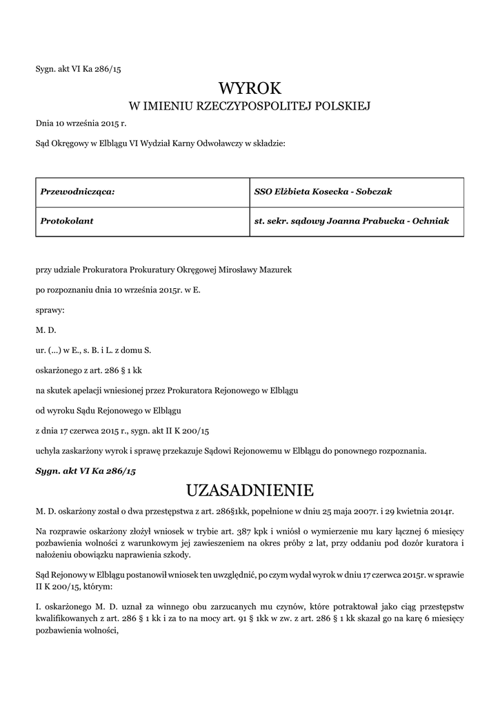 Sygn. akt VI Ka 286/15 WYROK W IMIENIU RZECZYPOSPOLITEJ POLSKIEJ Dnia 10 września 2015 r. Sąd Okręgowy w Elblągu VI Wydział Karny Odwoławczy w składzie: Przewodnicząca: SSO Elżbieta Kosecka - Sobczak Protokolant st. sekr. sądowy Joanna Prabucka - Ochniak przy udziale Prokuratora Prokuratury Okręgowej Mirosławy Mazurek po rozpoznaniu dnia 10 września 2015r. w E. sprawy: M. D. ur. (...) w E., s. B. i L. z domu S. oskarżonego z art. 286 § 1 kk na skutek apelacji wniesionej przez Prokuratora Rejonowego w Elblągu od wyroku Sądu Rejonowego w Elblągu z dnia 17 czerwca 2015 r., sygn. akt II K 200/15 uchyla zaskarżony wyrok i sprawę przekazuje Sądowi Rejonowemu w Elblągu do ponownego rozpoznania. Sygn. akt VI Ka 286/15 UZASADNIENIE M. D. oskarżony został o dwa przestępstwa z art. 286§1kk, popełnione w dniu 25 maja 2007r. i 29 kwietnia 2014r. Na rozprawie oskarżony złożył wniosek w trybie art. 387 kpk i wniósł o wymierzenie mu kary łącznej 6 miesięcy pozbawienia wolności z warunkowym jej zawieszeniem na okres próby 2 lat, przy oddaniu pod dozór kuratora i nałożeniu obowiązku naprawienia szkody. Sąd Rejonowy w Elblągu postanowił wniosek ten uwzględnić, po czym wydał wyrok w dniu 17 czerwca 2015r. w sprawie II K 200/15, którym: I. oskarżonego M. D. uznał za winnego obu zarzucanych mu czynów, które potraktował jako ciąg przestępstw kwalifikowanych z art. 286 § 1 kk i za to na mocy art. 91 § 1kk w zw. z art. 286 § 1 kk skazał go na karę 6 miesięcy pozbawienia wolności, II. na podstawie art. 69 § 1 i 2 kk w zw. z art. 70 § 1 pkt. 1 kk wykonanie orzeczonej w punkcie I kary pozbawienia wolności warunkowo zawiesił na okres próby 2 lat, III. na podstawie art. 73 § 1 kk oddał oskarżonego M. D. pod dozór kuratora w okresie próby, IV. na podstawie art. 72 § 2 kk zobowiązał oskarżonego M. D. do naprawienia szkody w całości poprzez zapłatę na rzecz pokrzywdzonego S. Bank z/ s w W. kwoty 1.000 złotych i na rzecz pokrzywdzonego S. C. Bank z/s we W. kwoty 850 złotych w terminie 2 lat od uprawomocnienia się wyroku. Nadto zwolnił oskarżonego od ponoszenia kosztów sądowych. Apelację od powyższego wyroku wniósł Prokurator Rejonowy w Elblągu zaskarżając orzeczenie o karze na niekorzyść oskarżonego. W apelacji na zasadzie art. 427 kpk i art. 438 pkt. 1 kpk zarzucił wyrokowi obrazę przepisów prawa materialnego tj. art. 91 §1 kk poprzez niezasadne przyjęcie, że czyny przypisane oskarżonemu M. D. zostały popełnione w warunkach ciągu przestępstw podczas gdy kilkuletni odstęp czasu jaki dzielił oba występki nie pozwalał na zastosowanie tej instytucji prawnokarnej. Stawiając taki zarzut skarżący wniósł o zmianę wyroku Sądu Rejonowego w Elblągu z dnia 17 czerwca 2015 r. w sprawie II K 200/15 w pkt I i II poprzez uznanie, że oskarżony dopuścił się popełnienia dwóch przestępstw z art. 286§1 kk i wymierzenie oskarżonemu za czyn zarzucany mu w pkt I kary 6 miesięcy pozbawienia wolności, za czyn zarzucany mu w pkt II kary 6 miesięcy pozbawienia wolności oraz orzeczenie na podstawie art. 85§1 kk i art. 86§1 kk kary łącznej 8 miesięcy pozbawienia wolności z warunkowym zawieszeniem jej wykonania na okres próby lat 2 (art. 69§1 i 2 kk w zw. z art. 70§1 pkt 1 kk), zaś w pozostałym zakresie pozostawienie wyroku bez zmian. Natomiast prokurator sesyjny zmodyfikował wniosek końcowy i wniósł o uchylenie zaskarżonego wyroku i przekazanie sprawy sądowi I instancji do ponownego rozpoznania. Sąd Okręgowy zważył, co następuje: Apelacja Prokuratora Rejonowego jako zasadna zasługiwała na uwzględnienie, gdyż rozpoznając przedmiotową sprawę Sąd Rejonowy, dopuścił się uchybienia prawa, przy czym uwzględnienie apelacji skutkować musiało uchyleniem zaskarżonego orzeczenia. Sąd Odwoławczy podzielił zasadność zarzutu podniesionego w apelacji przez Prokuratora odnośnie naruszenia przez Sąd Rejonowy prawa tj. art. 91§1kk. Dla przyjęcia, że dane przestępstwa zostały popełnione w warunkach ciągu przestępstw, to muszą zostać spełnione wymienione w ww przepisie przesłanki, a należą do nich: a) podobny sposób popełnienia przestępstw składających się na ciąg; b) krótkie odstępy czasu, w jakich są one popełniane; c) tożsamość kwalifikacji każdego z przestępstw składających się na ciąg. Wymienione wyżej przesłanki ciągu przestępstw mają charakter taksatywny, co oznacza konieczność ich jednoczesnej realizacji. Przypisując oskarżonemu winę popełnienia zarzucanych mu przestępstw, których M. D. miał się dopuścić w 2007r. i 2014r., to Sąd Rejonowy przyjął, że przestępstwa te pozostają w ciągu przestępstw z art. 91§1kk. Jednak już po wydaniu wyroku, to sąd I instancji w pisemnym uzasadnieniu zaskarżonego wyroku, wskazał że faktycznie popełnił błąd przyjmując, że oba przestępstwa z art. 286§1kk przypisane oskarżonemu popełnione zostały w warunkach art. 91§1kk, bo nie można przyjąć by spełniona została przesłanka popełnienia przestępstw w krótkich odstępach czasu. Z pewnością stanowisko takie zasługuje na uwzględnienie bowiem 7-letni odstęp pomiędzy poszczególnymi przestępstwami z art. 286§1 kk nie może być utożsamiony z krótkim odstępem czasu. Dlatego należy stwierdzić, że przyjęcie przez sąd orzekający w zaskarżonym wyroku instytucji z art. 91§1kk było błędne, niezgodne z treścią tego przepisu, a więc niewątpliwie nastąpiło z obrazą art. 91§1kk. Stwierdzenie jednak tego naruszenia nie mogło doprowadzić do postulowanej przez autora apelacji zmiany zaskarżonego wyroku. Nie można bowiem zapominać, że zapadł on w warunkach uwzględnienia wniosku oskarżonego złożonego w trybie art. 387kpk. Oskarżony nie stawił się na rozprawę apelacyjną, a tymczasem oskarżyciel w apelacji domagał się znacznej modyfikacji wyroku, m.in. poprzez przyjęcie, że oskarżony dopuścił s