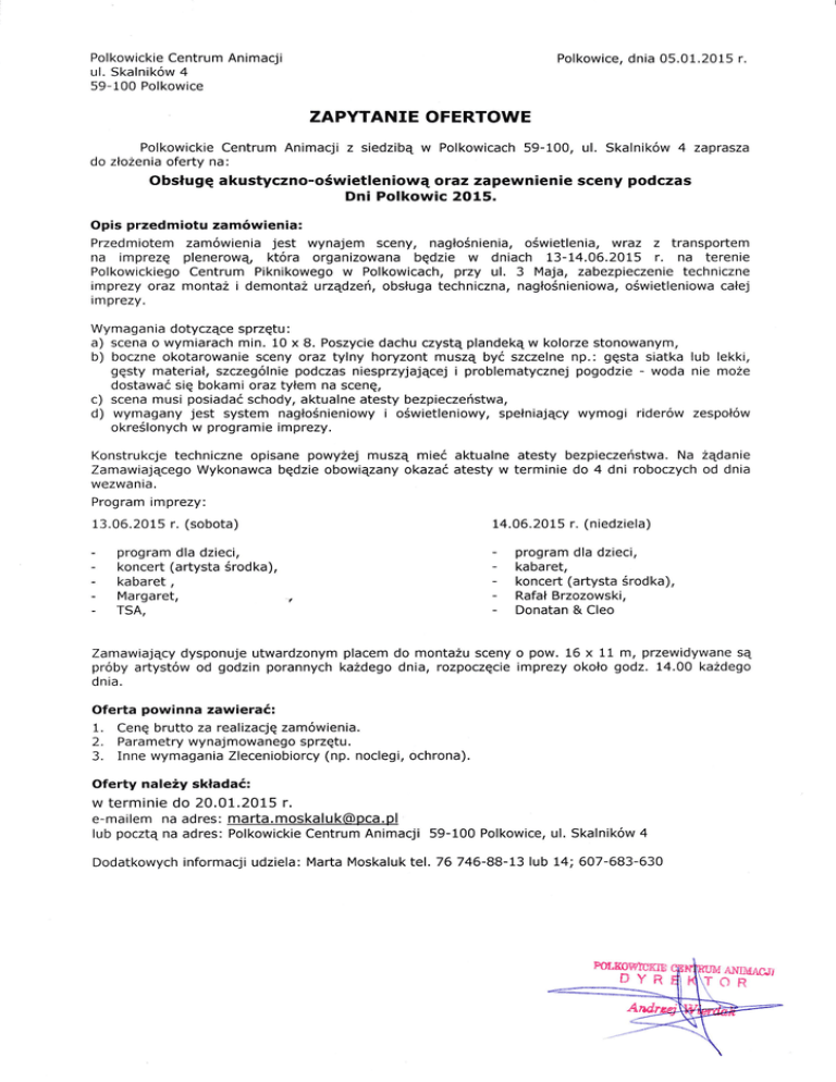 kowickie Centrum Animacji ul. Skalników 4 59-100 Polkowice Polkowice, dnia 05.01,2015 Pol r. ZAPYTANIE OFERTOWE Polkowickie Centrum Animacji do złozenia oferty na: z siedzibą w Polkowicach 59-100, ul. Skalników 4 zaprasza Obsługę akustyczno-oświetleniową oraz zapewnienie sceny podczas Dni Polkowic 2O15, Opis przedmiotu zamówienia: Przedmiotem zamówienia jest wynajem sceny, nagłośnienia, oświetlenia, wraz z transportem na imprezę plenerową która organizowana będzie w dniach 13-14.06.2015 r. na terenie Polkowickiego Centrum Piknikowego w Polkowicach, przy ul. 3 Maja, zabezpieczenie techniczne imprezy oraz montaż i demontaż urządzeń, obsługa techniczna, nagłośnieniowa.oświetleniowa całej imprezy. Wymagania dotyczące sprzętu : a) scena o wymiarach min, 10 x B. Poszycie dachu czystą plandeką w kolorze stonowanym, b) boczne okotarowanie sceny oraz tylny horyzont muszą być szczelne np.: gęsta siatka lub lekki, gęsty materiał, szczególnie podczas niesprzyjającej i problematycznej pogodzie - woda nie może dostawać się bokami oraz tyłem na scenę/ c) scena musi posiadać schody, aktualne atesty bezpieczeństwa, d) wymagany jest system nagłośnieniowyi oświetleniowy, spełniający wymogi riderów zespołów określonych w programie imprezy. Konstrukcje techniczne opisane powyzej muszą mieć aktualne atesty bezpieczeństwa, Na żądanie Zamawiającego Wykonawca będzie obowiązany okazać atesty w terminie do 4 dni roboczych od dnia wezwania. Program imprezy: 13.06.2015 r, (sobota) 14.06,2015 r. (niedziela) - - program dla dzieci, koncert (artysta środka), kabaret, Margaret, TSA, program dla dzieci, kabaret, koncert (artysta środka), Rafał Brzozowski, Donatan & Cleo Zamawiający dysponuje utwardzonym placem do montażu sceny o pow. 16 x 11 m, przewidywane są próby artystów od godzin porannych każdego dnia, rozpoczęcie imprezy około godz. 14.00 każdego dnia, Oferta powinna zawierać: 1. 2. 3, Cenę brutto za realizację zamówienia, Parametry wynajmowanego sprzętu. Inne wymagania Zleceniobiorcy (np, noclegi, ochrona). Oferty należy składać: w terminie do 20.01.2015 r, e-mailem na adres: [email protected] lub pocztą na adres: Polkowickie Centrum Animacji 59-100 Polkowice, ul, Skalników 4 Dodatkowych informacji udziela: Marta Moskaluk tel, 76 746-88-13 lub 14; 607-683-630 ANI}dAcJi