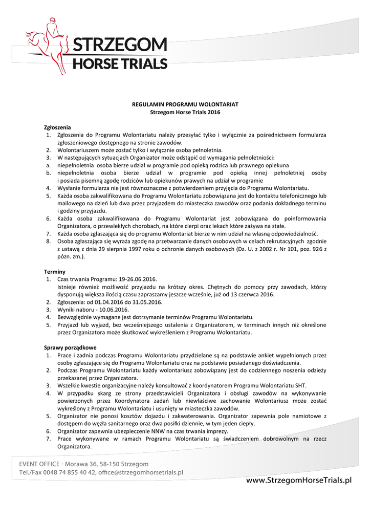 REGULAMIN PROGRAMU WOLONTARIAT Strzegom Horse Trials 2016 Zgłoszenia 1. Zgłoszenia do Programu Wolontariatu należy przesyład tylko i wyłącznie za pośrednictwem formularza zgłoszeniowego dostępnego na stronie zawodów. 2. Wolontariuszem może zostad tylko i wyłącznie osoba pełnoletnia. 3. W następujących sytuacjach Organizator może odstąpid od wymagania pełnoletniości: a. niepełnoletnia osoba bierze udział w programie pod opieką rodzica lub prawnego opiekuna b. niepełnoletnia osoba bierze udział w programie pod opieką innej pełnoletniej osoby i posiada pisemną zgodę rodziców lub opiekunów prawych na udział w programie 4. Wysłanie formularza nie jest równoznaczne z potwierdzeniem przyjęcia do Programu Wolontariatu. 5. Każda osoba zakwalifikowana do Programu Wolontariatu zobowiązana jest do kontaktu telefonicznego lub mailowego na dzieo lub dwa przez przyjazdem do miasteczka zawodów oraz podania dokładnego terminu i godziny przyjazdu. 6. Każda osoba zakwalifikowana do Programu Wolontariat jest zobowiązana do poinformowania Organizatora, o przewlekłych chorobach, na które cierpi oraz lekach które zażywa na stałe. 7. Każda osoba zgłaszająca się do programu Wolontariat bierze w nim udział na własną odpowiedzialnośd. 8. Osoba zgłaszająca się wyraża zgodę na przetwarzanie danych osobowych w celach rekrutacyjnych zgodnie z ustawą z dnia 29 sierpnia 1997 roku o ochronie danych osobowych (Dz. U. z 2002 r. Nr 101, poz. 926 z pózn. zm.). Terminy 1. Czas trwania Programu: 19-26.06.2016. Istnieje również możliwośd przyjazdu na krótszy okres. Chętnych do pomocy przy zawodach, którzy dysponują większa ilością czasu zapraszamy jeszcze wcześnie, już od 13 czerwca 2016. 2. Zgłoszenia: od 01.04.2016 do 31.05.2016. 3. Wyniki naboru - 10.06.2016. 4. Bezwzględnie wymagane jest dotrzymanie terminów Programu Wolontariatu. 5. Przyjazd lub wyjazd, bez wcześniejszego ustalenia z Organizatorem, w terminach innych niż określone przez Organizatora może skutkowad wykreśleniem z Programu Wolontariatu. Sprawy porządkowe 1. Prace i zadnia podczas Programu Wolontariatu przydzielane są na podstawie ankiet wypełnionych przez osoby zgłaszające się do Programu Wolontariatu oraz na podstawie posiadanego doświadczenia. 2. Podczas Programu Wolontariatu każdy wolontariusz zobowiązany jest do codziennego noszenia odzieży przekazanej przez Organizatora. 3. Wszelkie kwestie organizacyjne należy konsultowad z koordynatorem Programu Wolontariatu SHT. 4. W przypadku skarg ze strony przedstawicieli Organizatora i obsługi zawodów na wykonywanie powierzonych przez Koordynatora zadao lub niewłaściwe zachowanie Wolontariusz może zostad wykreślony z Programu Wolontariatu i usunięty w miasteczka zawodów. 5. Organizator nie ponosi kosztów dojazdu i zakwaterowania. Organizator zapewnia pole namiotowe z dostępem do węzła sanitarnego oraz dwa posiłki dziennie, w tym jeden ciepły. 6. Organizator zapewnia ubezpieczenie NNW na czas trwania imprezy. 7. Prace wykonywane w ramach Programu Wolontariatu są świadczeniem dobrowolnym na rzecz Organizatora. Zadania dla Wolontariuszy 1. Biuro zawodów – obsługa zawodników i osób oficjalnych 2. Biuro Prasowe – obsługa przedstawicieli mediów 3. Stajnie – obsługa zawodników, prace porządkowe 4. Stewardzi – obsługa rozprężani i placów treningowych, asystowanie stewardom 5. Dekorowanie przeszkód na crossie – ustawianie kwiatów, drzewek 6. Informacja – obsługa punktów informacyjnych dla publiczności 7. Sekretarz ujeżdżenia – osoby anglojęzyczne, sekretarzowanie przy konkursie ujeżdżenia. 8. Obsługa komputerowa konkursów ujeżdżenia – komputerowe wprowadzenie wyników. 9. Obsługa czworoboku – otwieranie płotków, noszenie napojów, noszenie protokołów. 10. Sędziowie przeszkodowi – asystowanie sędziom przeszkodowym podczas próby terenowej. 11. Obsługa cross – porządkowi na przejściach dla publiczności 12. Obsługa parkuru – podnoszenie drągów, noszenie napojów, poprawianie dekoracji, wpuszczanie koni na parkur 13. Ankieterzy – przeprowadzanie ankiet wśród publiczności 14. VIP – obsługa recepcji VIP