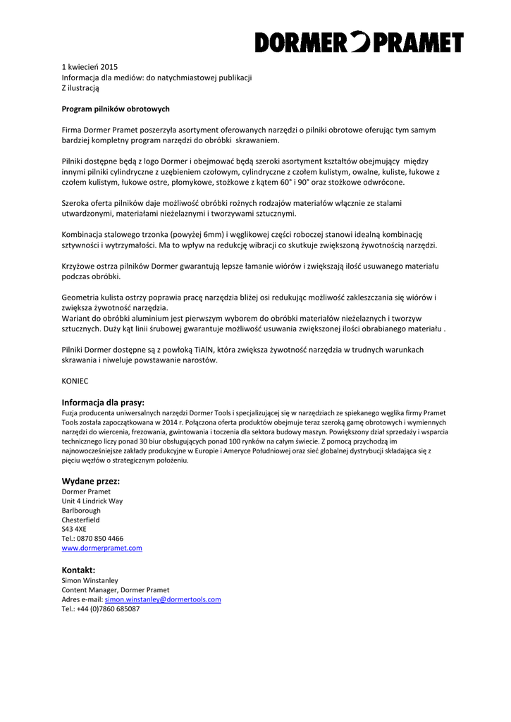 1 kwiecień 2015 Informacja dla mediów: do natychmiastowej publikacji Z ilustracją Program pilników obrotowych Firma Dormer Pramet poszerzyła asortyment oferowanych narzędzi o pilniki obrotowe oferując tym samym bardziej kompletny program narzędzi do obróbki skrawaniem. Pilniki dostępne będą z logo Dormer i obejmować będą szeroki asortyment kształtów obejmujący między innymi pilniki cylindryczne z uzębieniem czołowym, cylindryczne z czołem kulistym, owalne, kuliste, łukowe z czołem kulistym, łukowe ostre, płomykowe, stożkowe z kątem 60° i 90° oraz stożkowe odwrócone. Szeroka oferta pilników daje możliwość obróbki rożnych rodzajów materiałów włącznie ze stalami utwardzonymi, materiałami nieżelaznymi i tworzywami sztucznymi. Kombinacja stalowego trzonka (powyżej 6mm) i węglikowej części roboczej stanowi idealną kombinację sztywności i wytrzymałości. Ma to wpływ na redukcję wibracji co skutkuje zwiększoną żywotnością narzędzi. Krzyżowe ostrza pilników Dormer gwarantują lepsze łamanie wiórów i zwiększają ilość usuwanego materiału podczas obróbki. Geometria kulista ostrzy poprawia pracę narzędzia bliżej osi redukując możliwość zakleszczania się wiórów i zwiększa żywotność narzędzia. Wariant do obróbki aluminium jest pierwszym wyborem do obróbki materiałów nieżelaznych i tworzyw sztucznych. Duży kąt linii śrubowej gwarantuje możliwość usuwania zwiększonej ilości obrabianego materiału . Pilniki Dormer dostępne są z powłoką TiAlN, która zwiększa żywotność narzędzia w trudnych warunkach skrawania i niweluje powstawanie narostów. KONIEC Informacja dla prasy: Fuzja producenta uniwersalnych narzędzi Dormer Tools i specjalizującej się w narzędziach ze spiekanego węglika firmy Pramet Tools została zapoczątkowana w 2014 r. Połączona oferta produktów obejmuje teraz szeroką gamę obrotowych i wymiennych narzędzi do wiercenia, frezowania, gwintowania i toczenia dla sektora budowy maszyn. Powiększony dział sprzedaży i wsparcia technicznego liczy ponad 30 biur obsługujących ponad 100 rynków na całym świecie. Z pomocą przychodzą im najnowocześniejsze zakłady produkcyjne w Europie i Ameryce Południowej oraz sieć globalnej dystrybucji składająca się z pięciu węzłów o strategicznym położeniu. Wydane przez: Dormer Pramet Unit 4 Lindrick Way Barlborough Chesterfield S43 4XE Tel.: 0870 850 4466 www.dormerpramet.com Kontakt: Simon Winstanley Content Manager, Dormer Pramet Adres e-mail: [email protected] Tel.: +44 (0)7860 685087