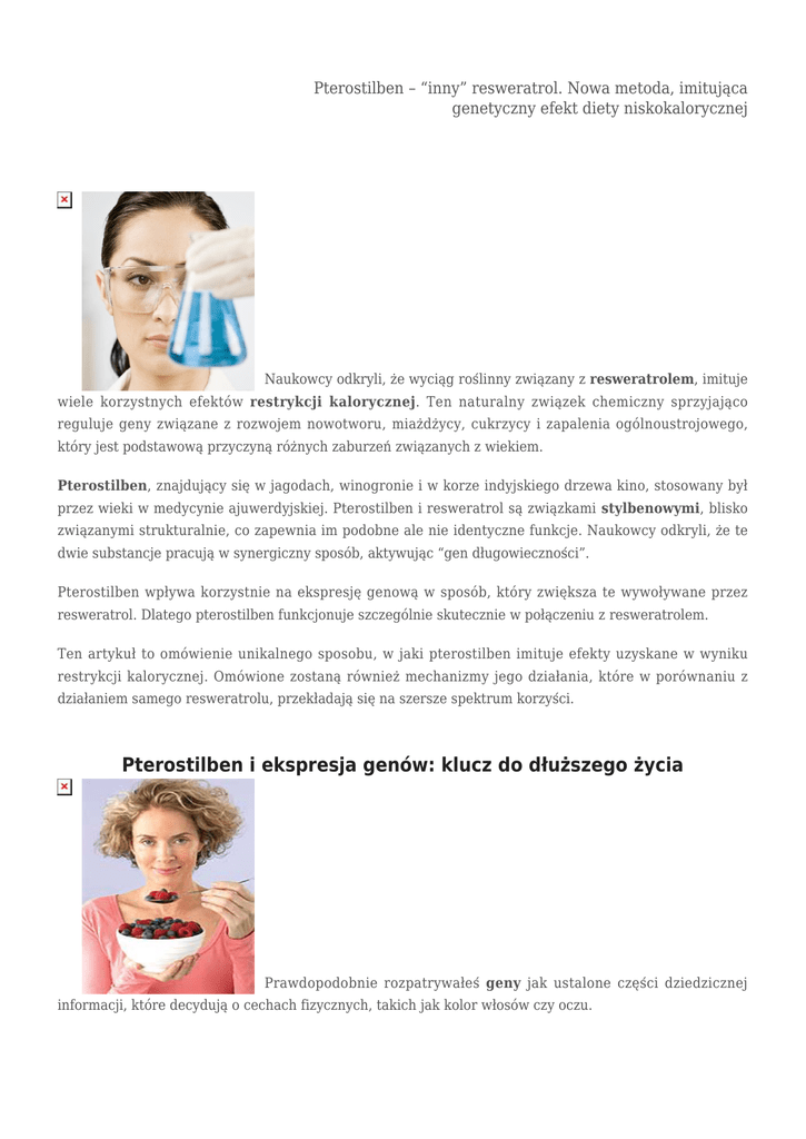 Pterostilben – “inny” resweratrol. Nowa metoda, imitująca genetyczny efekt diety niskokalorycznej Naukowcy odkryli, że wyciąg roślinny związany z resweratrolem, imituje wiele korzystnych efektów restrykcji kalorycznej. Ten naturalny związek chemiczny sprzyjająco reguluje geny związane z rozwojem nowotworu, miażdżycy, cukrzycy i zapalenia ogólnoustrojowego, który jest podstawową przyczyną różnych zaburzeń związanych z wiekiem. Pterostilben, znajdujący się w jagodach, winogronie i w korze indyjskiego drzewa kino, stosowany był przez wieki w medycynie ajuwerdyjskiej. Pterostilben i resweratrol są związkami stylbenowymi, blisko związanymi strukturalnie, co zapewnia im podobne ale nie identyczne funkcje. Naukowcy odkryli, że te dwie substancje pracują w synergiczny sposób, aktywując “gen długowieczności”. Pterostilben wpływa korzystnie na ekspresję genową w sposób, który zwiększa te wywoływane przez resweratrol. Dlatego pterostilben funkcjonuje szczególnie skutecznie w połączeniu z resweratrolem. Ten artykuł to omówienie unikalnego sposobu, w jaki pterostilben imituje efekty uzyskane w wyniku restrykcji kalorycznej. Omówione zostaną również mechanizmy jego działania, które w porównaniu z działaniem samego resweratrolu, przekładają się na szersze spektrum korzyści. Pterostilben i ekspresja genów: klucz do dłuższego życia Prawdopodobnie rozpatrywałeś geny jak ustalone części dziedzicznej informacji, które decydują o cechach fizycznych, takich jak kolor włosów czy oczu. Pterostilben – “inny” resweratrol. Nowa metoda, imitująca genetyczny efekt diety niskokalorycznej Obecnie naukowcy wiedzą, że istnieje możliwość zmiany wiadomości, którą geny przekazują organizmowi. Proces ten nazywamy ekspresją genów. Występuje, kiedy bodźce z wewnątrz lub zewnątrz ciała „przełączają” pewne geny na „włączone” lub „wyłączone”. Włączanie ochronnych genów lub wyłączanie tych szkodliwych (modulowanie ekspresji genów) jest jednym z najbardziej ekscytujących obszarów badań medycznych. Restrykcja kaloryczna włącza geny bezpośrednio odnoszące się do długowieczności, wliczając w to te, które redukują aktywność pewnych czynników promujących nowotwory, te które wywołują zaprogramowaną śmierć komórek nowotworowych oraz te, które odpowiadają za neuroprotekcję.[1] Wiele z tych odpowiadających za dłuższe życie genów, można korzystnie modulować dzięki wyciągom roślinnym, takim jak resweratrol i pterostilben. Jak działa pterostilben i resweratrol Naukowcy ujawnili, że resweratrol aktywuje geny prawie od samego początku molekularnej kaskady, wywołanej dzięki restrykcji kalorycznej. To z kolei aktywuje szereg genów, które zapobiegają powstaniu chorób. W gruncie rzeczy, korzystne genetyczne działanie resweratrolu odbywa się niejako “pod prąd”. Pterostilben natomiast bezpośrednio aktywuje geny “z prądem” z miejsca działania resweratrolu. Uzupełnia to zdolności resweratrolu do zapobiegania nowotworom i cukrzycy oraz wspomagania zdrowych poziomów lipidów krwi. Działając wspólnie, resweratrol i pterostilben wywołują skuteczne, promujące długowieczność efekty dzięki cyklowi ekspresji genów poprzez uzupełniające mechanizmy. Jak pterostilben imituje efekty restrykcji kalorycznej Pterostilben – “inny” resweratrol. Nowa metoda, imitująca genetyczny efekt diety niskokalorycznej Zadziwiające jest to jak dokładnie pterostilben może imitować korzystne efekty restrykcji kalorycznej na poziomie molekularnym. Restrykcja kaloryczna bezpośrednio hamuje geny wywołujące nowotwór oraz wzmacnia te, które blokują rozwój guza.[2] W licznych badaniach wykazano, że pterostilben moduluje dokładnie te same geny, wzmacniając te, które pobudzają zaprogramowaną śmierć komórkową zwaną apoptozą i osłabiając te, które pozwalają komórkom nowotworowym atakować oraz dokonywać metastazy.[3] Restrykcja kaloryczna zmienia ekspresję genów poprzez proces metaboliczny. Zwiększa aktywność kompleksów wyczulonych na tłuszcz (z ang. fat-sensing complexes), co obniża poziom lipidów i cukru we krwi.[4] Pterostilben naturalnie aktywuje te same kompleksy i jak wykazano na chomikach z wysokim cholesterolem, korzystnie wpływa na profile lipidowe.[5] W wątrobie, restrykcja kaloryczna sprzyjająco modyfikuje kilka ważnych, regulujących glukozę enzymów, które pomagają kontrolować poziom cukru we krwi.[6] Pterostilben wywołuje identyczne korzystne zmiany w wielu tych enzymach. Zmniejsza również markery niebezpiecznych białek uszkadzających glukozę (hemoglobina glikozylowana).[7] Restrykcja kaloryczna spektakularnie zmniejsza produkcję zapalnych mediatorów związanych ze stanami chorobowymi osób starszych, takimi jak miażdżyca, przewlekłe choroby zapalne, a nawet spadek kognitywny.[8] Na poziomie ekspresji genów, pterostilben wywołuje identyczne efekty, hamując te same geny w badaniach nad stanami zapalnymi.[9] Jak w przypadku restrykcji kalorycznej, pterostilben wzmacnia określone białka mózgowe związane z poprawą pamięci.[10] Chemoprewencja nowotworów Pterostilben – “inny” resweratrol. Nowa metoda, imitująca genetyczny efekt diety niskokalorycznej Istnieją liczne dowody potwierdzające, że pterostilben ma chemoprewencyjne działanie. Posiada on potężne właściwości przeciwutleniające, równoważne do resweratrolu, a jego przeciwzapalne działania pomaga blokować połączenie – zapalenie/nowotwór.[11] Ponadto, pterostilben hamuje wzrost złośliwych komórek czerniaka u ludzi oraz zapobiega ich metastazie do wątroby, co wykazano w badaniach przeprowadzonych na zwierzętach. W ten sposób zwiększa wskaźnik przeżywalności.[12] Tak, jak w przypadku wielu nutraceutyków, pterostilben osiągnął ten spektakularny efekt dzięki wielu mechanizmom. Hamuje on produkcję molekuł, które komórki now
