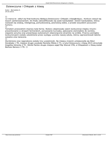 Zespół Szkół Ekonomiczno-Usługowych w Rybniku Dziewczyna i Chłopak z klasą Autor: Bernadeta K. 24.03.2015. 12 marca br. odbył się finał konkursu „Dziewczyna i Chłopak z klasą”. Konkurs cieszył się dużym zainteresowaniem. Do finału zakwalifikowało się sześć kandydatek i dwóch kandydatów, którzy wykazali się wiedzą, inteligencją, pomysłowością, pewnością siebie, a przede wszystkim poczuciem humoru. Tematem przewodnim imprezy była farma. Wybory obejmowały osiem konkurencji między innymi: prezentowanie w strojach farmerskich, porcjowanie kurczaka, pakowanie ziemniaków do worków, wiązanie sznurka oraz prezentacja wykonanych własnoręcznie strachów na wróble. Przerwy pomiędzy konkurencjami zostały uświetnione przez występy uczniów naszej szkoły, którzy zaprezentowali talenty wokalne oraz taneczne. Wyróżnione oraz nagrodzone zostały trzy uczestniczki. Na miejscu trzecim umiejscowiła się Nikol Dorabiała 1 TR, miejsce drugie uzyskała Marietta Miłota 2 TC, a tytuł Dziewczyny z Klasą 2015 otrzymała Angelika Górecka 2 TC. Wśród Panów drugie miejsce zajął Filip Wencel 3TB, a Chłopakiem z Klasą został Bartosz Barszcz 3 TR. http://www.zseu.pl/strona Kreator PDF Utworzono 8 March, 2017, 12:28