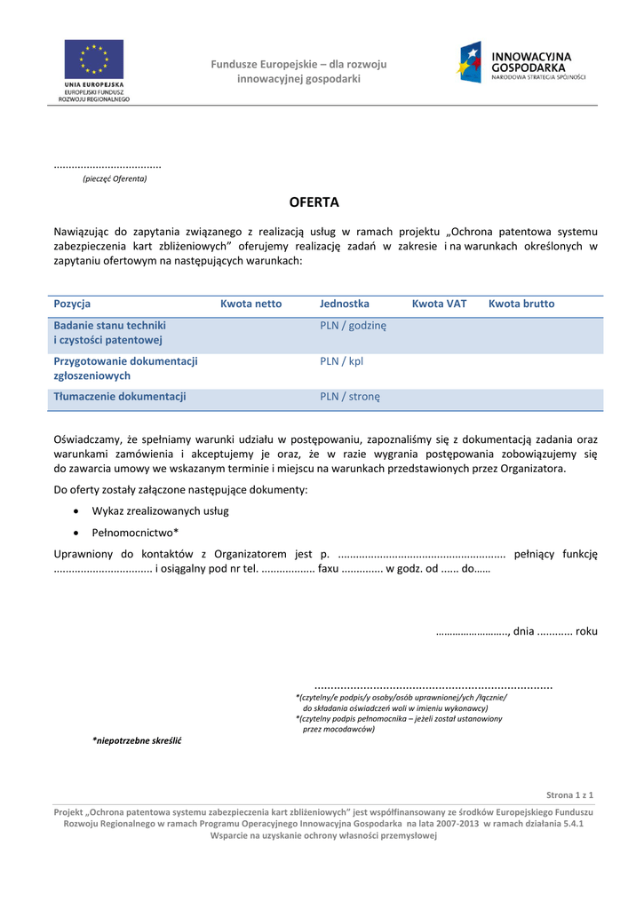 Fundusze Europejskie – dla rozwoju innowacyjnej gospodarki .................................... (pieczęć Oferenta) OFERTA Nawiązując do zapytania związanego z realizacją usług w ramach projektu „Ochrona patentowa systemu zabezpieczenia kart zbliżeniowych” oferujemy realizację zadań w zakresie i na warunkach określonych w zapytaniu ofertowym na następujących warunkach: Pozycja Kwota netto Jednostka Badanie stanu techniki i czystości patentowej PLN / godzinę Przygotowanie dokumentacji zgłoszeniowych PLN / kpl Tłumaczenie dokumentacji PLN / stronę Kwota VAT Kwota brutto Oświadczamy, że spełniamy warunki udziału w postępowaniu, zapoznaliśmy się z dokumentacją zadania oraz warunkami zamówienia i akceptujemy je oraz, że w razie wygrania postępowania zobowiązujemy się do zawarcia umowy we wskazanym terminie i miejscu na warunkach przedstawionych przez Organizatora. Do oferty zostały załączone następujące dokumenty: Wykaz zrealizowanych usług Pełnomocnictwo* Uprawniony do kontaktów z Organizatorem jest p. ........................................................ pełniący funkcję ................................. i osiągalny pod nr tel. .................. faxu .............. w godz. od ...... do…… …………………….., dnia ............ roku ......................................................................... *(czytelny/e podpis/y osoby/osób uprawnionej/ych /łącznie/ do składania oświadczeń woli w imieniu wykonawcy) *(czytelny podpis pełnomocnika – jeżeli został ustanowiony przez mocodawców) *niepotrzebne skreślić Strona 1 z 1 Projekt „Ochrona patentowa systemu zabezpieczenia kart zbliżeniowych” jest współfinansowany ze środków Europejskiego Funduszu Rozwoju Regionalnego w ramach Programu Operacyjnego Innowacyjna Gospodarka na lata 2007-2013 w ramach działania 5.4.1 Wsparcie na uzyskanie ochrony własności przemysłowej