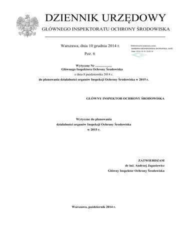 DZIENNIK URZĘDOWY GŁÓWNEGO INSPEKTORATU OCHRONY ŚRODOWISKA Warszawa, dnia 10 grudnia 2014 r. Elektronicznie podpisany przez: BARBARA NIEWIEROWSKA-SKORUPSKA; GIOŚ Data: 2014-12-10 12:02:14 Poz. 6 Wytyczne Nr .................... Głównego Inspektora Ochrony Środowiska z dnia 8 października 2014 r. do planowania działalności organów Inspekcji Ochrony Środowiska w 2015 r. GŁÓWNY INSPEKTOR OCHRONY ŚRODOWISKA Wytyczne do planowania działalności organów Inspekcji Ochrony Środowiska w 2015 r. ZATWIERDZAM dr inż. Andrzej Jagusiewicz Główny Inspektor Ochrony Środowiska Warszawa, październik 2014 r. Dziennik Urzędowy Głównego Inspektoratu Ochrony Środowiska– 2 – Poz. 6 Spis treści Strona I. Wstęp 3 II. Kontrola przestrzegania prawa o ochronie środowiska, nadzór rynku i przeciwdziałanie poważnym awariom 4 III. Transgraniczne przemieszczanie odpadów 8 IV. Monitoring środowiska 9 V. Upowszechnianie informacji o Inspekcji Ochrony Środowiska i stanie środowiska 12 VI. Modernizacja infrastruktury pomiarowej i informatycznej Inspekcji 13 VII. Współpraca z zagranicą 13 VIII. Zadania organizacyjne 14 Dziennik Urzędowy Głównego Inspektoratu Ochrony Środowiska– 3 – Poz. 6 Wstęp Wytyczne do planowania działalności organów Inspekcji w 2015 r. – podobnie jak w latach poprzednich – zawierają, wskazane do realizacji przez Głównego Inspektora Ochrony Środowiska, najważniejsze zadania ogólnokrajowe. Uwzględniają one zarówno istotne do podjęcia obowiązki Inspekcji wynikające z przepisów prawa, jak również z dokumentów strategicznych, takich jak: „Strategia Rozwoju Kraju”, „Strategia Bezpieczeństwo Energetyczne i Środowisko”. Wytyczne stanowią więc uszczegółowienie zadań jakie powinna podjąć Inspekcja w 2015 r. – w ostatnim roku realizacji zadań i celów określonych w dokumentach „Ogólne kierunki działania Inspekcji Ochrony Środowiska w latach 2013-2015” oraz w programie „Państwowego Monitoringu Środowiska w latach 2013-2015”. Wysiłek i zaangażowanie wszystkich organów Inspekcji w 2015 r. ukierunkowane zostaną na pełne wykonanie zadań w nich zawartych oraz na rzetelne rozliczenie się z efektów podjętych działań. I. Kontrola przestrzegania prawa o ochronie środowiska, nadzór rynku i przeciwdziałanie poważnym awariom Za najważniejsze zadania w 2015 r. w działalności kontrolnej uznaje się: - kontrolę wypełniania obowiązków wynikających z przepisów prawa, - przyspieszenie likwidacji „bomb ekologicznych” w świetle nowych priorytetów NFOŚiGW, - sporządzanie raportów i informacji. Główny Inspektor Ochrony Środowiska 1. Opracowanie wytycznych do przeprowadzania kontroli w zakresie: a) przestrzegania przepisów ustawy z dnia 13 września 1996 r. o utrzymaniu czystości i porządku w gminach aktualizacja wytycznych na podstawie analizy kontroli przeprowadzonych w 2014 r. – termin przygotowania do dnia 15 luty 2015 r. b) przestrzegania przepisów w zakresie gospodarowania odpadami oraz przepisów w zakresie emisji zanieczyszczeń do powietrza przez zarządzających spalarniami i współspalarniami odpadów – termin przygotowania do dnia 31 stycznia 2015 r. W przypadku, gdy w 2015 r. zostanie uchwalona ustawa o zmianie ustawy o lasach oraz niektórych innych ustaw, najpóźniej w terminie 2 miesięcy od daty jej uchwalenia zostaną opracowane wytyczne w zakresie spełniania wymagań określonych w rozporządzeniu PEiR (UE) Nr 995/2010 z 20.10.2010 r., ustanawiającego obowiązki podmiotów wprowadzających do obrotu drewno i produkty z drewna, wraz z aktami delegowanymi. 2. Opracowanie raportów, sprawozdań i informacji wymaganych przepisami prawa, takich jak: a) roczny raport, zawierający dane za rok 2013, w sprawie ustanowienia Europejskiego Rejestru Uwalniania i Transferu Zanieczyszczeń, zgodnie z Rozporządzeniem Parlamentu Europejskiego i Rady 166/2006 – przekazanie do KE do dnia 31 marca 2015 r., b) trzyletnie sprawozdanie z wdrażania dyrektywy 96/82/WE w sprawie kontroli niebezpieczeństwa poważnych awarii z udziałem substancji niebezpiecznych za lata 2012-2014 – przekazanie do Komisji Europejskiej do dnia 30 września 2015 r. c) raport w sprawie oceny stanu przestrzegania przepisów dotyczących substancji kontrolowanych w 2014 r. – przekazanie Ministrowi Środowiska do dnia 31 marca 2015 r., d) sprawozdanie z działalności kontrolnej wojewódzkich inspektoratów ochrony środowiska – formularz GUS OŚ-2b – przekazanie MF i NFOŚiGW sprawozdania za rok 2014 w części dotyczącej decyzji pieniężnych oraz podziału środków finansowych – w terminie do dnia 31 marca 2015 r. oraz przekazanie GUS pełnego sprawozdania za rok 2014 do dnia 27 czerwca 2015 r., e) raport z przeprowadzonej przez Inspekcję Ochrony Środowiska kontroli zawartości siarki w ciężkim oleju opałowym stosowanym w instalacjach energetycznego spalania paliw oraz w oleju do silników statków żeglugi śródlądowej, w 2014 r., – przekazanie Prezesowi Urzędu Ochrony Konkurencji i Konsumentów do dnia 30 kwietnia 2015 r., Dziennik Urzędowy Głównego Inspektoratu Ochrony Środowiska– 4 – Poz. 6 f) roczny raport za rok 2014 o funkcjonowaniu gospodarki bateriami i akumulatorami oraz zużytymi bateriami i zużytymi akumulatorami”, w tym informacje na temat osiągniętego poziomu zbierania oraz recyklingu – przekazanie Ministrowi Środowiska do dnia 15 maja 2015 r. g) raport o funkcjonowaniu systemu gospodarki zużytym sprzętem elektrycznym i elektronicznym w 2014 r. – przekazanie Ministrowi Środowiska do dnia 30 czerwca 2015 r., h) zbiorczy raport kontroli Inspekcji w 2014 r. w zakresie prac poszukiwawczo- rozpoznawczych gazu ze złóż niekonwencjonalnych. 3. Pozostałe raporty z kontroli dotyczące: a) realizacji w 2014 r. zadań własnych gminy w zakresie wynikającym z ustawy z dnia 13 września 1996 r. o utrzymaniu czystości i porządku w gminach – termin realiz