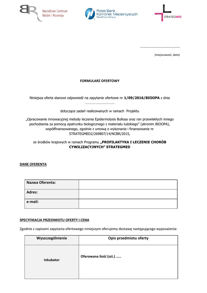 ……………………………………… (miejscowość, data) FORMULARZ OFERTOWY Niniejsza oferta stanowi odpowiedź na zapytanie ofertowe nr 1/09/2016/BIOOPA z dnia …………………………. dotyczące zadań realizowanych w ramach Projektu „Opracowanie innowacyjnej metody leczenia Epidermolysis Bullosa oraz ran przewlekłych innego pochodzenia za pomocą opatrunku biologicznego z materiału ludzkiego” (akronim BIOOPA), współfinansowanego, zgodnie z umową o wykonanie i finansowanie nr STRATEGMED2/269807/14/NCBR/2015, ze środków krajowych w ramach Programu „PROFILAKTYKA I LECZENIE CHORÓB CYWILIZACYJNYCH” STRATEGMED DANE OFERENTA Nazwa Oferenta: Adres: e-mail: SPECYFIKACJA PRZEDMIOTU OFERTY I CENA Zgodnie z zapisami zapytania ofertowego niniejszym oferujemy dostawę następującego wyposażenia: Wyszczególnienie Inkubator Opis przedmiotu oferty Oferowana ilość (szt.) …… Specyfikacja/ Wyposażenie zestawu/ Dokumentacja/ Szkolenia: lp. 1 2 3 4 5 6 7 8 9 10 11 12 13 14 15 16 17 18 19 20 21 22 23 Wyszczególnienie stelaż umożliwiający umycie inkubatora od spodu urządzenia drzwi podwójne, szczelnie zamykane drzwi zewnętrzne z regulacją temperatury grzania wewnętrzne drzwi szklane wskaźnik otwarcia drzwi wewnętrznych wnętrze komory wykonane ze stali nierdzewnej, nadające się do mycia alkoholem, gładkie powierzchnie, połączone bez szczelin wnętrze komory wykonane z zaokrąglonymi krawędziami czujniki umożliwiające utrzymanie we wnętrzu następujących parametrów: T=2537 ̊±0,4°C, CO2=5%, wilgotność do 95% (przy T=37 ̊C), poziom tlenu O2=5-20%± 0,5% urządzenie wyposażone w panel wyświetlający bieżące parametry wnętrza komory wysokosprawne filtry (średnica porów 03, um) na linii podającej CO2 i O2 oraz wysokosprawne filtry zapasowe (średnica porów 03, um) powietrze w komorze inkubatora powinno być ciągle filtrowane przez wysokosprawny filtr powietrza (średnica porów 0,3 um) z recyrkulacją z atmosfery izolacja termiczna komory inkubatora płaszcz powietrzny urządzenie wyposażone w moduł utrzymujący wilgotność we wnętrzu komory (bez tacy z wodą), woda powinna być dostarczana do komory inkubatora w postaci pary urządzenie wyposażone w moduł utrzymujący zadane stężenie O2 we wnętrzu komory regulacja CO2 w zakresie 0 – 20% z dokładnością +/- 0,1% regulacja O2 w zakresie 0,5 – 21% z dokładnością +/- 0,25% sterylizacja termiczna komory inkubatora w trybie suchym min. +145°C sterylizacja termiczna komory inkubatora w trybie wilgotnym min. +95°C zakres temperatur pracy: +5°C ponad temp. otoczenia do +55°C urządzenie wyposażone w dotykowy panel sterujący dokładność wyświetlania temperatury 0,1°C możliwość zmiany parametrów pracy urządzenia zabezpieczona hasłem możliwość podtrzymania wartości nastaw Tak/Nie 24 parametrów pracy w przypadku braku zasilania i automatyczne wznowienie pracy urządzenia po powrocie zasilania podłączenie inkubatora do zewnętrznego systemu BMS rejestrującego pracę następujących parametrów (temperatura, wilgotność, poziom CO2 i O2) system alarmów nieprawidłowej pracy z uwzględnieniem stanów alarmowych: .1. nieprawidłowa temperatura w komorze; .2. nieprawidłowy poziom O2, komorze; CO2 w 25 .3. nieprawidłowa wilgotność względna w komorze; .4. uszkodzenie czujników; .5. zanik napięcia zasilania; 26 27 28 29 30 31 32 lp. 1 2 3 urządzenie zainstalowane zgodnie z dokumentacją wg Aneksu 15 DPW z 2015r. (IQ i OQ, PQ) kopia certyfikatu: ISO 9001, CE lub deklaracja zgodności z normami EU (lub dokumenty równoważne) kopia certyfikatu dla wysokosprawnych filtrów powietrza o średnicy 0,3 um dokumentacja wg Aneksu 15 DPW z 2015r. (IQ i OQ, PQ) stały autoryzowany serwis gwarancyjny i pogwarancyjny przez minimum 10 lat od daty dostawy bezpłatne przeglądy w ilości i zakresie zgodnym z wymogami określonymi w dokumentacji technicznej łącznie z bezpłatną wymianą wszystkich części i materiałów eksploatacyjnych niezbędnych do wykonania przeglądu, obejmujące naprawy w pełnym zakresie zgodnie z kartą gwarancyjną; ostatni przegląd w ostatnim miesiącu gwarancji przeprowadzenie w miejscu wskazanym przez Zamawiającego bezpłatnego szkolenia dla personelu Zamawiającego w zakresie obsługi dostarczanych urządzeń Wyszczególnienie pojemność robocza komory inkubator dostarczony ze stelażem wykonanym ze stali nierdzewnej lub stali malowanej proszkowo o wysokości Liczba półek (na jeden inkubator) wykonanych ze stali nierdzewnej, j.m. l cm szt. Dane 4 5 6 7 8 9 10 z perforacjami zapewniającymi swobodny obieg gazu, wysuwanych czas powrotu parametrów powietrza w komorze po otwarciu drzwi inkubatora do czystości klasy ISO5 czas od zamknięcia drzwiczek wewnętrznych do powrotu do zaprogramowanych 5% CO2 czas od zamknięcia drzwiczek wewnętrznych do powrotu do zaprogramowanych 5% O2 czas od zamknięcia drzwiczek wewnętrznych do powrotu do zaprogramowanych 90% RH rejestracja parametrów hodowli (temperatura, stężenie CO2, O2 i RH) w okresie okres gwarancji rok produkcji min. min. min. min. min. m-ce rrrr Inne niż wskazane w opisie przedmiotu zamówienia parametry/ informacje: 1. … 2. … Wyszczególnienie/ Ilość [szt.] Inkubator/ …. szt. Cena Waluta Cena jednostkowa netto RAZEM cena netto RAZEM cena brutto INFORMACJA O TERMINIE WYKONANIA PRZEDMIOTU ZAMÓWIENIA Czas realizacji przedmiotu zamówienia wynosi ......... dni od dnia podpisania umowy. INFORMACJA O TERMINIE ZWIĄZANIA OFERTĄ Niniejsza oferta pozostaje ważna przez ……. dni od dnia jej złożenia. ZAŁĄCZNIKI 1. Oświadczenie o spełnieniu warunków udziału w postępowaniu …………….……………………………… (Imię, nazwisko, podpis, pieczątka)** ** Podpis osób upoważnionych do reprezentacji Oferenta