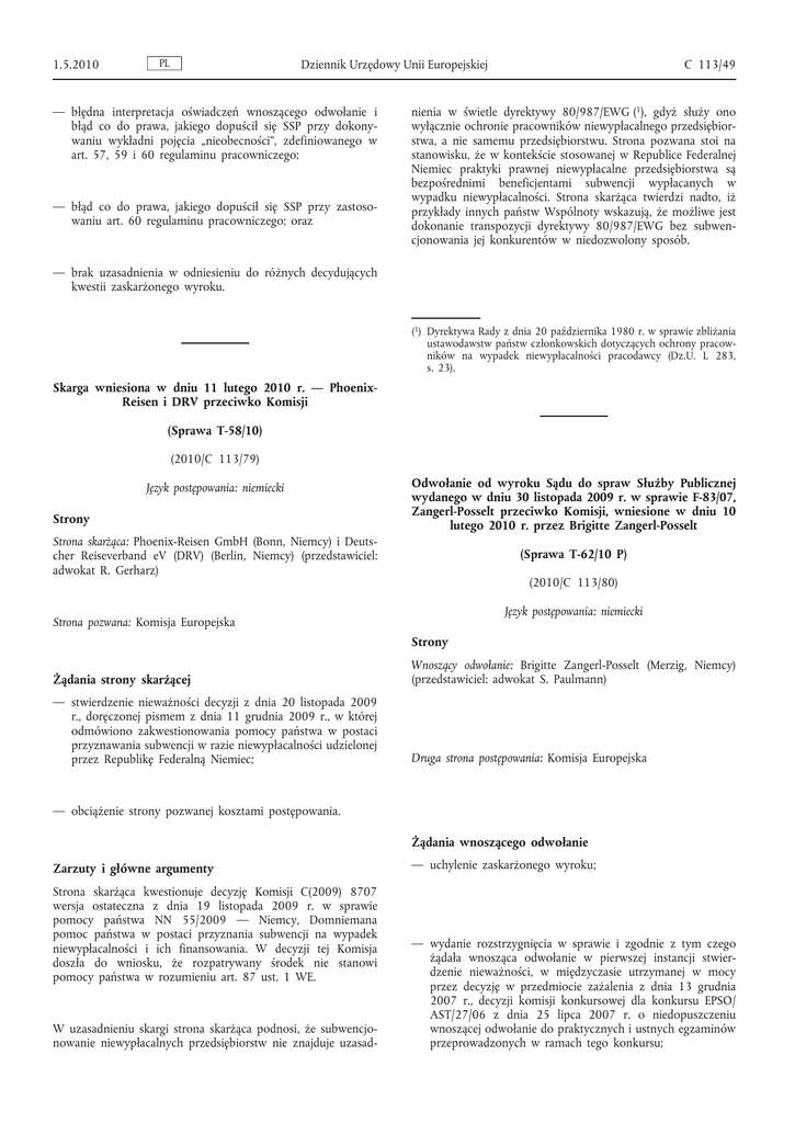 1.5.2010 PL Dziennik Urzędowy Unii Europejskiej — błędna interpretacja oświadczeń wnoszącego odwołanie i błąd co do prawa, jakiego dopuścił się SSP przy dokony waniu wykładni pojęcia „nieobecności”, zdefiniowanego w art. 57, 59 i 60 regulaminu pracowniczego; — błąd co do prawa, jakiego dopuścił się SSP przy zastoso waniu art. 60 regulaminu pracowniczego; oraz C 113/49 nienia w świetle dyrektywy 80/987/EWG (1), gdyż służy ono wyłącznie ochronie pracowników niewypłacalnego przedsiębior stwa, a nie samemu przedsiębiorstwu. Strona pozwana stoi na stanowisku, że w kontekście stosowanej w Republice Federalnej Niemiec praktyki prawnej niewypłacalne przedsiębiorstwa są bezpośrednimi beneficjentami subwencji wypłacanych w wypadku niewypłacalności. Strona skarżąca twierdzi nadto, iż przykłady innych państw Wspólnoty wskazują, że możliwe jest dokonanie transpozycji dyrektywy 80/987/EWG bez subwen cjonowania jej konkurentów w niedozwolony sposób. — brak uzasadnienia w odniesieniu do różnych decydujących kwestii zaskarżonego wyroku. (1) Dyrektywa Rady z dnia 20 października 1980 r. w sprawie zbliżania ustawodawstw państw członkowskich dotyczących ochrony pracow ników na wypadek niewypłacalności pracodawcy (Dz.U. L 283, s. 23). Skarga wniesiona w dniu 11 lutego 2010 r. — PhoenixReisen i DRV przeciwko Komisji (Sprawa T-58/10) (2010/C 113/79) Język postępowania: niemiecki Strony Odwołanie od wyroku Sądu do spraw Służby Publicznej wydanego w dniu 30 listopada 2009 r. w sprawie F-83/07, Zangerl-Posselt przeciwko Komisji, wniesione w dniu 10 lutego 2010 r. przez Brigitte Zangerl-Posselt Strona skarżąca: Phoenix-Reisen GmbH (Bonn, Niemcy) i Deuts cher Reiseverband eV (DRV) (Berlin, Niemcy) (przedstawiciel: adwokat R. Gerharz) (Sprawa T-62/10 P) (2010/C 113/80) Język postępowania: niemiecki Strona pozwana: Komisja Europejska Strony Żądania strony skarżącej Wnoszący odwołanie: Brigitte Zangerl-Posselt (Merzig, Niemcy) (przedstawiciel: adwokat S. Paulmann) — stwierdzenie nieważności decyzji z dnia 20 listopada 2009 r., doręczonej pismem z dnia 11 grudnia 2009 r., w której odmówiono zakwestionowania pomocy państwa w postaci przyznawania subwencji w razie niewypłacalności udzielonej przez Republikę Federalną Niemiec; Druga strona postępowania: Komisja Europejska — obciążenie strony pozwanej kosztami postępowania. Żądania wnoszącego odwołanie Zarzuty i główne argumenty Strona skarżąca kwestionuje decyzję Komisji C(2009) 8707 wersja ostateczna z dnia 19 listopada 2009 r. w sprawie pomocy państwa NN 55/2009 — Niemcy, Domniemana pomoc państwa w postaci przyznania subwencji na wypadek niewypłacalności i ich finansowania. W decyzji tej Komisja doszła do wniosku, że rozpatrywany środek nie stanowi pomocy państwa w rozumieniu art. 87 ust. 1 WE. W uzasadnieniu skargi strona skarżąca podnosi, że subwencjo nowanie niewypłacalnych przedsiębiorstw nie znajduje uzasad — uchylenie zaskarżonego wyroku; — wydanie rozstrzygnięcia w sprawie i zgodnie z tym czego żądała wnosząca odwołanie w pierwszej instancji stwier dzenie nieważności, w międzyczasie utrzymanej w mocy przez decyzję w przedmiocie zażalenia z dnia 13 grudnia 2007 r., decyzji komisji konkursowej dla konkursu EPSO/ AST/27/06 z dnia 25 lipca 2007 r. o niedopuszczeniu wnoszącej odwołanie do praktycznych i ustnych egzaminów przeprowadzonych w ramach tego konkursu;