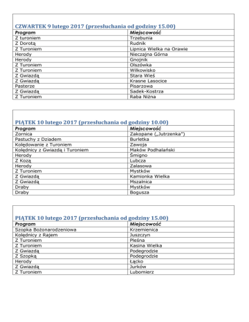 CZWARTEK 9 lutego 2017 (przesłuchania od godziny 15.00) Program Miejscowość Z turoniem Z Dorotą Z Turoniem Herody Herody Z Turoniem Z Turoniem Z Gwiazdą Z Gwiazdą Pasterze Z Gwiazdą Z Turoniem Trzebunia Rudnik Lipnica Wielka na Orawie Nieczajna Górna Gnojnik Olszówka Wilkowisko Stara Wieś Krasne Lasocice Pisarzowa Sadek-Kostrza Raba Niżna PIĄTEK 10 lutego 2017 (przesłuchania od godziny 10.00) Program Miejscowość Zornica Pastuchy z Dziadem Kolędowanie z Turoniem Kolędnicy z Gwiazdą i Turoniem Herody Z Kozą Herody Z Turoniem Z Gwiazdą Z Gwiazdą Draby Draby Zakopane („Jutrzenka”) Burletka Zawoja Maków Podhalański Śmigno Lubcza Zalasowa Mystków Kamionka Wielka Mszalnica Mystków Bogusza PIĄTEK 10 lutego 2017 (przesłuchania od godziny 15.00) Program Miejscowość Szopka Bożonarodzeniowa Kolędnicy z Rajem Z Turoniem Z Turoniem Z Gwiazdą Z Szopką Herody Z Gwiazdą Z Turoniem Krzemienica Juszczyn Pleśna Kasina Wielka Podegrodzie Podegrodzie Łącko Jurków Lubomierz SOBOTA 11 lutego 2017 (przesłuchania od godziny 10.00) Program Miejscowość Pasterze Herody Z Szopką Draby Herody Zespół „Regle” im. J. Jędrola Młode Misie Herody z Zielonek Herody z Brzuchani Kolędowanie Gazdowskie Kolędowanie z Gwiazdą i Kozą Kolędowanie Dziadów Noworocznych Kolędowanie Dziadów Noworocznych Koźlica Trojanowice Gwoździec Gwoździec Tomaszowice Poronin Niegowa Zielonki Brzuchania Istebna Milówka Cisiec Milówka