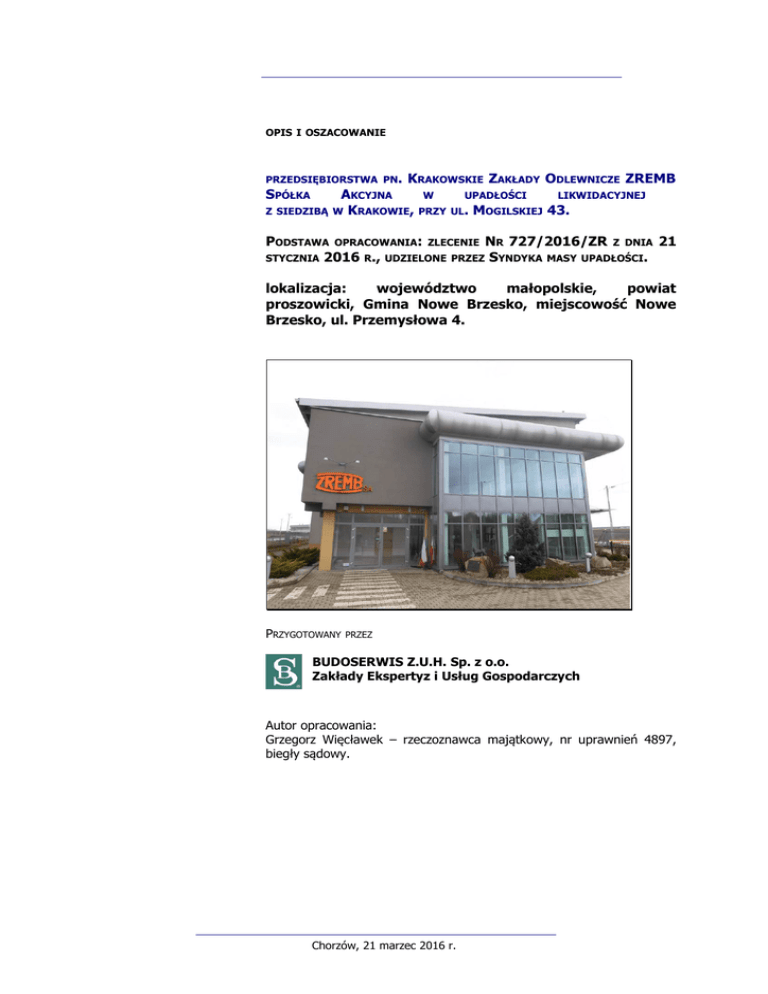 OPIS I OSZACOWANIE PRZEDSIĘBIORSTWA PN. SPÓŁKA KRAKOWSKIE ZAKŁADY ODLEWNICZE ZREMB AKCYJNA W UPADŁOŚCI LIKWIDACYJNEJ KRAKOWIE, PRZY UL. MOGILSKIEJ 43. Z SIEDZIBĄ W PODSTAWA OPRACOWANIA: ZLECENIE NR 727/2016/ZR Z DNIA 21 STYCZNIA 2016 R., UDZIELONE PRZEZ SYNDYKA MASY UPADŁOŚCI. lokalizacja: województwo małopolskie, powiat proszowicki, Gmina Nowe Brzesko, miejscowość Nowe Brzesko, ul. Przemysłowa 4. PRZYGOTOWANY PRZEZ BUDOSERWIS Z.U.H. Sp. z o.o. Zakłady Ekspertyz i Usług Gospodarczych Autor opracowania: Grzegorz Więcławek – rzeczoznawca majątkowy, nr uprawnień 4897, biegły sądowy. Chorzów, 21 marzec 2016 r. Opis i oszacowanie przedsiębiorstwa pn. Krakowskie Zakłady Odlewnicze ZREMB S.A. w upadłości likwidacyjnej z siedzibą w Krakowie Dokument z dnia: 21 marca 2016 r. SPIS TREŚCI WYCIĄG Z OPRACOWANIA................................................................................................................4 1. INFORMACJE WSTĘPNE....................................................................................................................5 1.1. 1.2. 1.3. 1.4. 1.5. PRZEDMIOT I ZAKRES OPRACOWANIA............................................................................................................5 CEL OPRACOWANIA.................................................................................................................................5 PODSTAWA FORMALNA OPRACOWANIA...........................................................................................................5 PODSTAWY MATERIALNO-PRAWNE OPRACOWANIA..............................................................................................5 DATA, NA KTÓRĄ DOKONANO OPISU I OSZACOWANIA.........................................................................................5 2. OPIS SPÓŁKI W UPADŁOŚCI..............................................................................................................6 2.1. 2.2. 2.3. 2.4. 2.4.1. 2.4.2. 2.4.3. 2.4.4. 2.4.5. 2.4.6. 2.4.7. 2.4.8. 2.5. 2.5.1. 2.5.2. 2.5.3. 2.5.4. 2.6. 2.6.1. 2.7. 2.7.1. 2.7.2. 2.7.3. 2.7.4. 2.8. 2.8.1. 2.8.2. 2.8.3. 2.9. OGÓLNA CHARAKTERYSTYKA SPÓŁKI.............................................................................................................6 DANE IDENTYFIKUJĄCE JEDNOSTKĘ..............................................................................................................7 PODSTAWY PRAWNE DZIAŁALNOŚCI..............................................................................................................8 MAJĄTEK SPÓŁKI – AKTYWA TRWAŁE.........................................................................................................10 WARTOŚCI NIEMATERIALNE I PRAWNE......................................................................................................10 NIERUCHOMOŚCI - GRUNTY...................................................................................................................12 BUDYNKI........................................................................................................................................13 BUDOWLE.......................................................................................................................................13 INNE RZECZOWE AKTYWA TRWAŁE...........................................................................................................14 NALEŻNOŚCI DŁUGOTERMINOWE.............................................................................................................14 INWESTYCJE DŁUGOTERMINOWE.............................................................................................................15 DŁUGOTERMINOWE ROZLICZENIA MIĘDZYOKRESOWE......................................................................................15 MAJĄTEK SPÓŁKI – AKTYWA OBROTOWE.....................................................................................................15 ZAPASY..........................................................................................................................................15 NALEŻNOŚCI KRÓTKOTERMINOWE............................................................................................................15 INWESTYCJE KRÓTKOTERMINOWE............................................................................................................16 KRÓTKOTERMINOWE ROZLICZENIA MIĘDZYOKRESOWE.....................................................................................16 MAJĄTEK SPÓŁKI – POZOSTAŁE AKTYWA I OBCIĄŻENIA.....................................................................................16 LEASING.........................................................................................................................................16 OGRANICZONE PRAWA RZECZOWE..............................................................................................................16 HIPOTEKA.......................................................................................................................................16 SŁUŻEBNOŚCI...................................................................................................................................17 ZASTAWY....................................................................................................................................... 17 INNE OGRANICZONE PRAWA RZECZOWE.....................................................................................................17 PRAWA ZOBOWIĄZANIOWE......................................................................................................................17 NAJEM / DZIERŻAWA..........................................................................................................................17 PRZEWŁASZCZENIE NA ZABEZPIECZENIE.....................................................................................................18 INNE PRAWA ZOBOWIĄZANIOWE....................