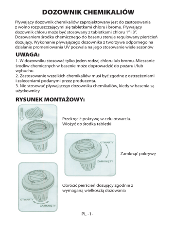 DOZOWNIK CHEMIKALIÓW Pływający dozownik chemikaliów zaprojektowany jest do zastosowania z wolno rozpuszczającymi się tabletkami chloru i bromu. Pływający dozownik chloru może być stosowany z tabletkami chloru 1” i 3”. Dozowaniem środka chemicznego do basenu steruje regulowany pierścień dozujący. Wykonanie pływającego dozownika z tworzywa odpornego na dzialanie promeniowania UV pozwala na jego stosowanie wiele sezonów UWAGA: 1. W dozowniku stosować tylko jeden rodzaj chloru lub bromu. Mieszanie środkw chemicznych w basenie może doprowadzić do pożaru i/lub wybuchu. 2. Zastosowanie wszelkich chemikaliów musi być zgodne z ostrzeżeniami i zaleceniami podanymi przez producenta. 3. Nie stosować pływającego dozownika chemikaliów, kiedy w basenia są użytkownicy RYSUNEK MONTAŻOWY: Przekręcić pokrywę w celu otwarcia. Włożyć do środka tabletki Zamknąć pokrywę Obrócić pierścień dozujący zgodnie z wymaganą wielkością dozowania PL -1-