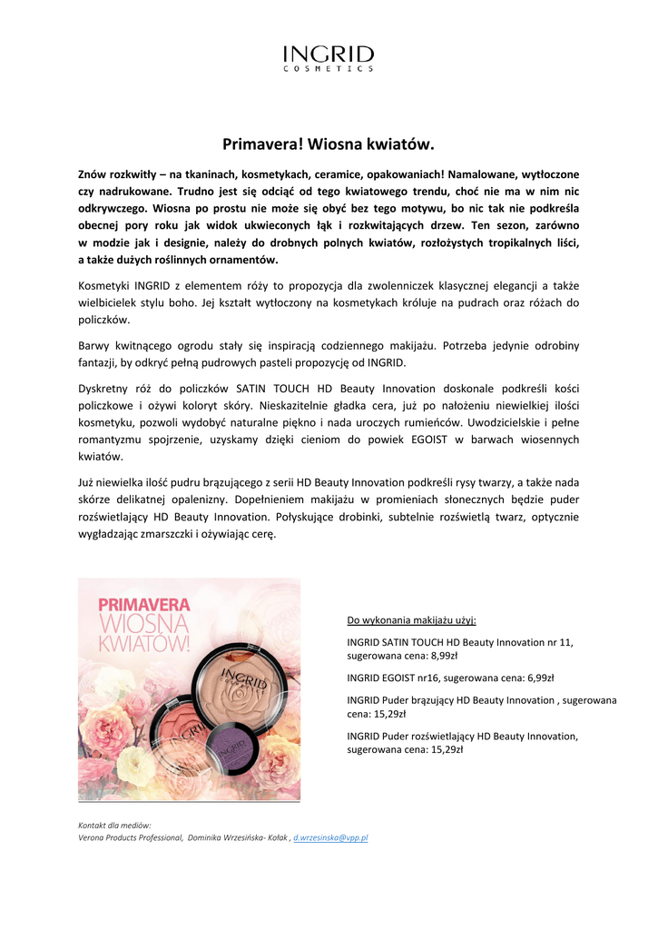 Primavera! Wiosna kwiatów. Znów rozkwitły – na tkaninach, kosmetykach, ceramice, opakowaniach! Namalowane, wytłoczone czy nadrukowane. Trudno jest się odciąć od tego kwiatowego trendu, choć nie ma w nim nic odkrywczego. Wiosna po prostu nie może się obyć bez tego motywu, bo nic tak nie podkreśla obecnej pory roku jak widok ukwieconych łąk i rozkwitających drzew. Ten sezon, zarówno w modzie jak i designie, należy do drobnych polnych kwiatów, rozłożystych tropikalnych liści, a także dużych roślinnych ornamentów. Kosmetyki INGRID z elementem róży to propozycja dla zwolenniczek klasycznej elegancji a także wielbicielek stylu boho. Jej kształt wytłoczony na kosmetykach króluje na pudrach oraz różach do policzków. Barwy kwitnącego ogrodu stały się inspiracją codziennego makijażu. Potrzeba jedynie odrobiny fantazji, by odkryć pełną pudrowych pasteli propozycję od INGRID. Dyskretny róż do policzków SATIN TOUCH HD Beauty Innovation doskonale podkreśli kości policzkowe i ożywi koloryt skóry. Nieskazitelnie gładka cera, już po nałożeniu niewielkiej ilości kosmetyku, pozwoli wydobyć naturalne piękno i nada uroczych rumieńców. Uwodzicielskie i pełne romantyzmu spojrzenie, uzyskamy dzięki cieniom do powiek EGOIST w barwach wiosennych kwiatów. Już niewielka ilość pudru brązującego z serii HD Beauty Innovation podkreśli rysy twarzy, a także nada skórze delikatnej opalenizny. Dopełnieniem makijażu w promieniach słonecznych będzie puder rozświetlający HD Beauty Innovation. Połyskujące drobinki, subtelnie rozświetlą twarz, optycznie wygładzając zmarszczki i ożywiając cerę. Do wykonania makijażu użyj: INGRID SATIN TOUCH HD Beauty Innovation nr 11, sugerowana cena: 8,99zł INGRID EGOIST nr16, sugerowana cena: 6,99zł INGRID Puder brązujący HD Beauty Innovation , sugerowana cena: 15,29zł INGRID Puder rozświetlający HD Beauty Innovation, sugerowana cena: 15,29zł Kontakt dla mediów: Verona Products Professional, Dominika Wrzesińska- Kołak , [email protected]