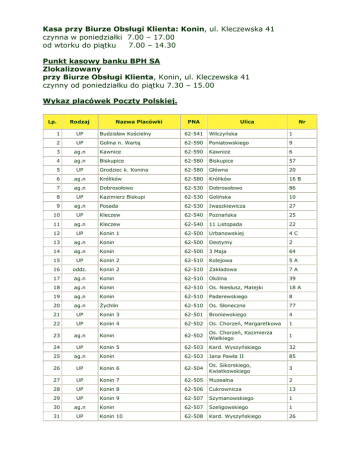 Kasa przy Biurze Obsługi Klienta: Konin, ul. Kleczewska 41 czynna w poniedziałki 7.00 – 17.00 od wtorku do piątku 7.00 – 14.30 Punkt kasowy banku BPH SA Zlokalizowany przy Biurze Obsługi Klienta, Konin, ul. Kleczewska 41 czynny od poniedziałku do piątku 7.30 – 15.00 Wykaz placówek Poczty Polskiej. Lp. Rodzaj Nazwa Placówki PNA Ulica Nr 1 UP Budzisław Kościelny 62-541 Wilczyńska 1 2 UP Golina n. Wartą 62-590 Poniatowskiego 9 3 ag.n Kawnice 62-590 Kawnice 6 4 ag.n Biskupice 62-580 Biskupice 57 5 UP Grodziec k. Konina 62-580 Główna 20 6 ag.n Królików 62-580 Królików 16 B 7 ag.n Dobrosołowo 62-530 Dobrosołowo 86 8 UP Kazimierz Biskupi 62-530 Golińska 10 9 ag.n Posada 62-530 Iwaszkiewicza 27 10 UP Kleczew 62-540 Poznańska 25 11 ag.n Kleczew 62-540 11 Listopada 22 12 UP Konin 1 62-500 Urbanowskiej 4C 13 ag.n Konin 62-500 Deotymy 2 14 ag.n Konin 62-500 3 Maja 64 15 UP Konin 2 62-510 Kolejowa 5A 16 oddz. Konin 2 62-510 Zakładowa 7A 17 ag.n Konin 62-510 Okólna 39 18 ag.n Konin 62-510 Os. Niesłusz, Matejki 18 A 19 ag.n Konin 62-510 Paderewskiego 8 20 ag.n śychlin 62-510 Os. Słoneczne 77 21 UP Konin 3 62-501 Broniewskiego 4 22 UP Konin 4 62-502 Os. Chorzeń, Margaretkowa 1 23 ag.n Konin 62-502 Os. Chorzeń, Kazimierza Wielkiego 1 24 UP Konin 5 62-503 Kard. Wyszyńskiego 32 25 ag.n Konin 62-503 Jana Pawła II 85 26 UP Konin 6 62-504 Os. Sikorskiego, Kwiatkowskiego 3 27 UP Konin 7 62-505 Muzealna 2 28 UP Konin 8 62-506 Cukrownicza 13 29 UP Konin 9 62-507 Szymanowskiego 1 30 ag.n Konin 62-507 Szeligowskiego 1 31 UP Konin 10 62-508 Kard. Wyszyńskiego 26 32 UP Kramsk 62-511 Wojska Polskiego 6 33 ag.n Wysokie k. Konina 62-511 Wysokie 0 34 ag.n Brzeźno 62-513 Główna 26 35 UP Krzymów 62-513 Główna 51 36 ag.n Grochowy 62-570 Grochowy 6 37 ag.n Kuchary Kościelne 62-570 Kuchary Kościelne 0 38 UP Rychwał k. Konina 62-570 Sportowa 1A 39 UP Rzgów k. Konina 62-586 Konińska 8 40 ag.n Sławsk 62-586 Sławsk 151 41 UP Skulsk 62-560 Targowa 2 42 ag.n Lisiec Wielki 62-571 Lisiec Wielki 37 A 43 UP Stare Miasto 62-571 Główna 9 44 oddz. Stare Miasto 62-571 Modła Królewska, Skandynawska 5 45 UP Stary Licheń 62-563 Klasztorna 3 46 ag.n OstrowąŜ 62-561 OstrowąŜ 30 47 ag.n Piotrkowice 62-561 Piotrkowice 9 48 UP Ślesin k. Konina 62-561 Kleczewska 14 49 UP Wilczyn 62-550 Rynek 12 • • UP - Urząd Pocztowy ag.n - Agencja Pocztowa Wykaz pozostałych placówek: 1. Gospodarczy Bank Wielkopolski SA, Oddział w Koninie, ul. Bankowa 1. 2. Bank Spółdzielczy w Kleczewie, Kleczew, ul. Wodna 2. 3. Bank Spółdzielczy w Ślesinie, Ślesin, Pl. Wolności 14. 4. Ludowy Bank Spółdzielczy w Strzałkowie, Oddział w Rzgowie, ul. Konińska 10. 5. Bank Spółdzielczy w Koninie: • Konin, ul. 3 Maja 68, • Oddział Golina, ul. StraŜacka 5, • Oddział Rychwał, ul. Kaliska 3 A.