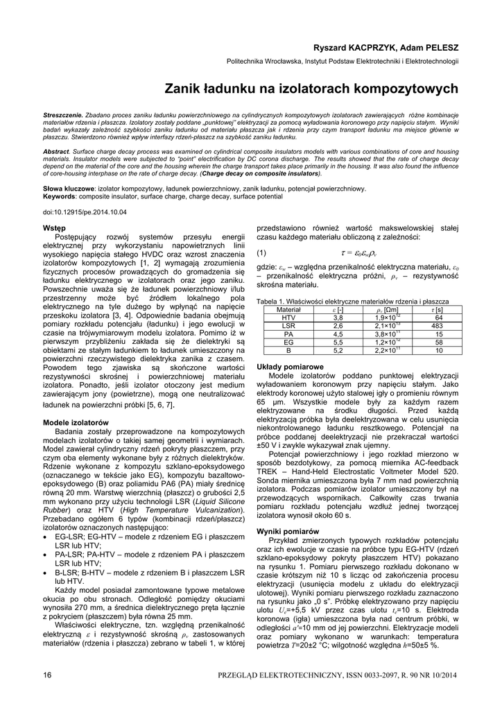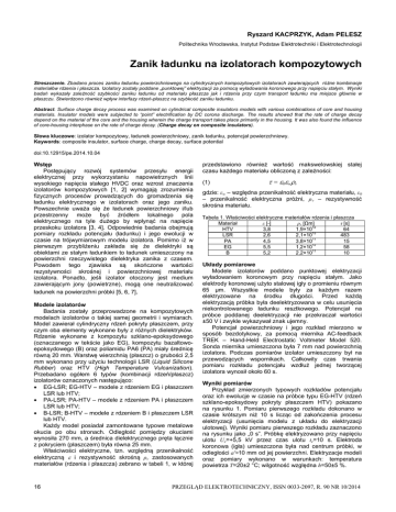 Ryszard KACPRZYK, Adam PELESZ Politechnika Wrocławska, Instytut Podstaw Elektrotechniki i Elektrotechnologii Zanik ładunku na izolatorach kompozytowych Streszczenie. Zbadano proces zaniku ładunku powierzchniowego na cylindrycznych kompozytowych izolatorach zawierających różne kombinacje materiałów rdzenia i płaszcza. Izolatory zostały poddane „punktowej” elektryzacji za pomocą wyładowania koronowego przy napięciu stałym. Wyniki badań wykazały zależność szybkości zaniku ładunku od materiału płaszcza jak i rdzenia przy czym transport ładunku ma miejsce głównie w płaszczu. Stwierdzono również wpływ interfazy rdzeń-płaszcz na szybkość zaniku ładunku. Abstract. Surface charge decay process was examined on cylindrical composite insulators models with various combinations of core and housing materials. Insulator models were subjected to “point” electrification by DC corona discharge. The results showed that the rate of charge decay depend on the material of the core and the housing wherein the charge transport takes place primarily in the housing. It was also found the influence of core-housing interphase on the rate of charge decay. (Charge decay on composite insulators). Słowa kluczowe: izolator kompozytowy, ładunek powierzchniowy, zanik ładunku, potencjał powierzchniowy. Keywords: composite insulator, surface charge, charge decay, surface potential doi:10.12915/pe.2014.10.04 Wstęp Postępujący rozwój systemów przesyłu energii elektrycznej przy wykorzystaniu napowietrznych linii wysokiego napięcia stałego HVDC oraz wzrost znaczenia izolatorów kompozytowych [1, 2] wymagają zrozumienia fizycznych procesów prowadzących do gromadzenia się ładunku elektrycznego w izolatorach oraz jego zaniku. Powszechnie uważa się że ładunek powierzchniowy i/lub przestrzenny może być źródłem lokalnego pola elektrycznego na tyle dużego by wpłynąć na napięcie przeskoku izolatora [3, 4]. Odpowiednie badania obejmują pomiary rozkładu potencjału (ładunku) i jego ewolucji w czasie na trójwymiarowym modelu izolatora. Pomimo iż w pierwszym przybliżeniu zakłada się że dielektryki są obiektami ze stałym ładunkiem to ładunek umieszczony na powierzchni rzeczywistego dielektryka zanika z czasem. Powodem tego zjawiska są skończone wartości rezystywności skrośnej i powierzchniowej materiału izolatora. Ponadto, jeśli izolator otoczony jest medium zawierającym jony (powietrzne), mogą one neutralizować ładunek na powierzchni próbki [5, 6, 7]. Modele izolatorów Badania zostały przeprowadzone na kompozytowych modelach izolatorów o takiej samej geometrii i wymiarach. Model zawierał cylindryczny rdzeń pokryty płaszczem, przy czym oba elementy wykonane były z różnych dielektryków. Rdzenie wykonane z kompozytu szklano-epoksydowego (oznaczanego w tekście jako EG), kompozytu bazaltowoepoksydowego (B) oraz poliamidu PA6 (PA) miały średnicę równą 20 mm. Warstwę wierzchnią (płaszcz) o grubości 2,5 mm wykonano przy użyciu technologii LSR (Liquid Silicone Rubber) oraz HTV (High Temperature Vulcanization). Przebadano ogółem 6 typów (kombinacji rdzeń/płaszcz) izolatorów oznaczonych następująco: EG-LSR; EG-HTV – modele z rdzeniem EG i płaszczem LSR lub HTV; PA-LSR; PA-HTV – modele z rdzeniem PA i płaszczem LSR lub HTV; B-LSR; B-HTV – modele z rdzeniem B i płaszczem LSR lub HTV. Każdy model posiadał zamontowane typowe metalowe okucia po obu stronach. Odległość pomiędzy okuciami wynosiła 270 mm, a średnica dielektrycznego pręta łącznie z pokryciem (płaszczem) była równa 25 mm. Właściwości elektryczne, tzn. względną przenikalność elektryczną i rezystywność skrośną ρv zastosowanych materiałów (rdzenia i płaszcza) zebrano w tabeli 1, w której 16 przedstawiono również wartość makswelowskiej stałej czasu każdego materiału obliczoną z zależności: (1) = 0wv gdzie: εw – względna przenikalność elektryczna materiału, ε0 – przenikalność elektryczna próżni, ρv – rezystywność skrośna materiału. Tabela 1. Właściwości elektryczne materiałów rdzenia i płaszcza ε [-] ρv [Ωm] τ [s] Materiał 12 HTV 3,8 1,9×10 64 13 LSR 2,6 2,1×10 483 11 PA 4,5 3,8×10 15 12 EG 5,5 1,2×10 58 11 B 5,2 2,2×10 10 Układy pomiarowe Modele izolatorów poddano punktowej elektryzacji wyładowaniem koronowym przy napięciu stałym. Jako elektrody koronowej użyto stalowej igły o promieniu równym 65 μm. Wszystkie modele były za każdym razem elektryzowane na środku długości. Przed każdą elektryzacją próbka była deelektryzowana w celu usunięcia niekontrolowanego ładunku resztkowego. Potencjał na próbce poddanej deelektryzacji nie przekraczał wartości ±50 V i zwykle wykazywał znak ujemny. Potencjał powierzchniowy i jego rozkład mierzono w sposób bezdotykowy, za pomocą miernika AC-feedback TREK – Hand-Held Electrostatic Voltmeter Model 520. Sonda miernika umieszczona była 7 mm nad powierzchnią izolatora. Podczas pomiarów izolator umieszczony był na przewodzących wspornikach. Całkowity czas trwania pomiaru rozkładu potencjału wzdłuż jednej tworzącej izolatora wynosił około 60 s. Wyniki pomiarów Przykład zmierzonych typowych rozkładów potencjału oraz ich ewolucje w czasie na próbce typu EG-HTV (rdzeń szklano-epoksydowy pokryty płaszczem HTV) pokazano na rysunku 1. Pomiaru pierwszego rozkładu dokonano w czasie krótszym niż 10 s licząc od zakończenia procesu elektryzacji (usunięcia modelu z układu do elektryzacji ulotowej). Wyniki pomiaru pierwszego rozkładu zaznaczono na rysunku jako „0 s”. Próbkę elektryzowano przy napięciu ulotu Ue=+5,5 kV przez czas ulotu te=10 s. Elektroda koronowa (igła) umieszczona była nad centrum próbki, w odległości a'=10 mm od jej powierzchni. Elektryzacje modeli oraz pomiary wykonano w warunkach: temperatura powietrza T=20±2 °C; wilgotność względna h=50±5 %. PRZEGLĄD ELEKTROTECHNICZNY, ISS