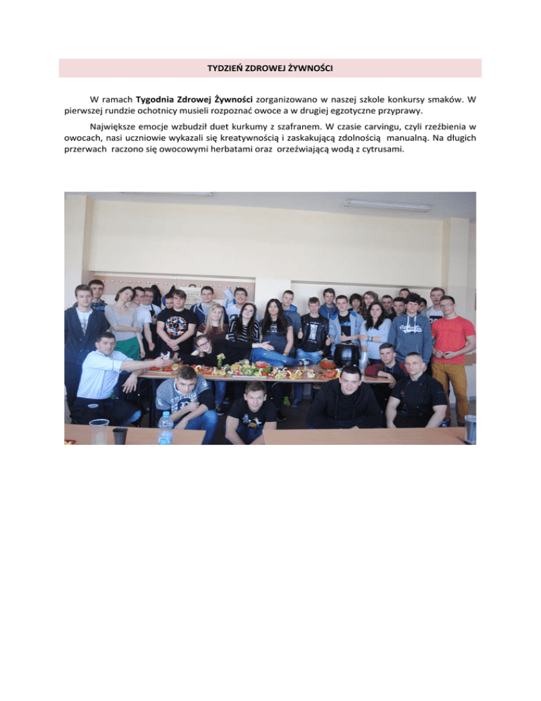 TYDZIEŃ ZDROWEJ ŻYWNOŚCI W ramach Tygodnia Zdrowej Żywności zorganizowano w naszej szkole konkursy smaków. W pierwszej rundzie ochotnicy musieli rozpoznać owoce a w drugiej egzotyczne przyprawy. Największe emocje wzbudził duet kurkumy z szafranem. W czasie carvingu, czyli rzeźbienia w owocach, nasi uczniowie wykazali się kreatywnością i zaskakującą zdolnością manualną. Na długich przerwach raczono się owocowymi herbatami oraz orzeźwiającą wodą z cytrusami.